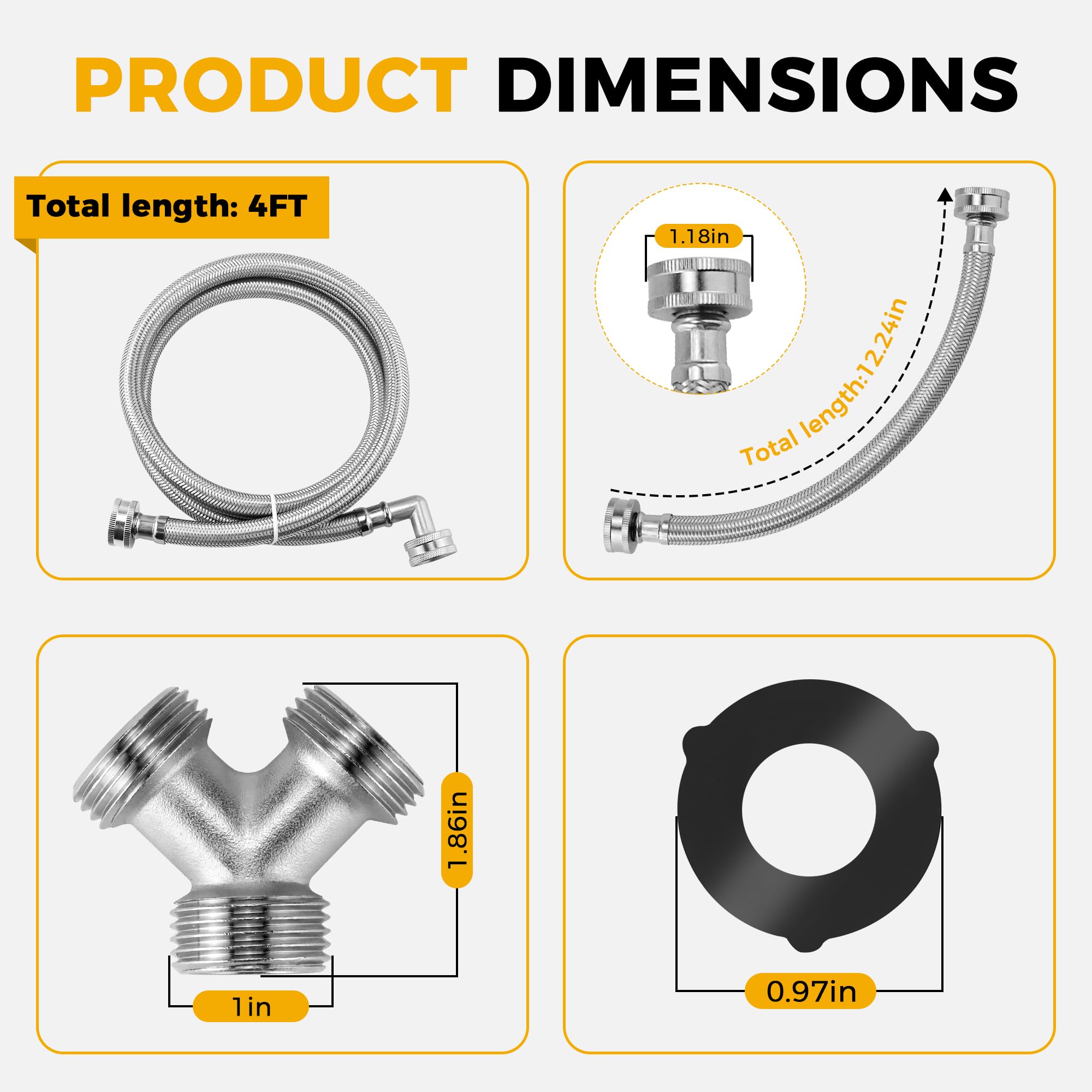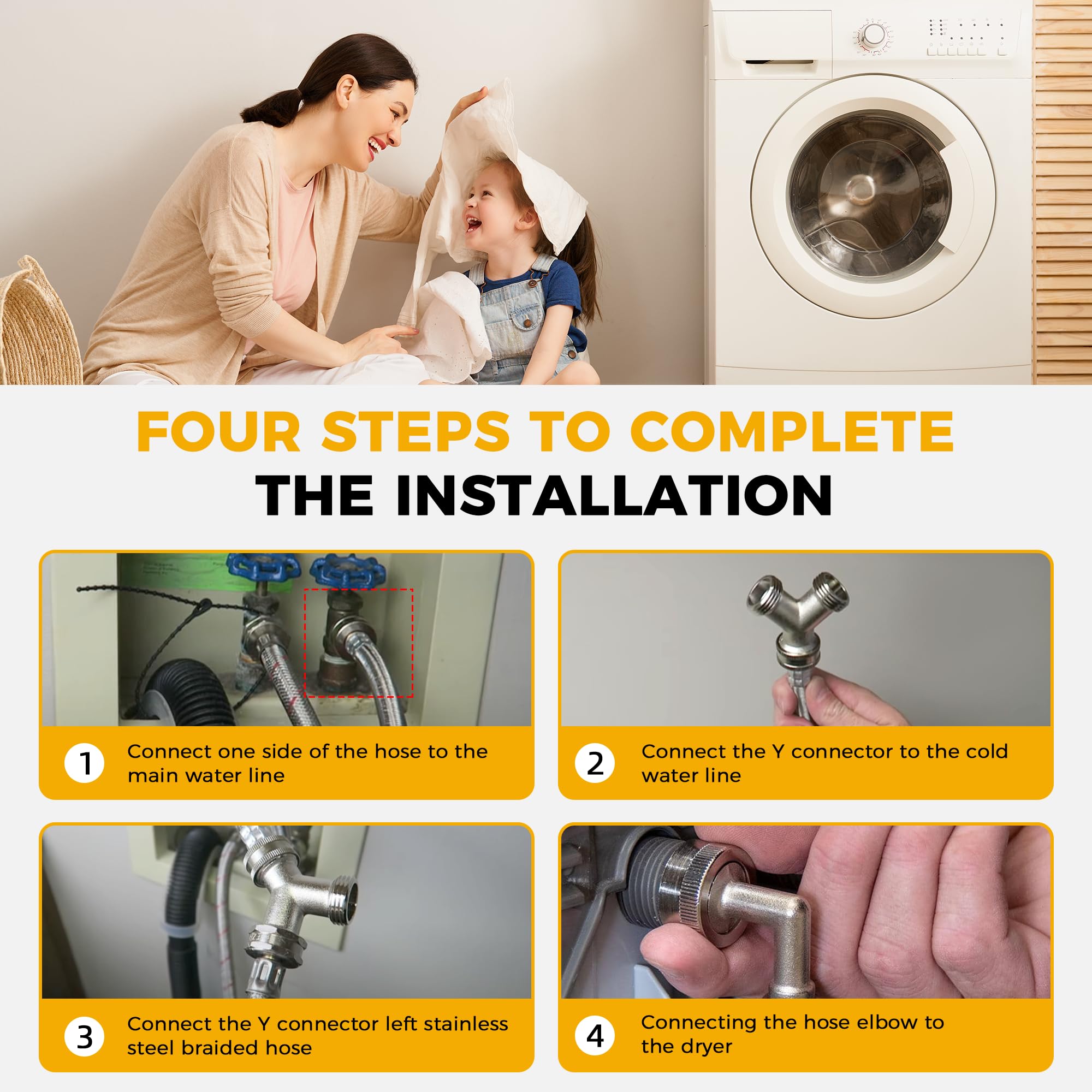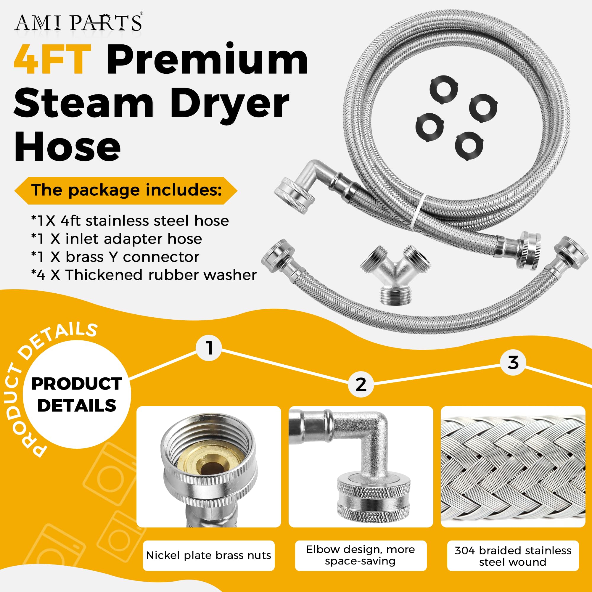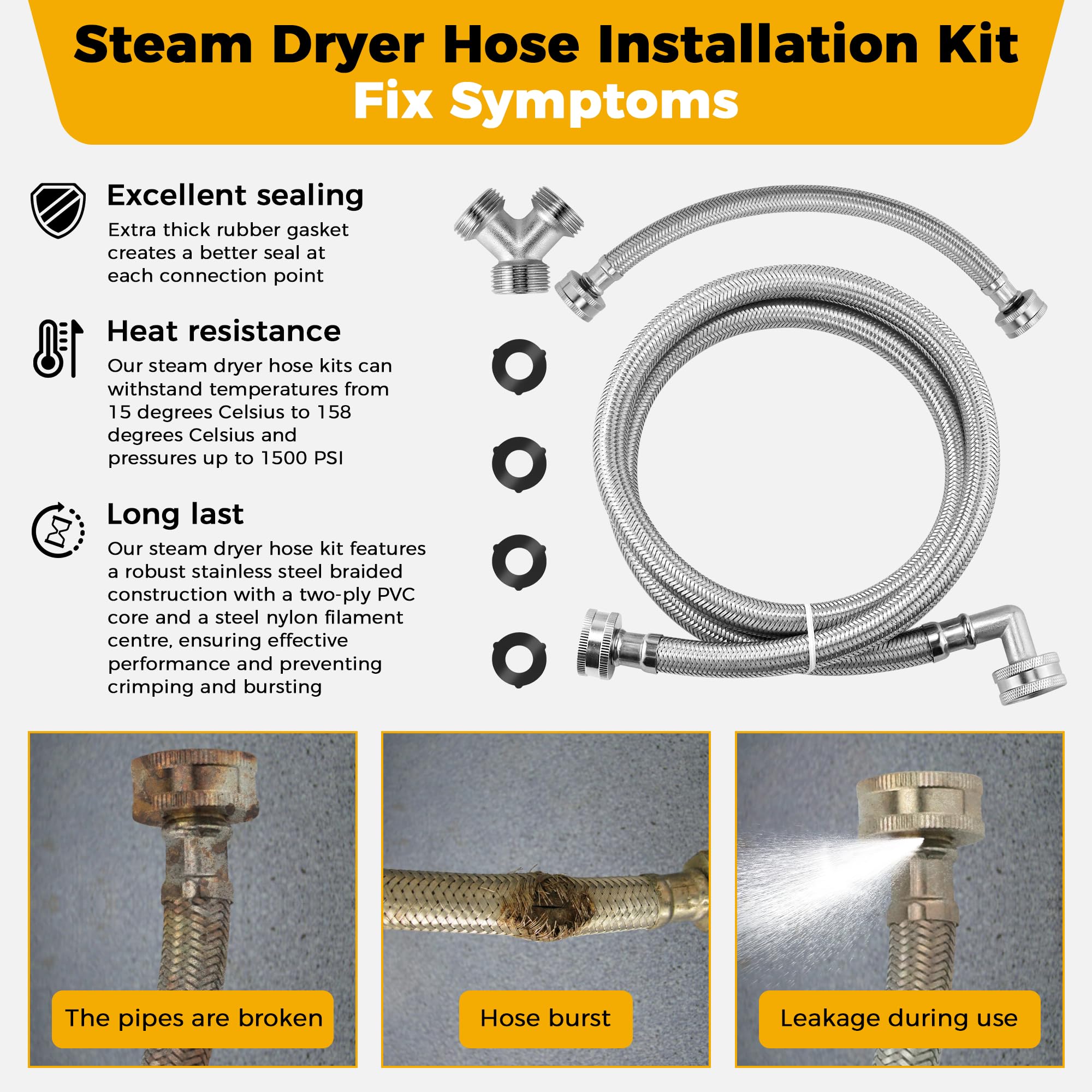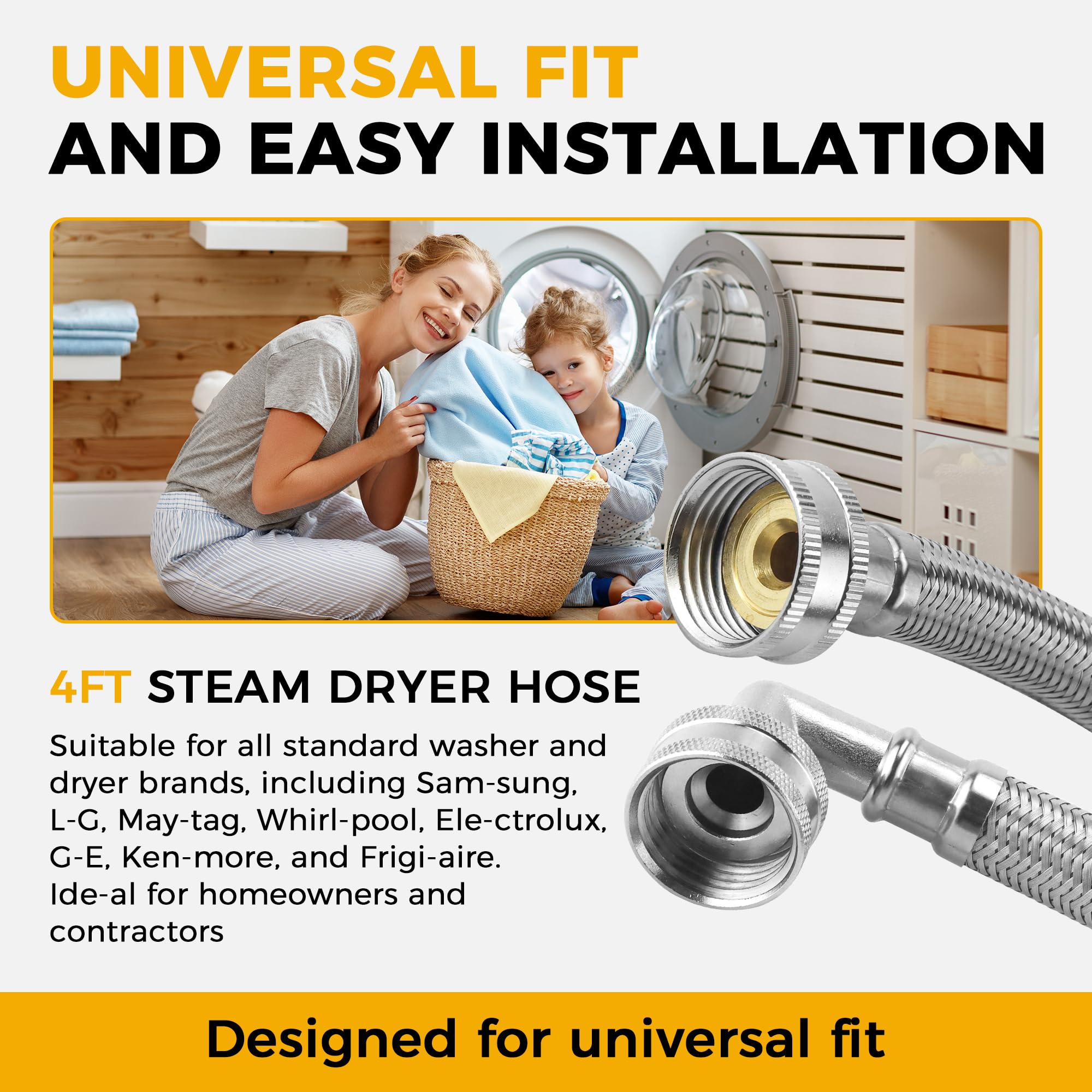 [STEAM DRYER HOSE INSTALLATION KIT]: Includes 1 x 4 Ft stainless steel 304 hose (3/4 inch FHT connection) with 90 Degree "Space Saver" elbow elbow, 1 x brass Y connector and 4 x rubber washers.4 ft steam dryer hose with 90-deg elbow ensures easy installation in tight spaces and helps prevent kinking. Rubber washers prevent leaks from occurring. This is a premium steam dryer hose kit that includes everything you need to install your steam dryer
