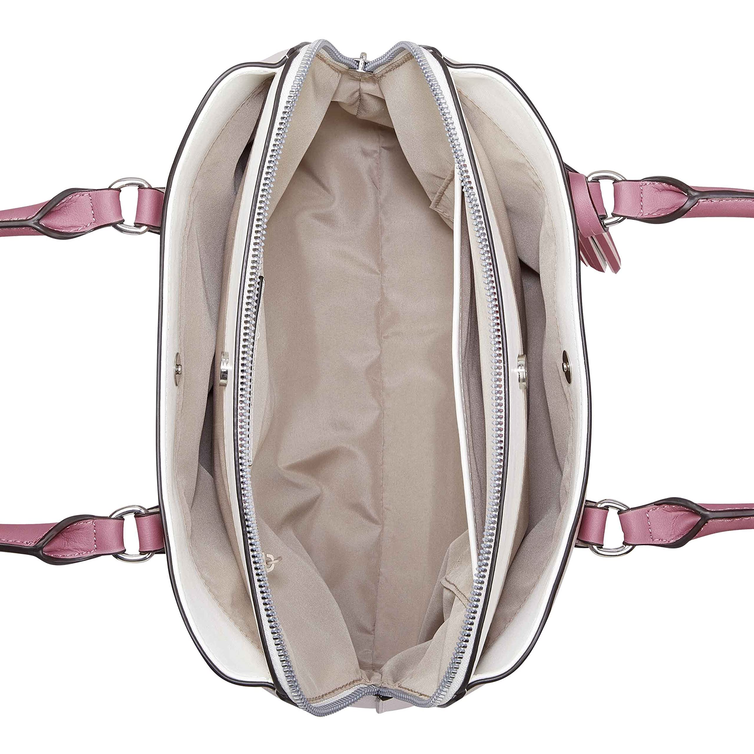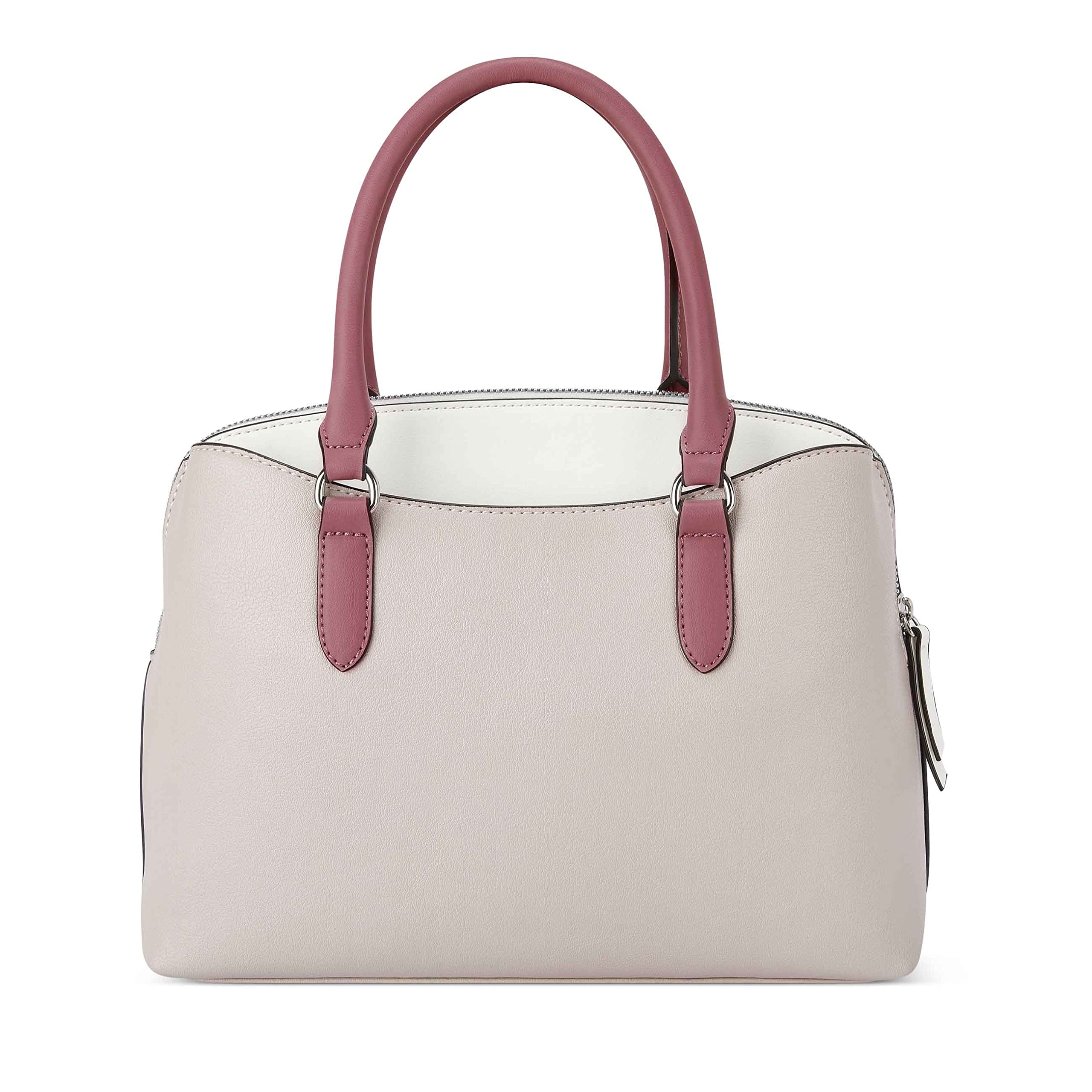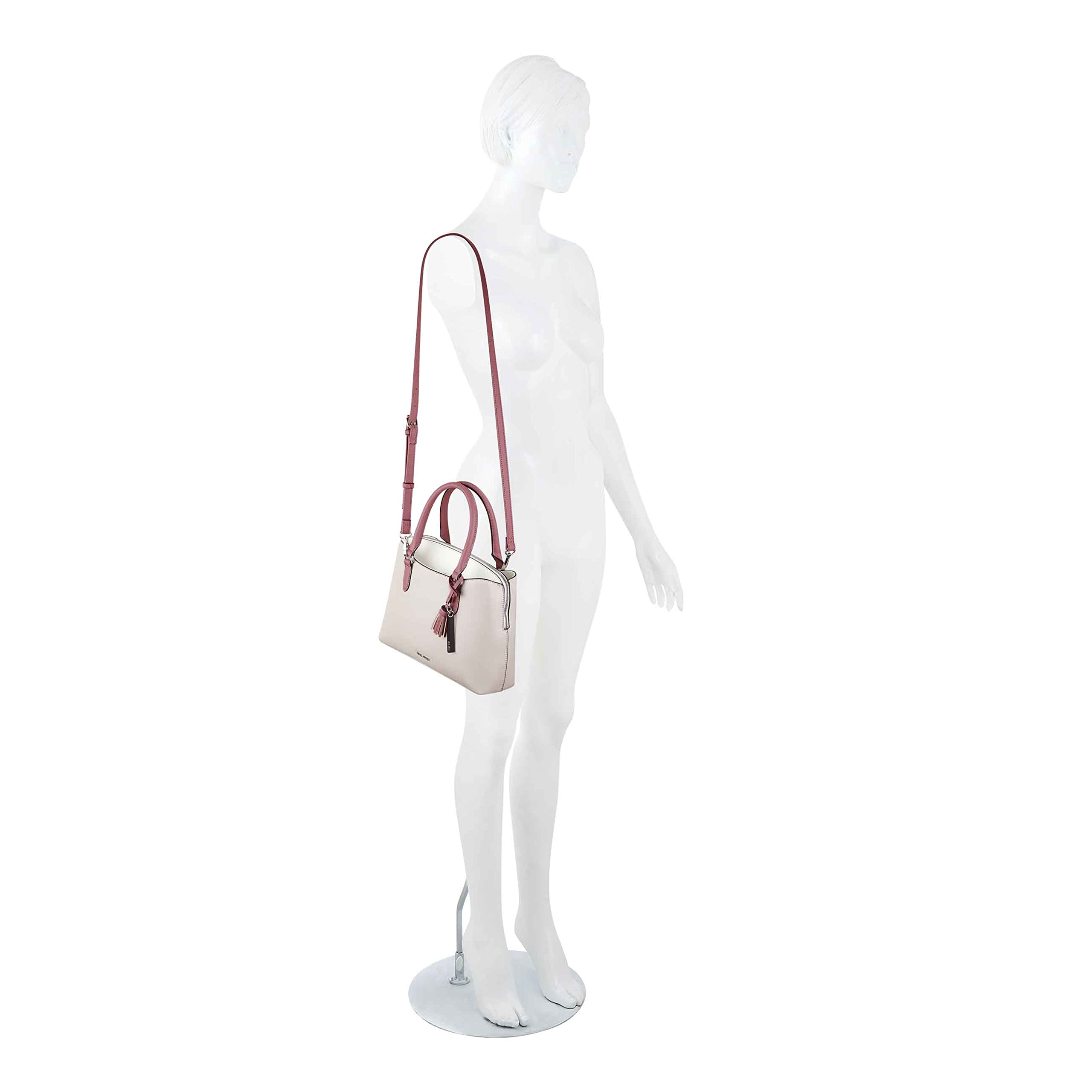 Description Get spacious comfort and an elevated style carrying the Nine West Galla Dome Satchel Bag. PVC construction. Top carry handles. Removable crossbody strap. One zippered exterior pocket. One interior front wall slip pocket. Two exterior compartments with snap closure. Accentuated with an eye-catching dangle. Brand name hardware on the front. Polyester lining.