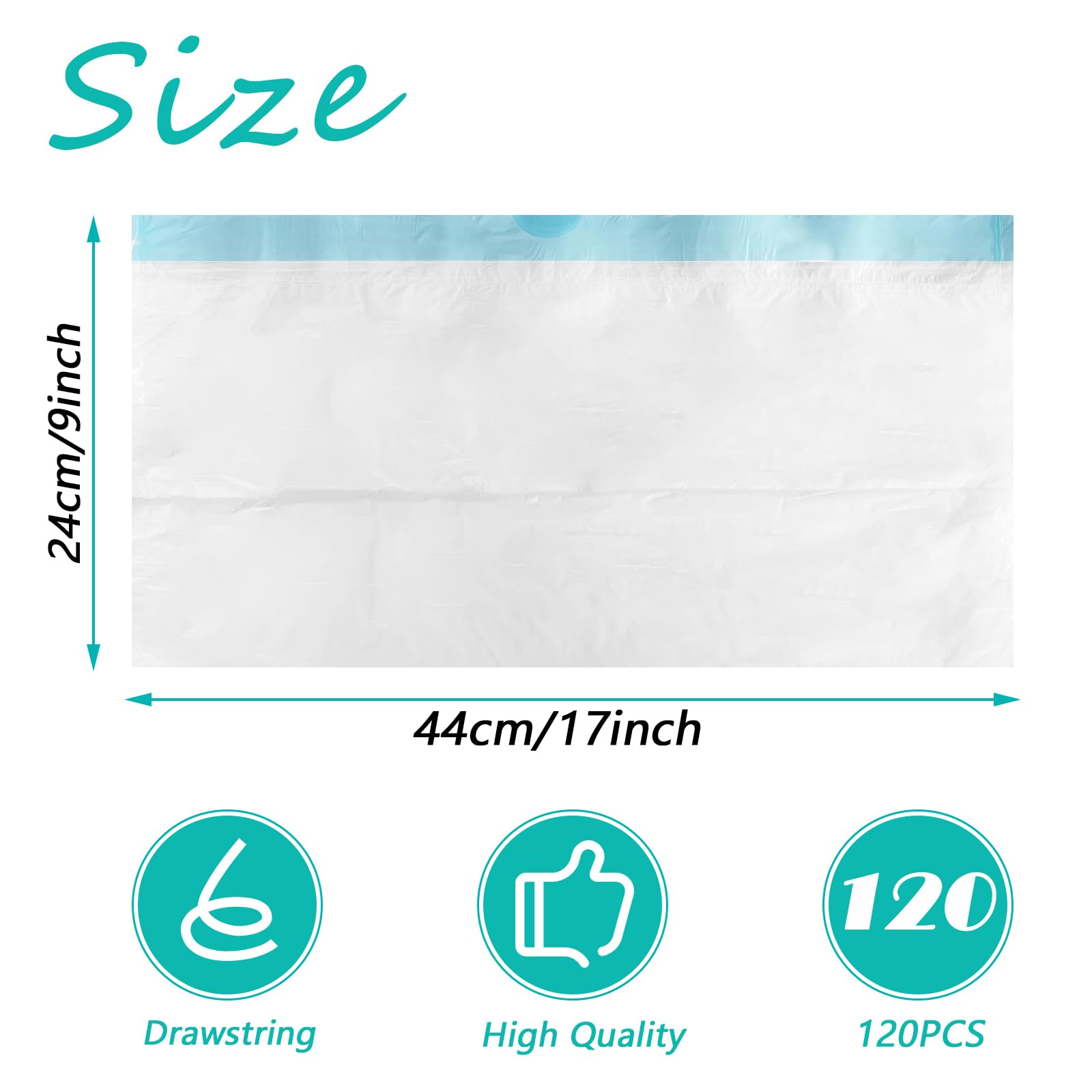 Sufficient Quantity:3 rolls a pack (total 120 bags),sufficient quantity for a long time of use.Size:44x24cm/17.3x9.4 inch. Fit most baby potty chairs.