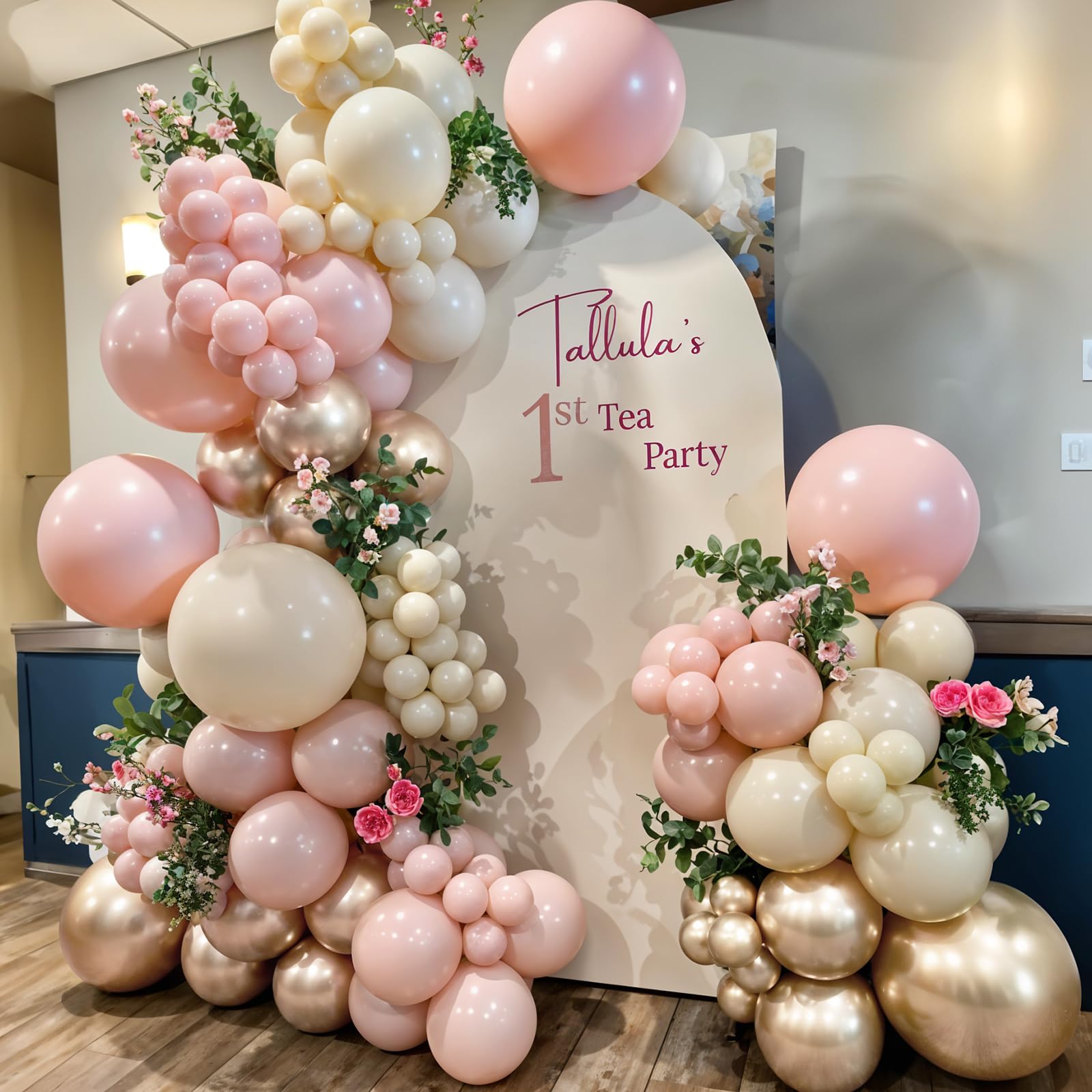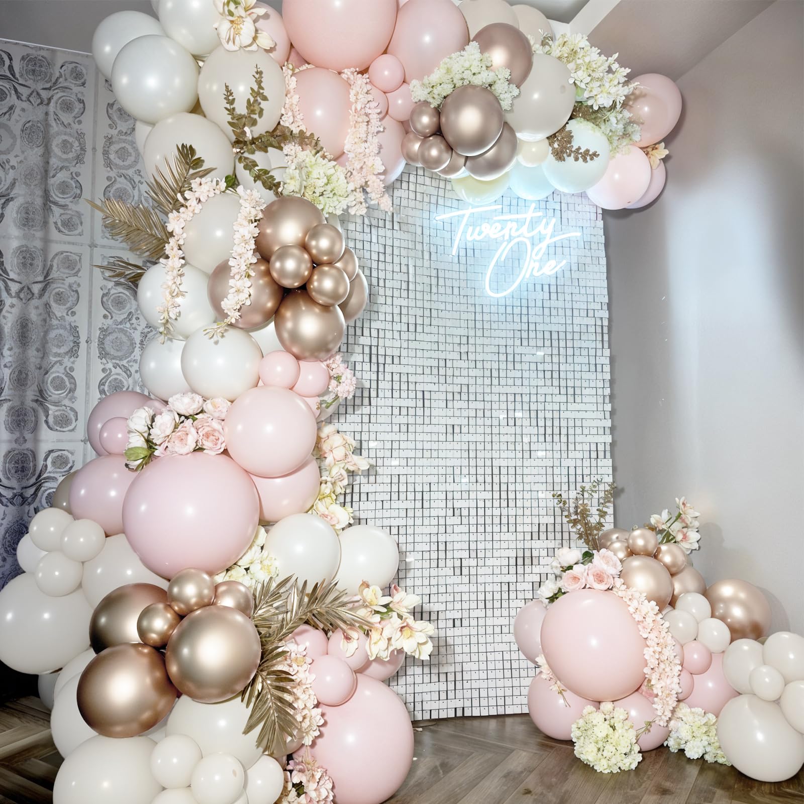 Pink Gold Birthday Decorations: Includes pastel pink ballons (12 inch; 10 pcs ); light pink helium balloons (12 in; 10 pcs ); double tuffed sand latex balloons (12 in; 8 pcs ); metallic gold balloons (12 in; 7 pcs ) and a roll white ribbon