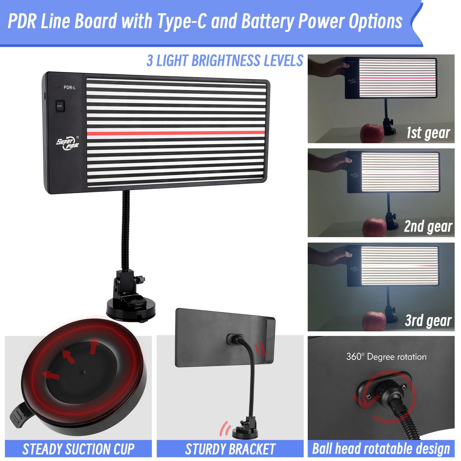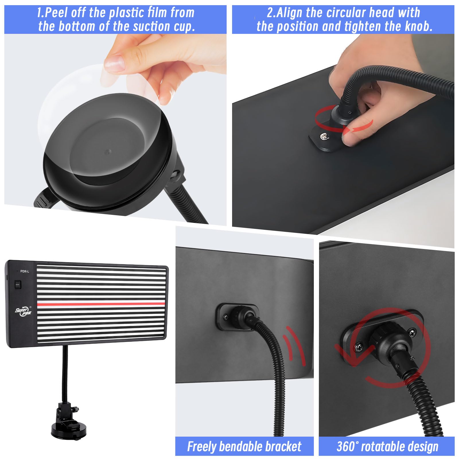 Paintless Dent Repair Line Board: This automotive dent detection board significantly improves visibility of dents and damaged areas on your vehicle, making it easy to identify for repairs. Its suction cup attachment allows for secure placement on your car's surface without the need for manual support. Additionally, the flexible bracket and rotatable backboard enable precise angle adjustments for optimal viewing.