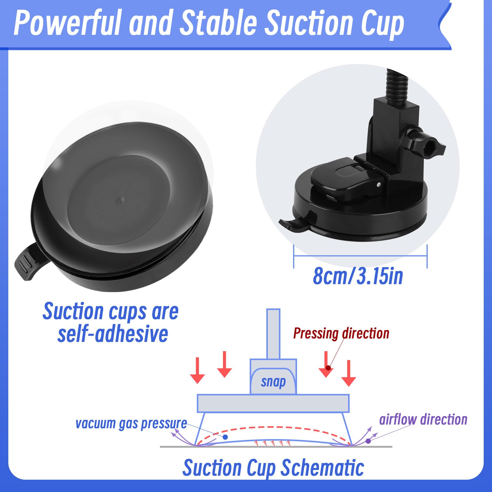 Using Tips: When you use the suction cup, make sure that the bottom of the suction cup is clean, and do not use the suction cup on a rough or dirty surface to achieve the best use effect. The suction cup can be rinsed with clean water.