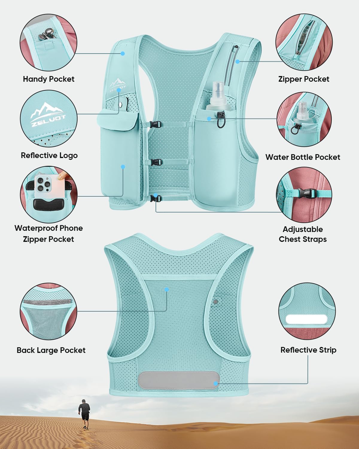 Breathable and Featherlight - Zelvot hydration vest is made from breathable, lightweight neoprene with triple-sized ventilation holes for accelerated air circulation and moisture-wicking. It barely tips the scales at 7.5 ounces, ensuring it won't slow you down. Reflective logo and strip on the front and back increase safety in low-visibility scenarios. This reflective running vest makes every run farther, safer, and more comfortable.