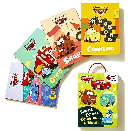A boxed set of four board books featuring Lightning McQueen and friends from Disney/Pixar Cars! Children ages 1 to 4 who love Disney/Pixar's Cars will race into learning about colors, numbers, shapes, and opposites with Lightning McQueen, Mater, and all their friends! This sturdy boxed set includes four colorful board books that each feature a different early learning concept. Plus, there's a plastic handle for learning fun on the go!