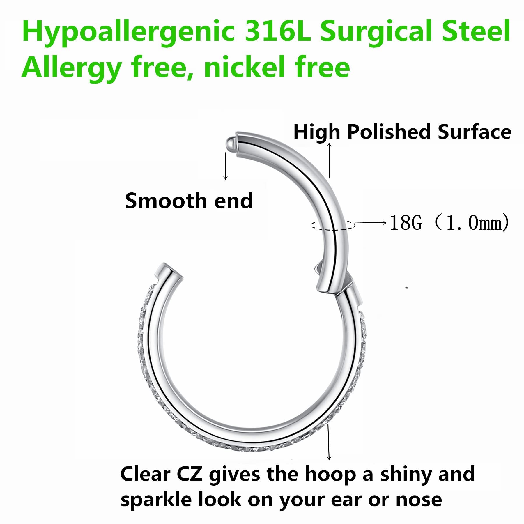 Hypoallergenic: Made of 316L surgical stainless steel(lead-free, nickel-free, and hypoallergenic,) won't infect your skin, sturdy and durable, can be safely used for a long time.Has a High polished smooth surface and void of sharp edges, no irritation to your skin, comfortable for daily use.Clear CZ gives the hoop a shiny and sparkle look on your ear or nose, the classic silver color and simple design can be used for any occasion.