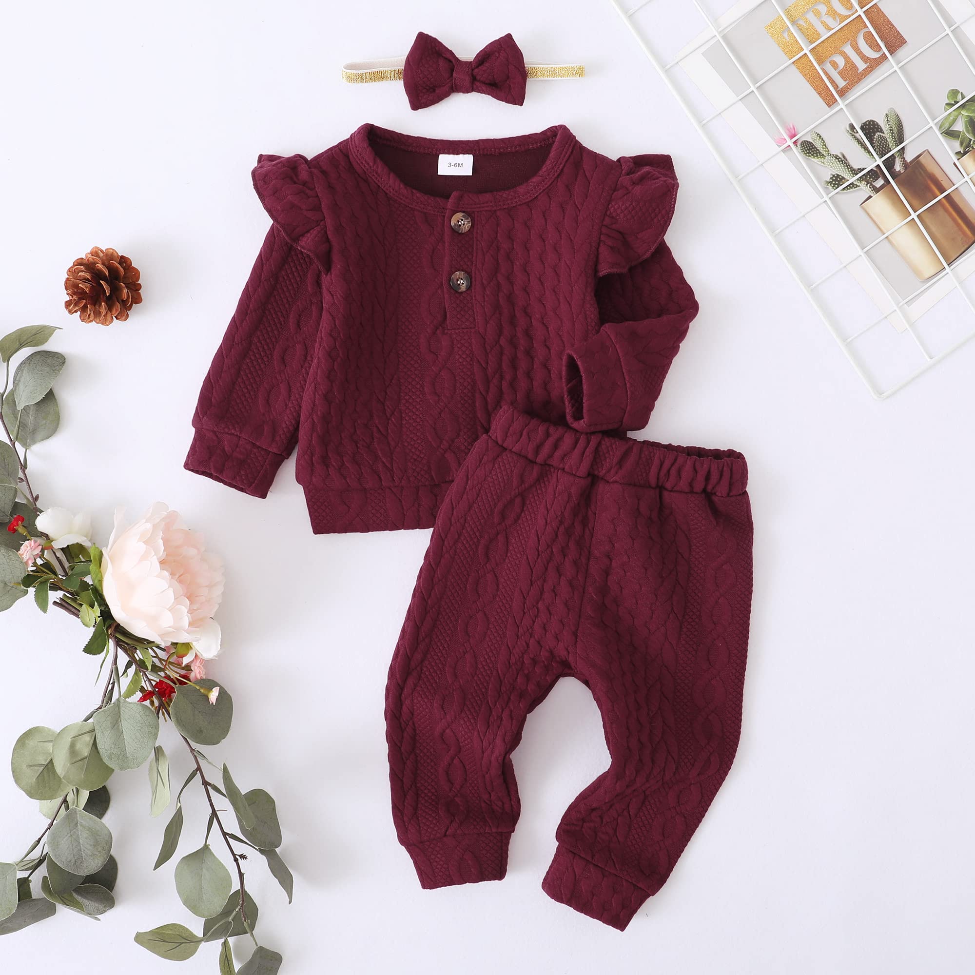 Designs: Baby girl 2 piece pant sets feature the ruffled shoulder, a headband and girls pant with pockets, pullover long sleeve shirts tops, solid color.