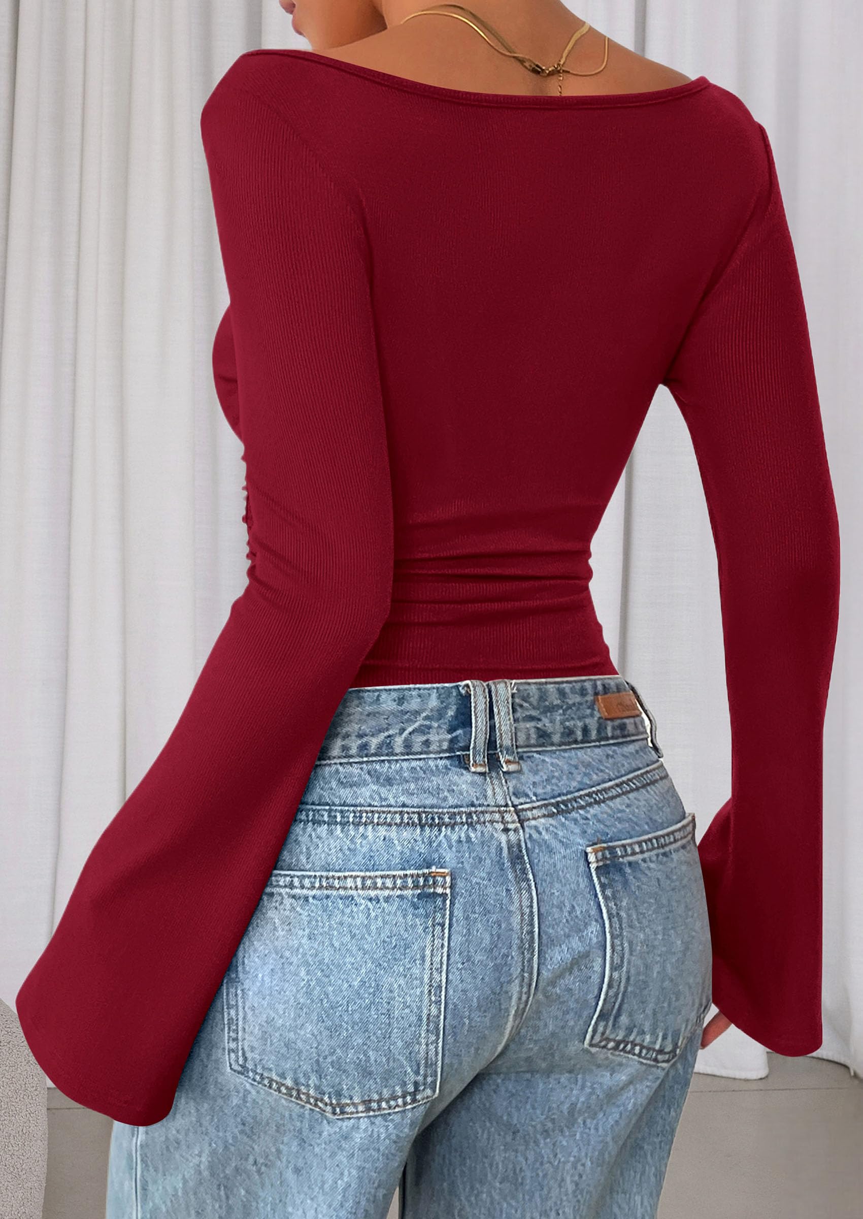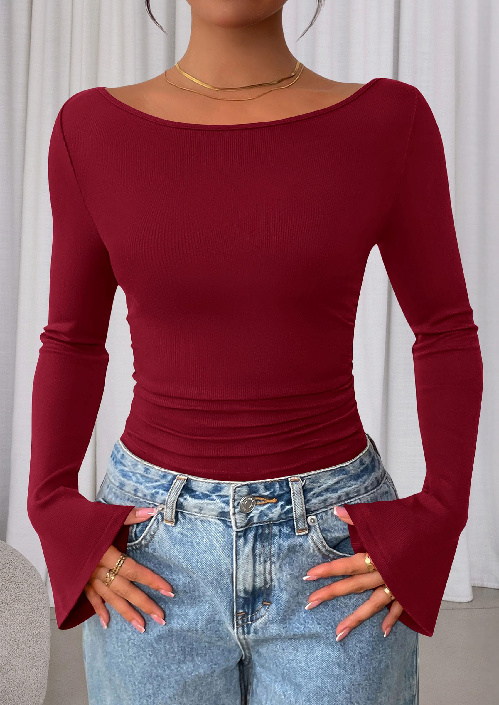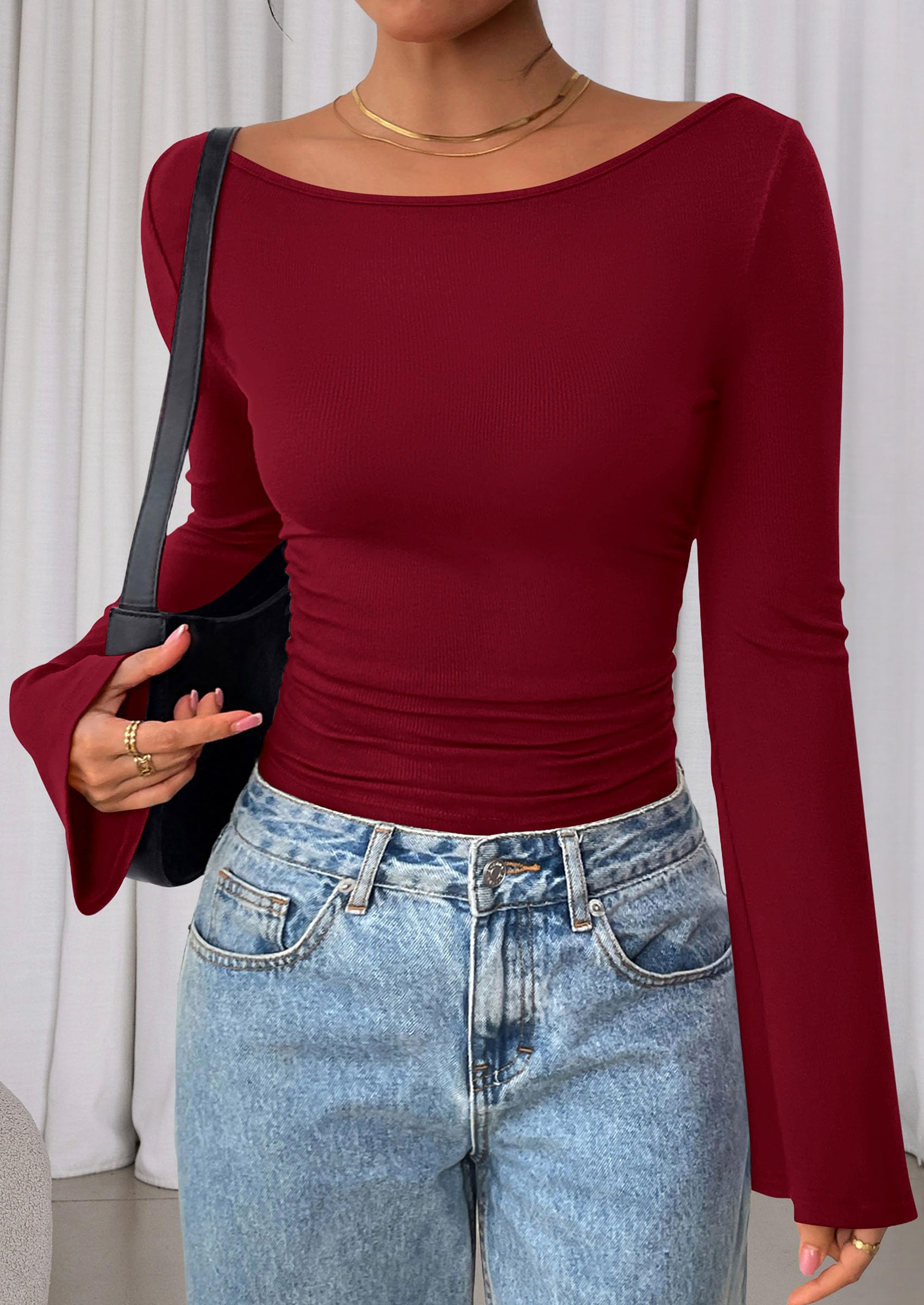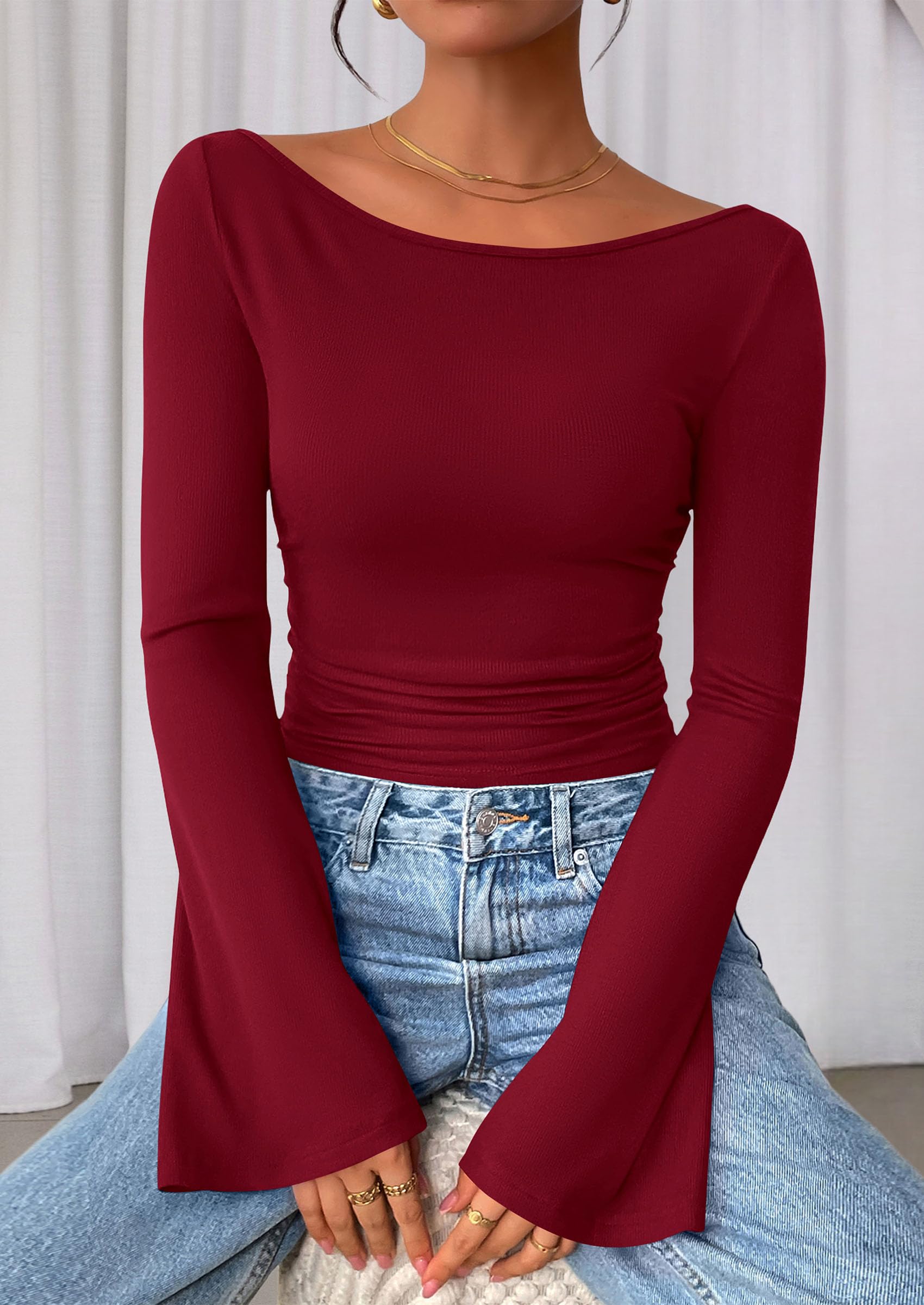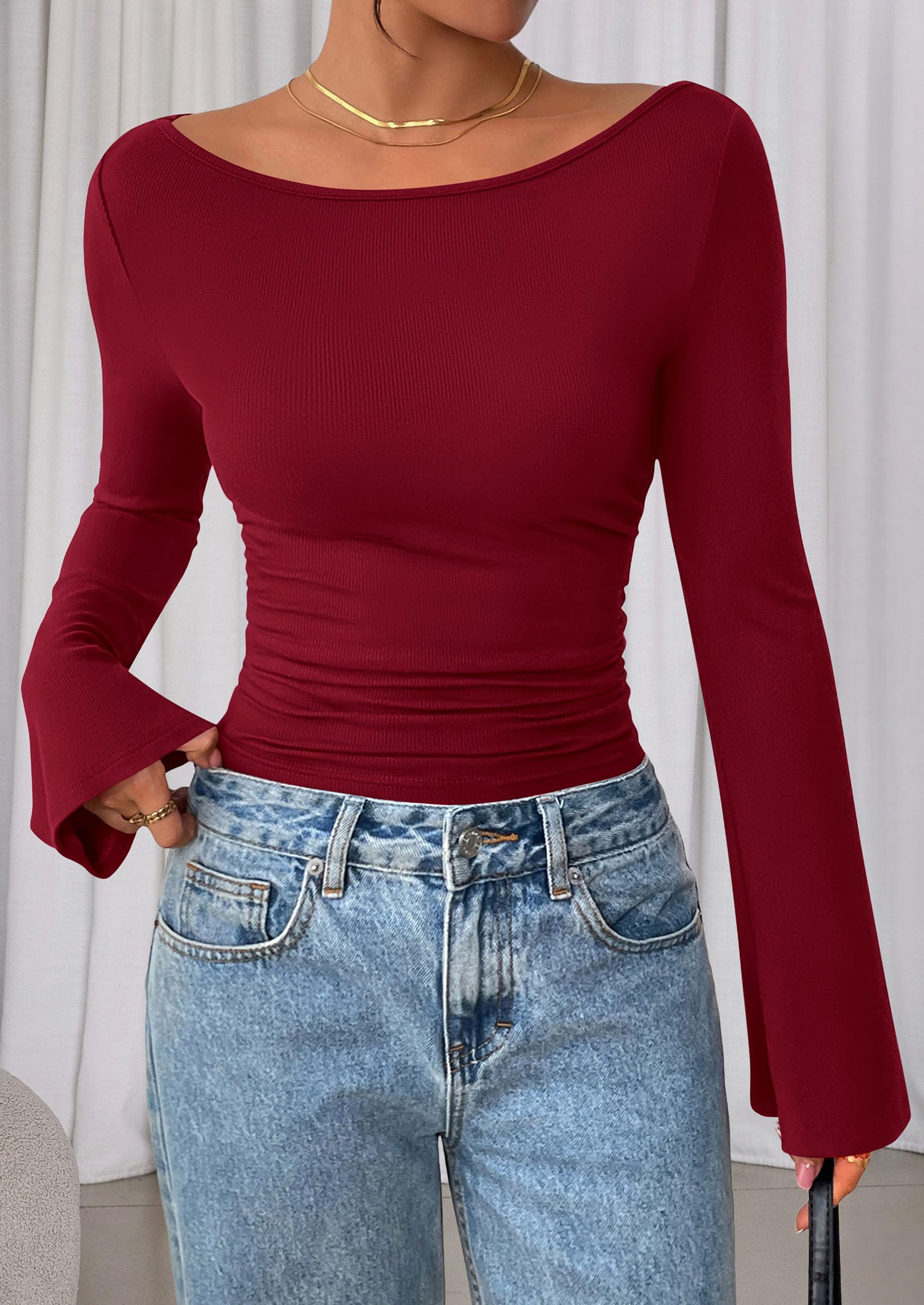 Features: Boat neck tops for women, y2k tops, ribbed knit fitted casual tees, plain T-shirts for women. Bell sleeve design makes it look chic and elegant, suitable for fall, winter and spring