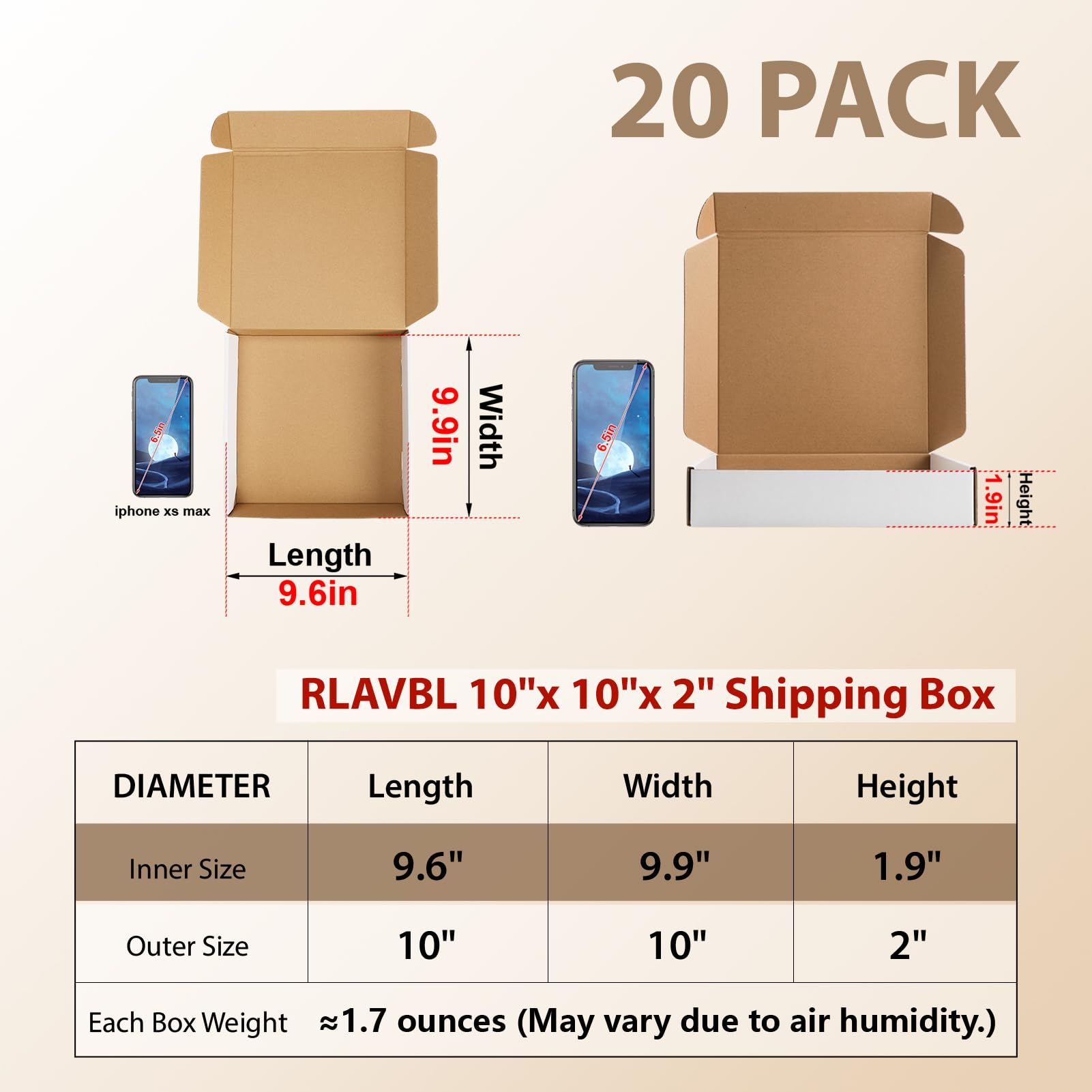 DIMENSION: The shipping boxes set includes 20 packs of the cardboard box. The size of this small moving box is 10” x 10” x 2”(L x W x H), suitable for packing or mailing those small and lightweight items.