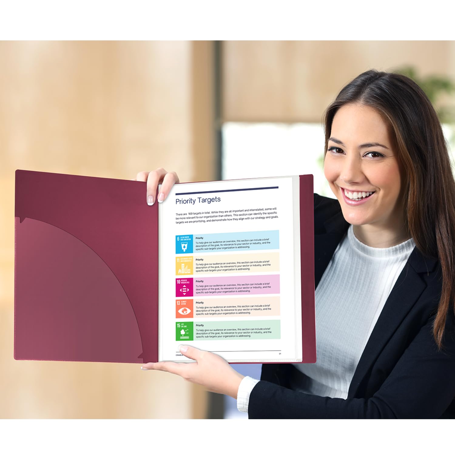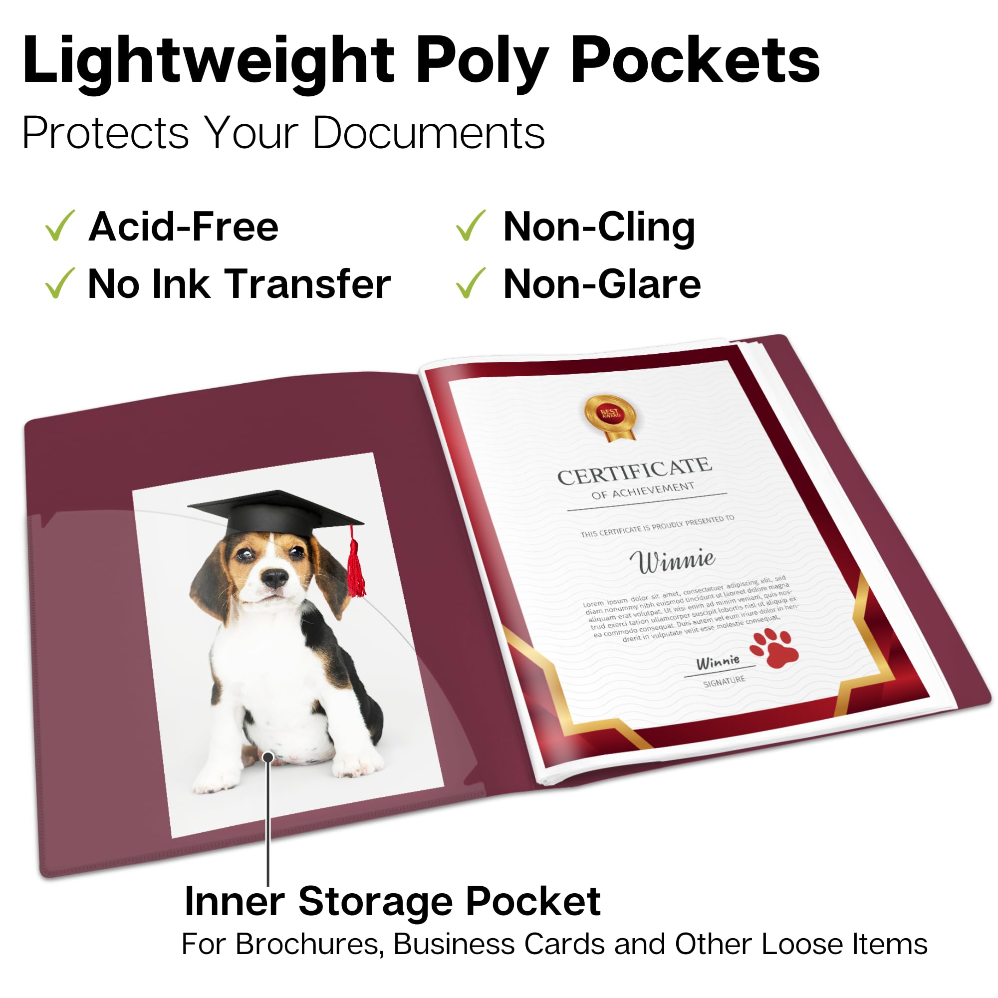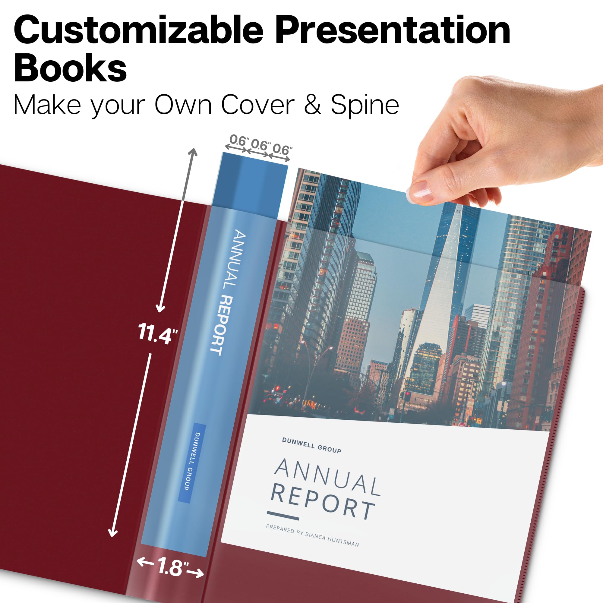 DURABLE CONSTRUCTION, BUILT TO LAST: Premium plastic covers, reinforced binding resist tearing. Non-glare poly sleeves are dirt and moisture resistant, for a professional appearance every time.
