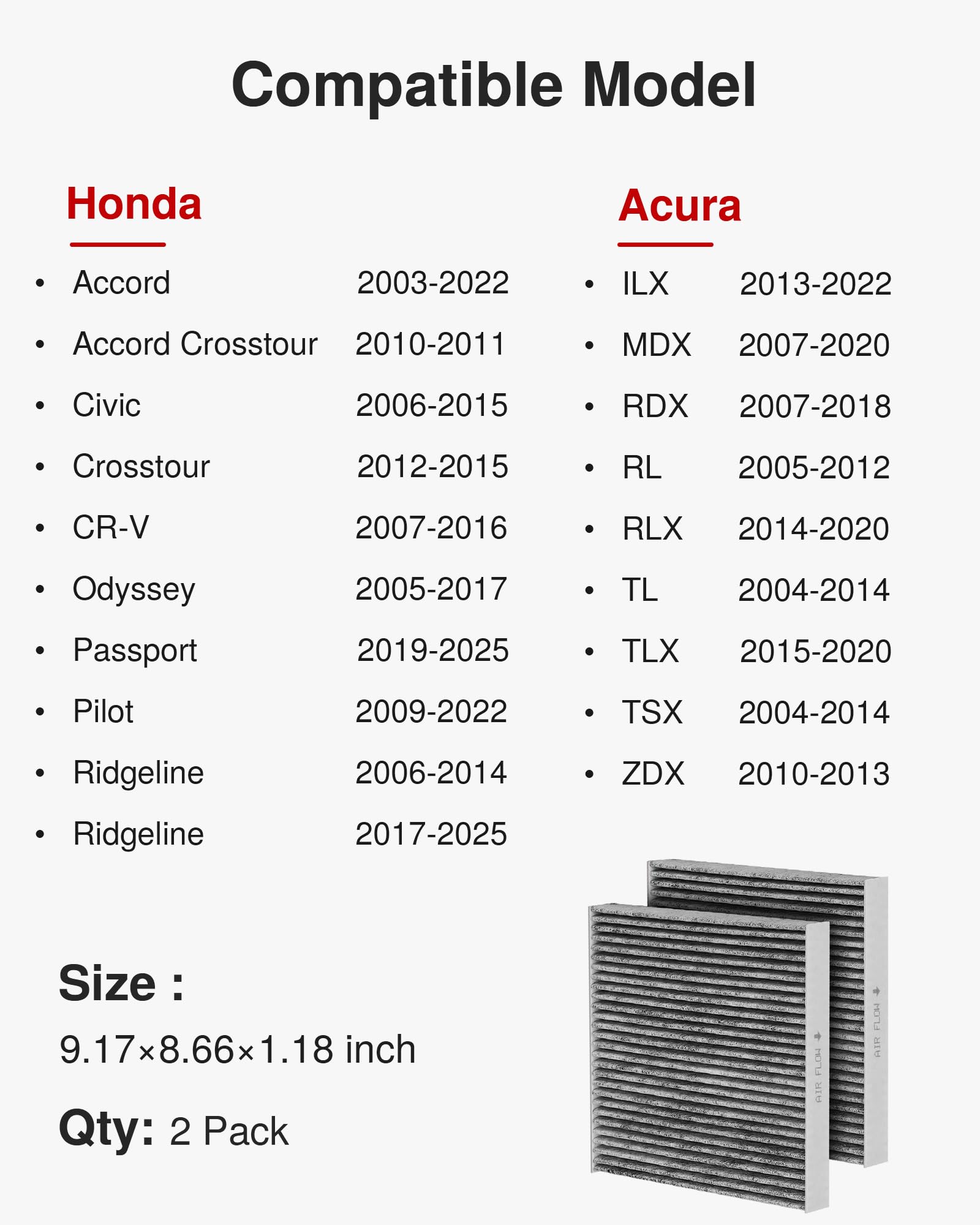 Compatible Auto List: Our cabin air filter compatible with Acura: ILX (2013-2022), MDX (2007-2020), RDX (2007-2018), RL (2005-2012), RLX (2014-2020), TL (2004-2014), TLX (2015-2020), TSX (2004-2014), ZDX (2010-2013). Honda: Accord (2003-2022), Accord Crosstour (2010-2011), Civic (2006-2015), Crosstour (2012-2015), CR-V (2007-2016), Odyssey (2005-2017), Passport (2019-2025), Pilot (2009-2022), Ridgeline (2006-2014, 2017-2025).