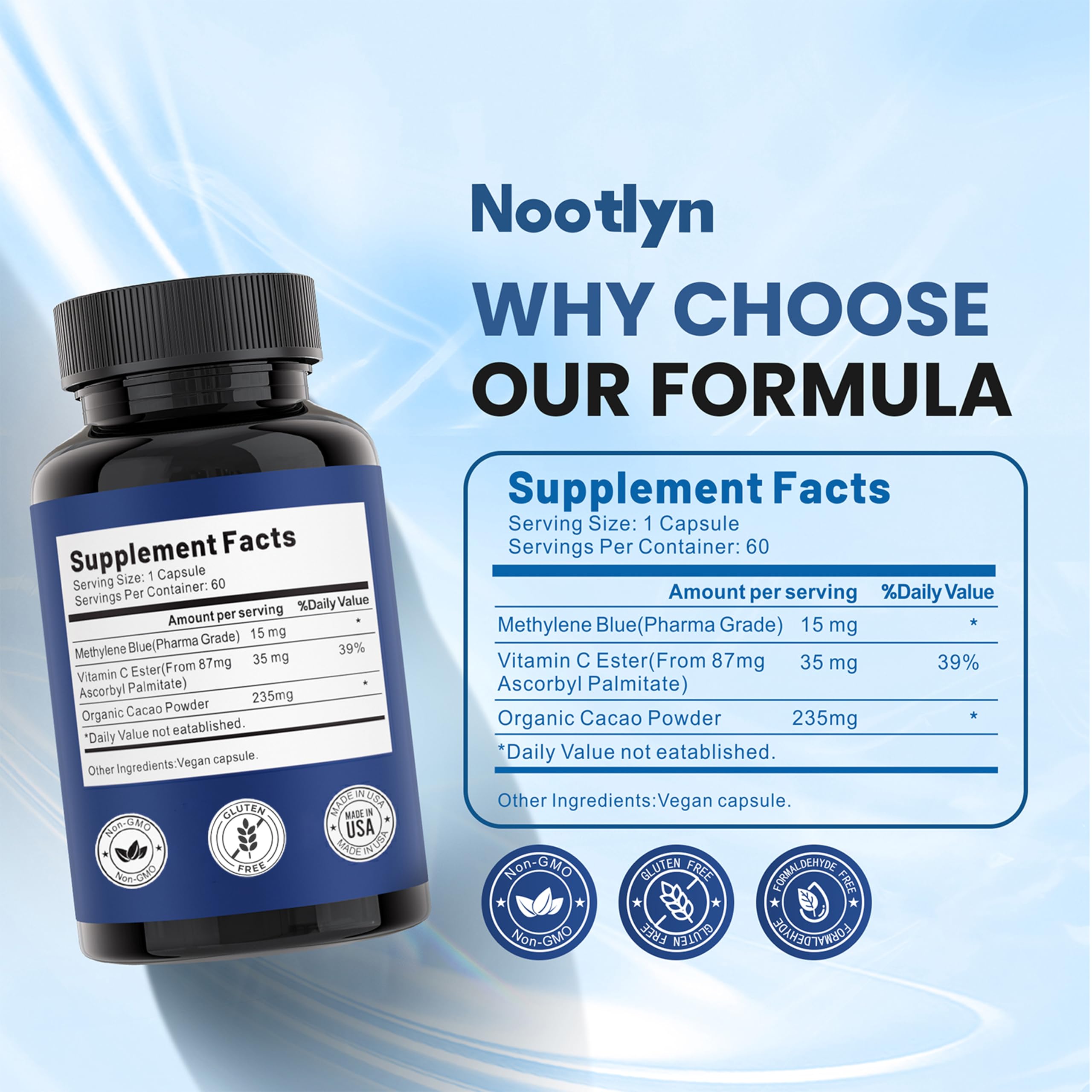 Pharmaceutical Grade Quality: Formulated with high-purity methylene blue in a carefully controlled process to ensure consistent quality in every capsule. Designed for those who value clean and reliable supplementation.