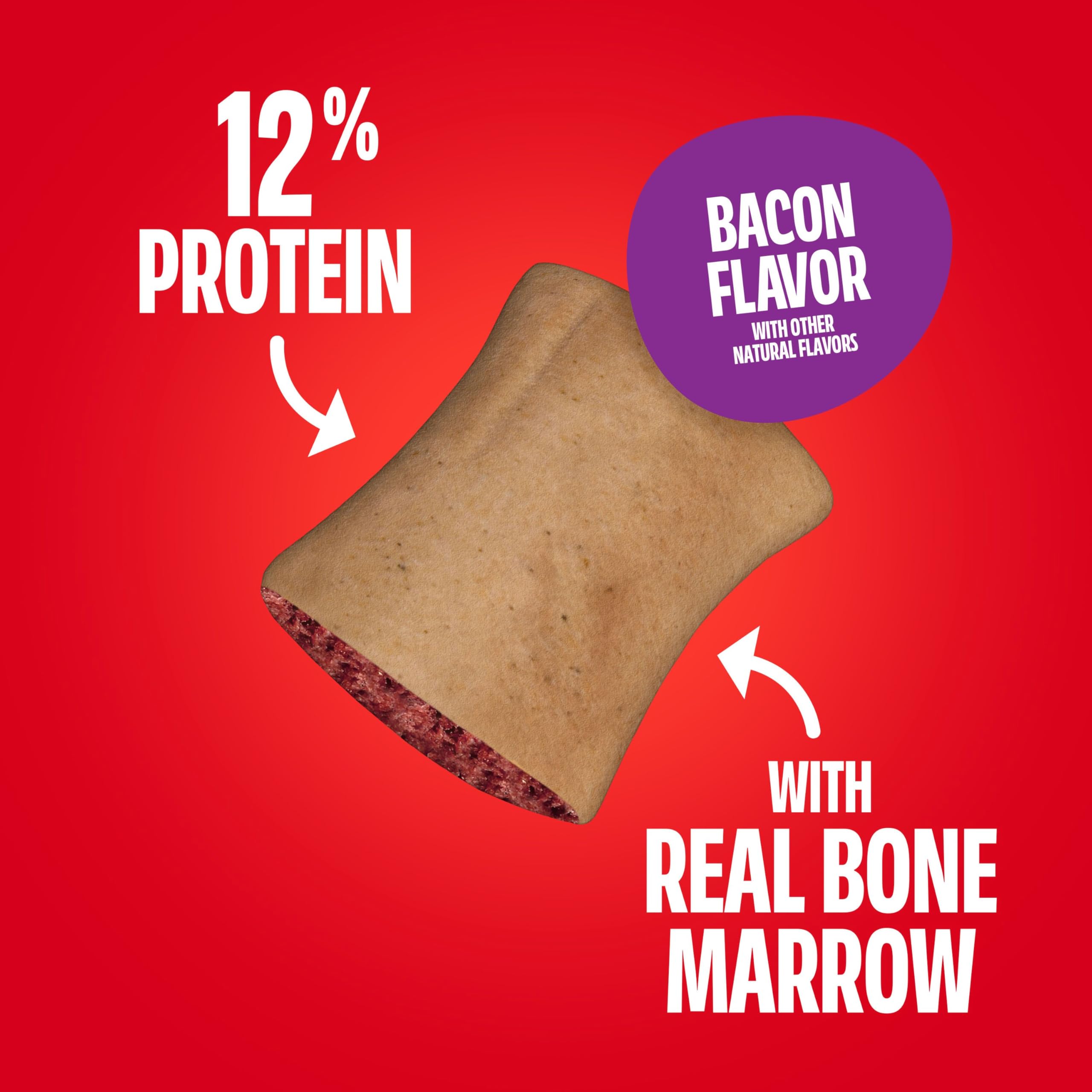 Contains (2) 40 ounce package of small, crunchy dog treats with real bone marrow and delicious bacon flavor
