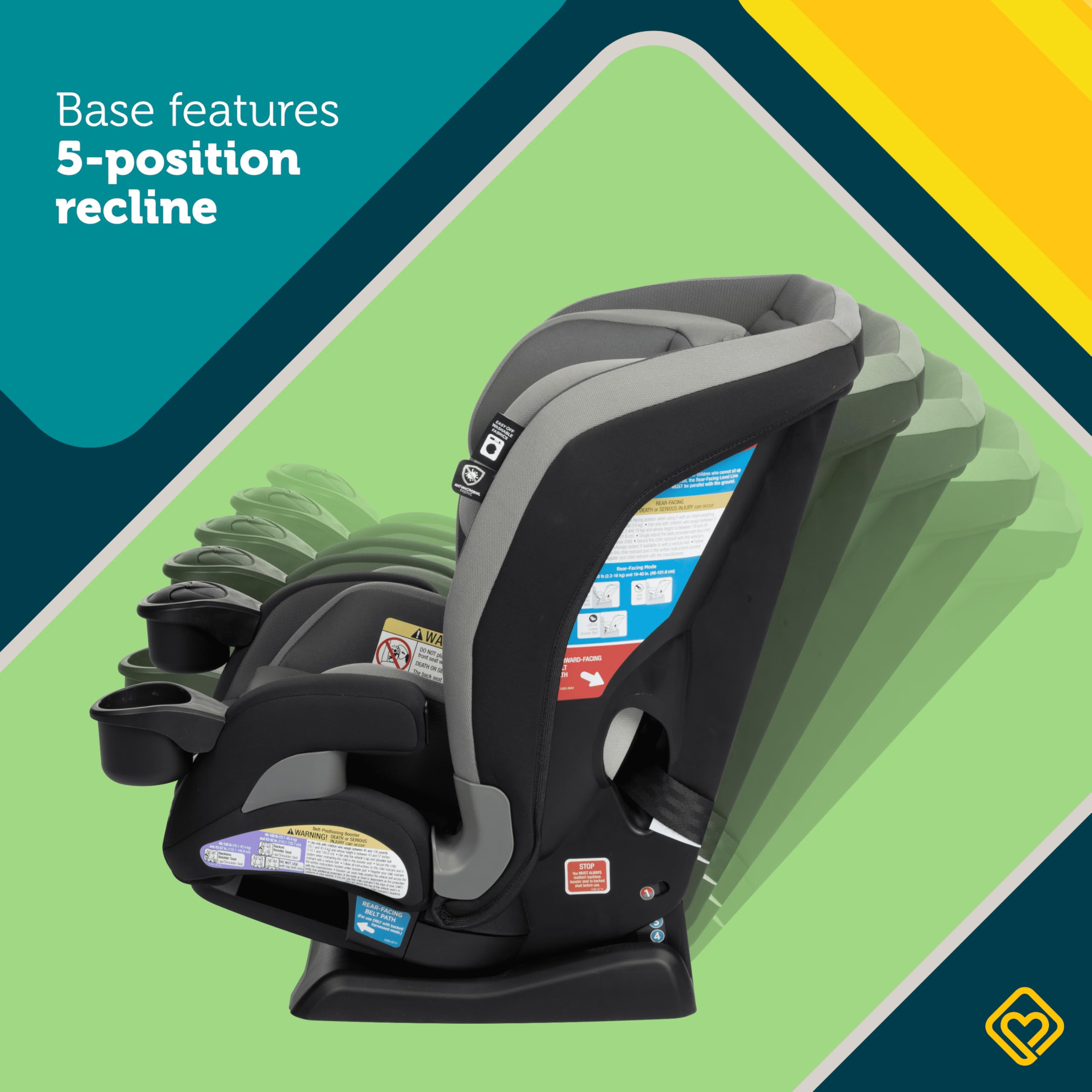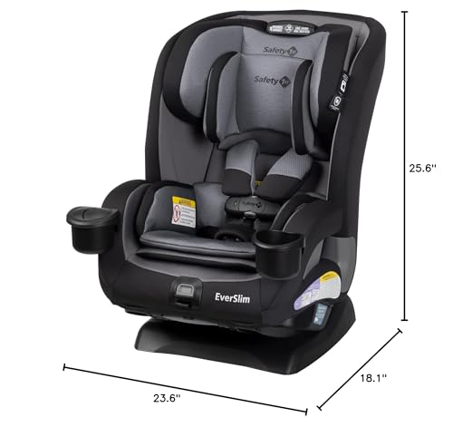 Introducing the Safety 1st Everslim DLX Convertible Car Seat, an all in one car seat designed to provide comprehensive comfort. This 4 in 1 car seat adapts with your growing child, making it the perfect car seat that's convertible from infant to toddler to 10 years old. Our car seat has four distinct modes to cater to your child's needs starting from a newborn at 5 pounds: a rear facing car seat for babies 5 to 40 lbs, or a forward facing car seat that supports children from 22 to 65 lbs. When your child grows older, convert it into a slim fit car seat and use it as a belt-positioning booster for weights between 40 to 100 lbs. The car seat can also serve as a backless booster. One of our standout features is our unique secure chest clip with a visual indicator. This gives a clear red-to-green to let you know if the chest clip is securely fastened. The Everslim DLX Convertible Car Seat is designed to grow with your child. With a 5-position adjustable base, the car seat comfortably adapts to your growing toddler from rear facing car seat to front facing car seat. Your child's comfort isnβt compromised with our 10-position adjustable headrest. In case of any spills by your little ones, don't worry! The removable seat cover and infant inserts for this toddler car seat are conveniently machine washable. Ideal for small and big families alike, the slim design of our toddler car seats allows for up to three carseats to fit in the back seat of standard sized cars. With the Safety 1st Everslim DLX Convertible Car Seat, embrace an easy and comfortable ride for your children, tailored to their growing years.