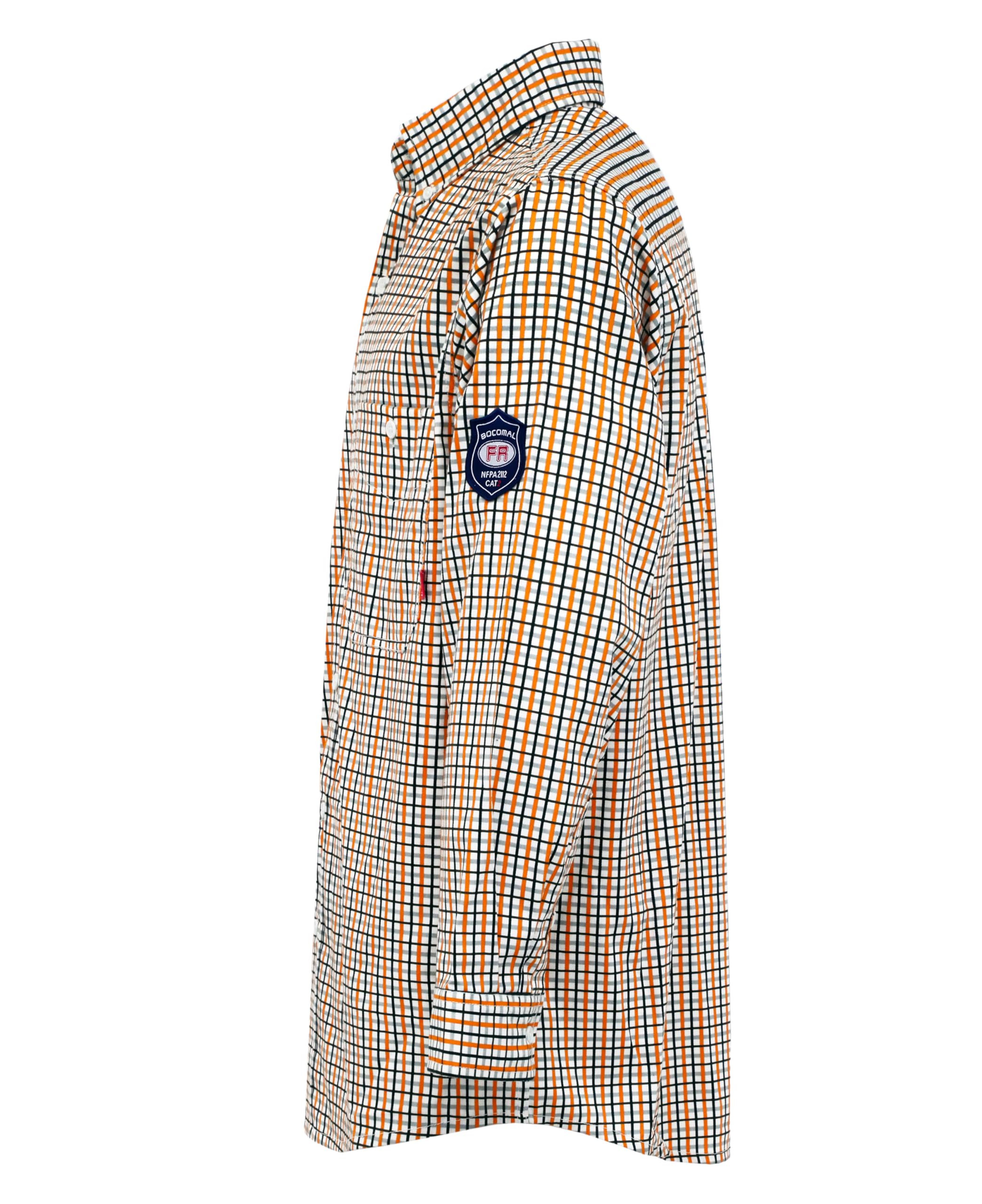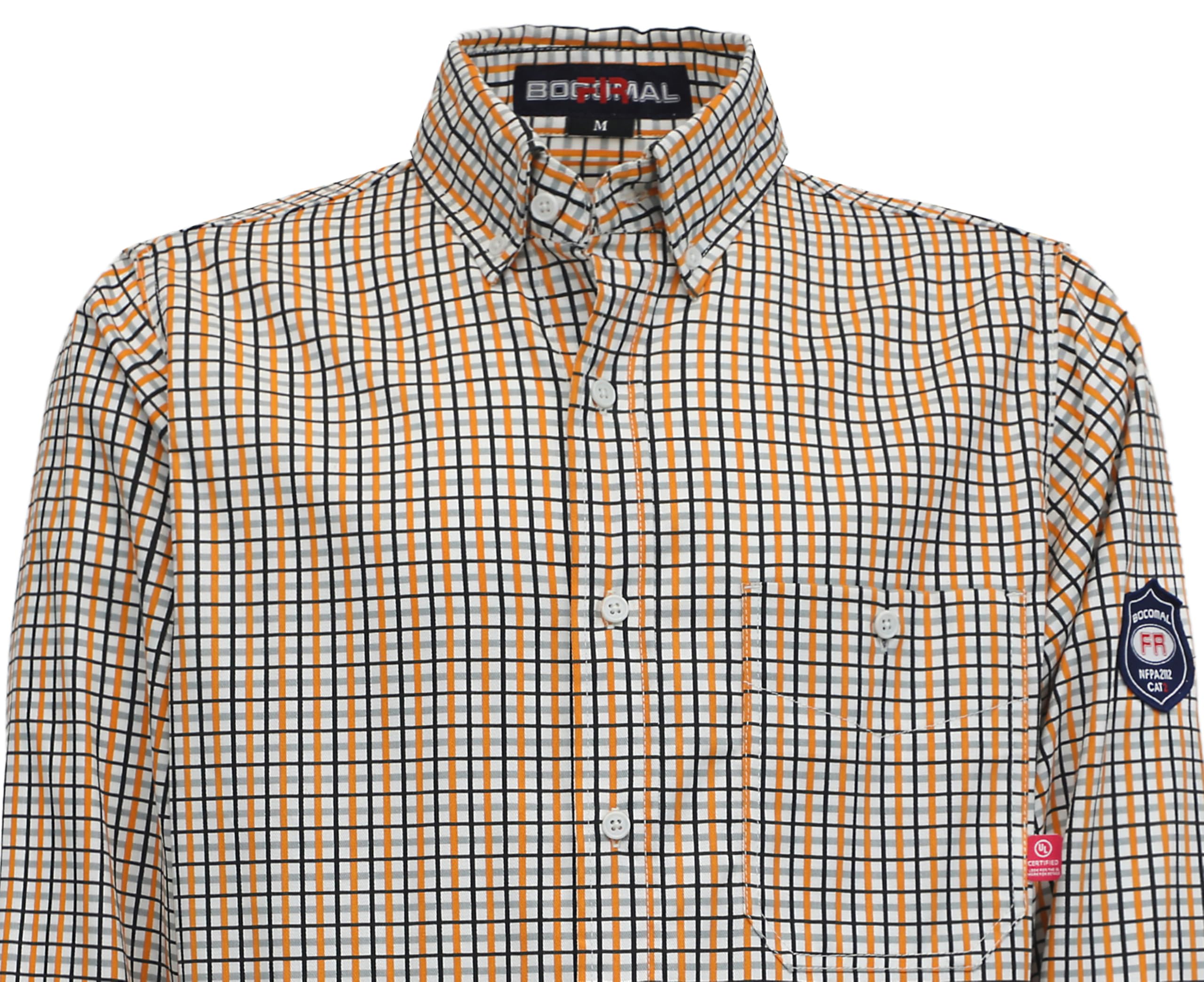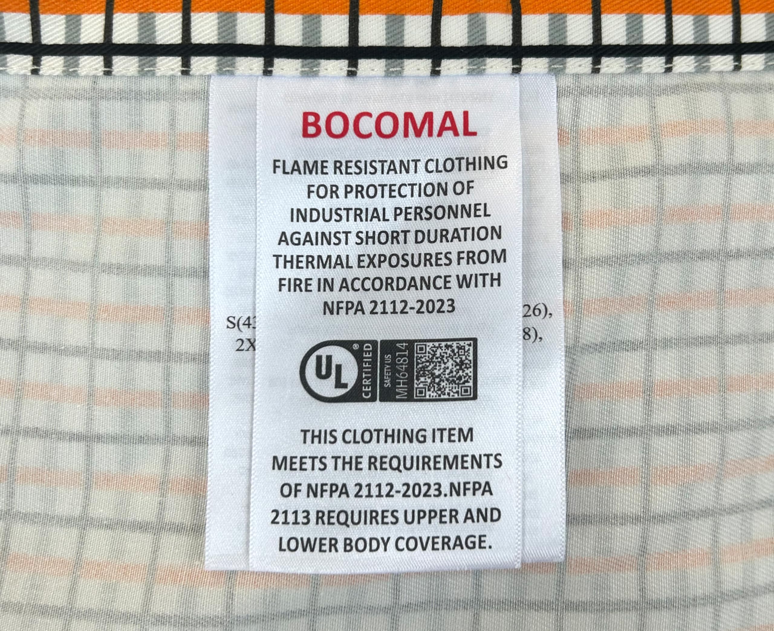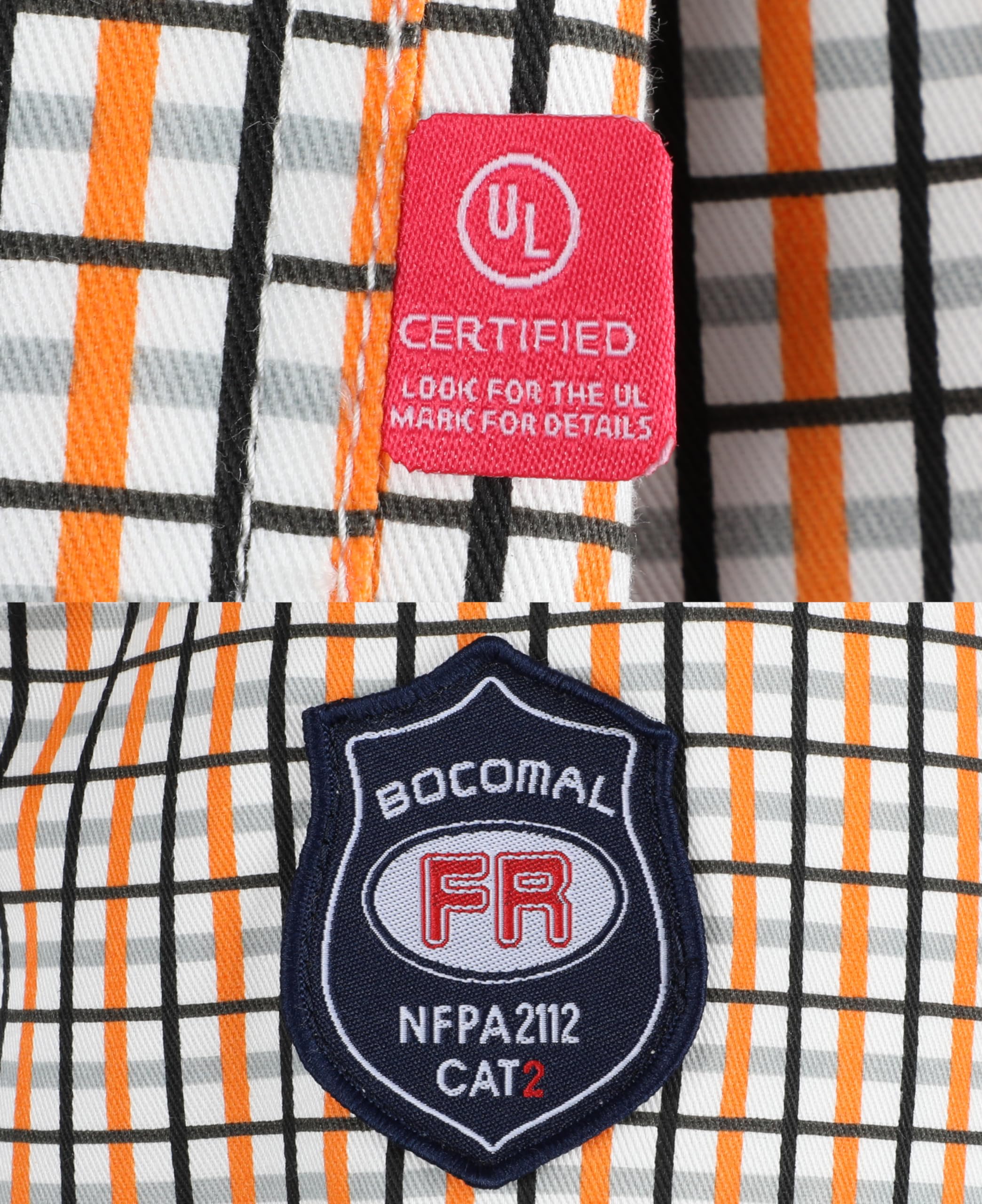 FR MATRIALS LIGHT WEIGHT:6.5OZ Cotton Printed Plaid,They feature FR buttons and are stitched with FR sewing threads for added safety.Eyecatch FR Tag on pocket.Additionally,the inside tag provides more information about UL certification. As a bonus, we have included a small sample inside the package for customers to try out the FR properties firsthand.