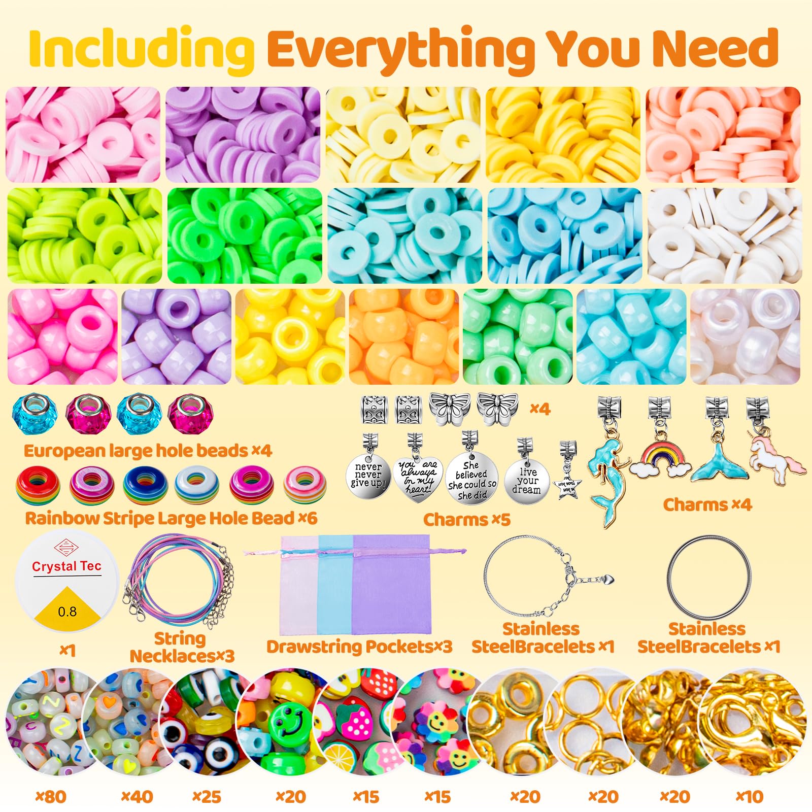 2200+ Beads & Accessories – Includes 1800 polymer clay beads, 140 barrel beads, 80 colorful alphabet beads, 115 fun beads (smiley, fruit, heart, sunflower, evil eye), plus cords, bracelets, and charms.