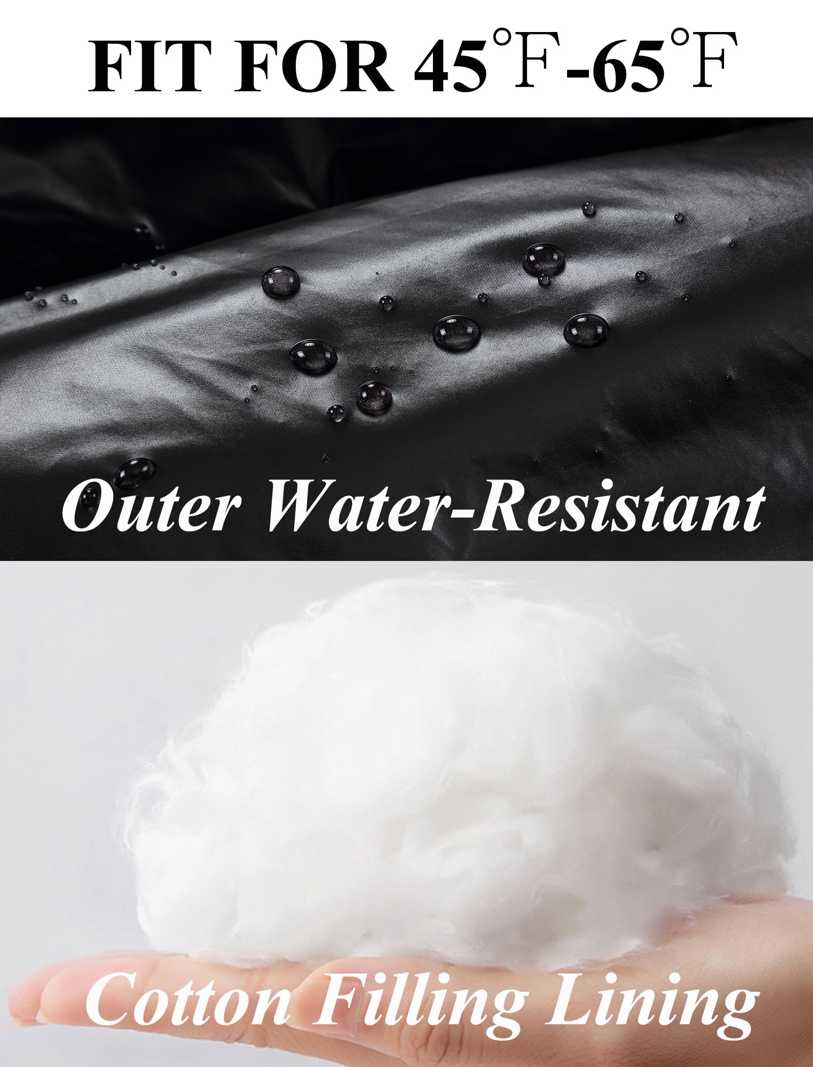 Water Resistant: Featuring a water repellent fabric, this thermal vest finish sheds light rain and snow. It is filled with 100% cotton that is more puffy and insulated. Suitable for temperatures between 45°F and 65°F