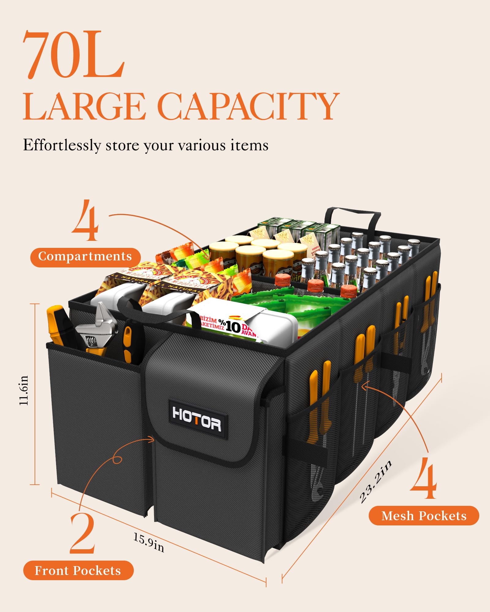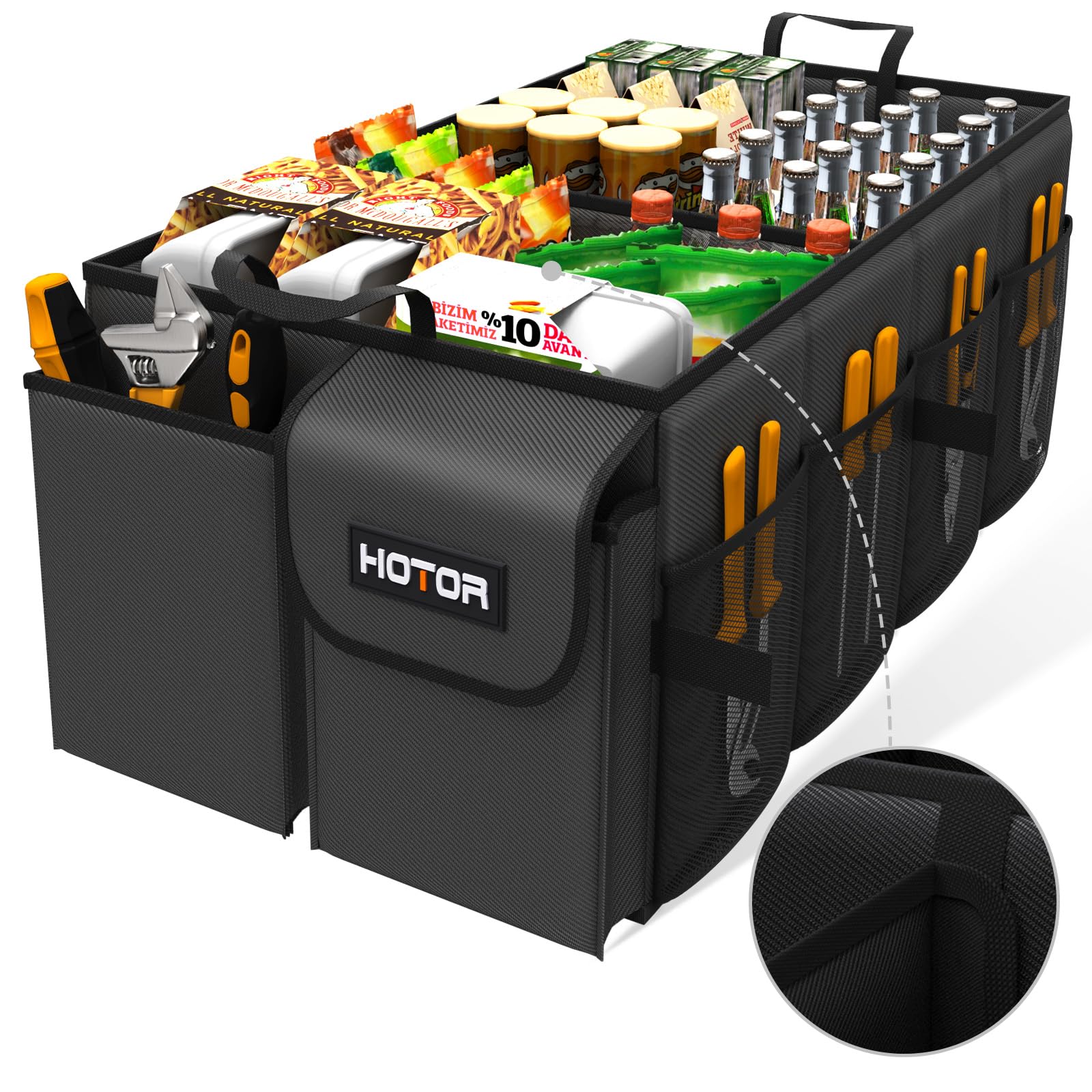 CONVENIENT ACCESS: HOTOR car trunk organizer for SUV is equipped with 3 compartments and 6 stretchy mesh pockets to make items easy to see and grab when needed. No more digging around a messy trunk to find what you need. Just grab and go.