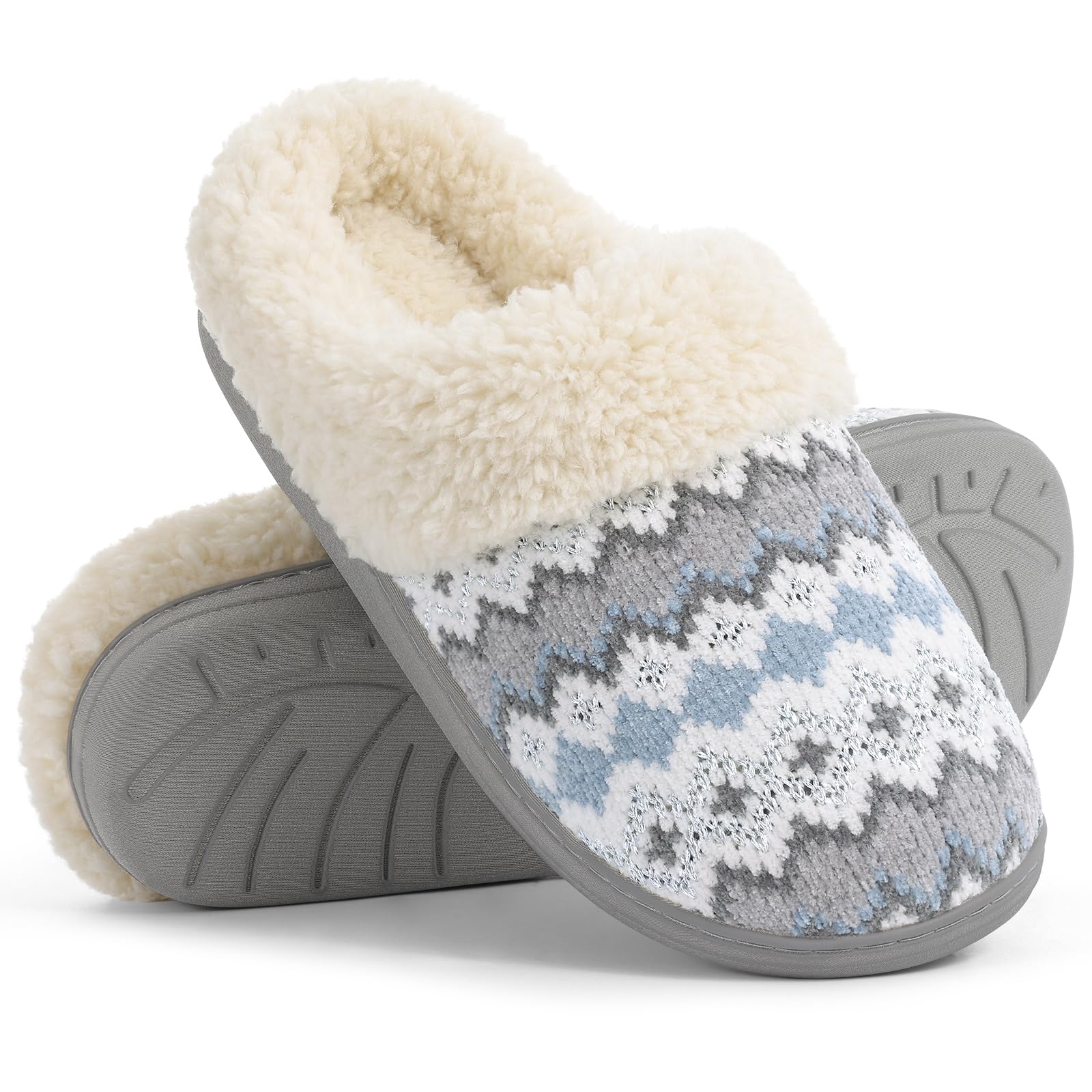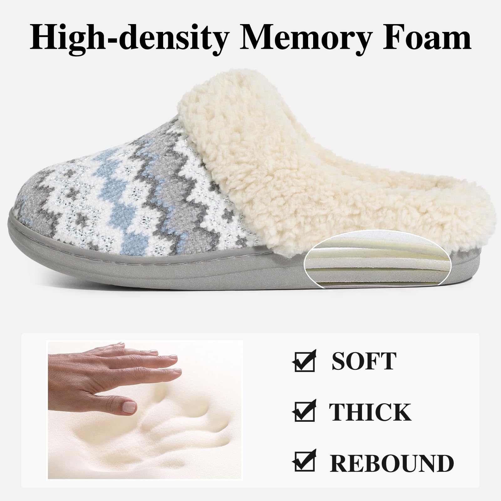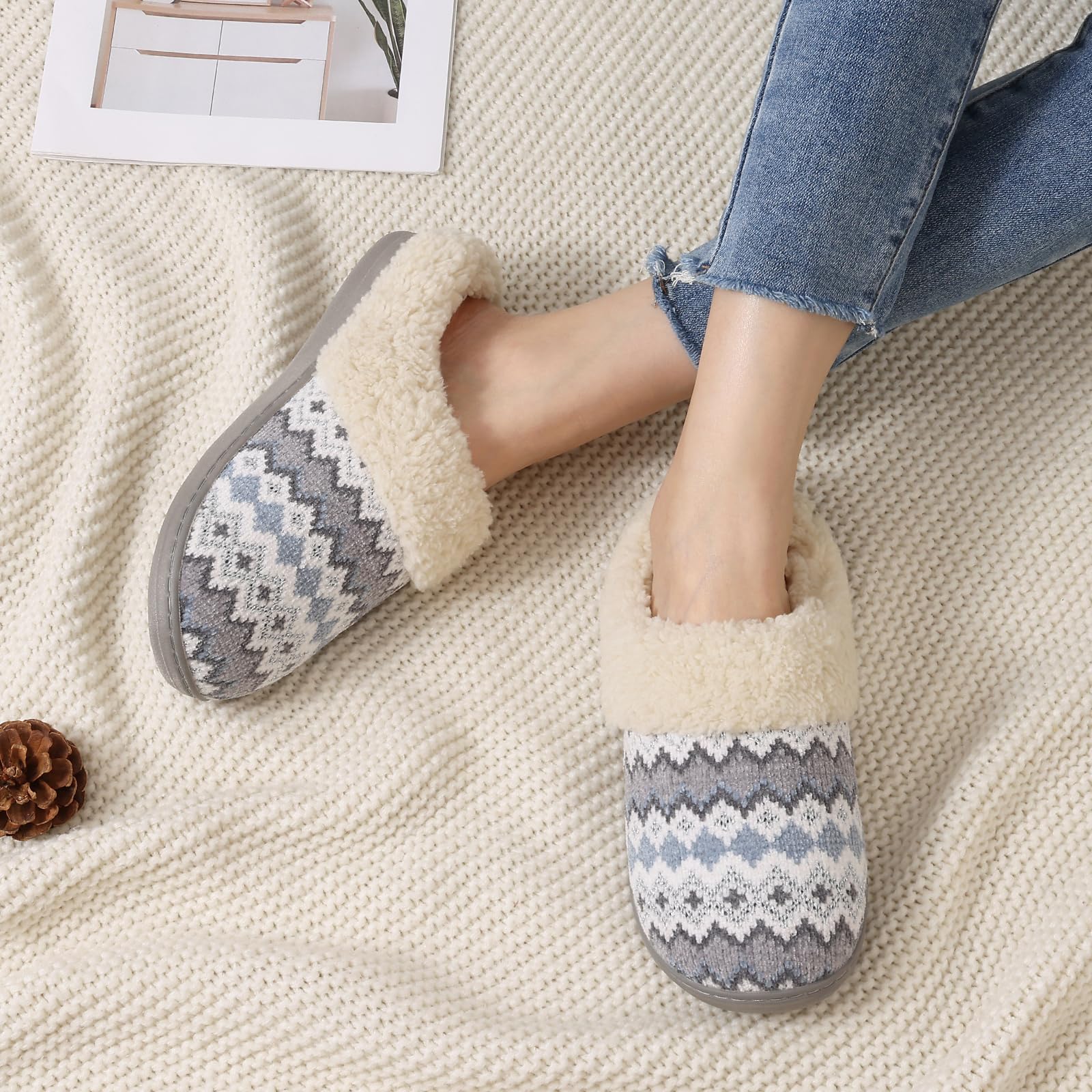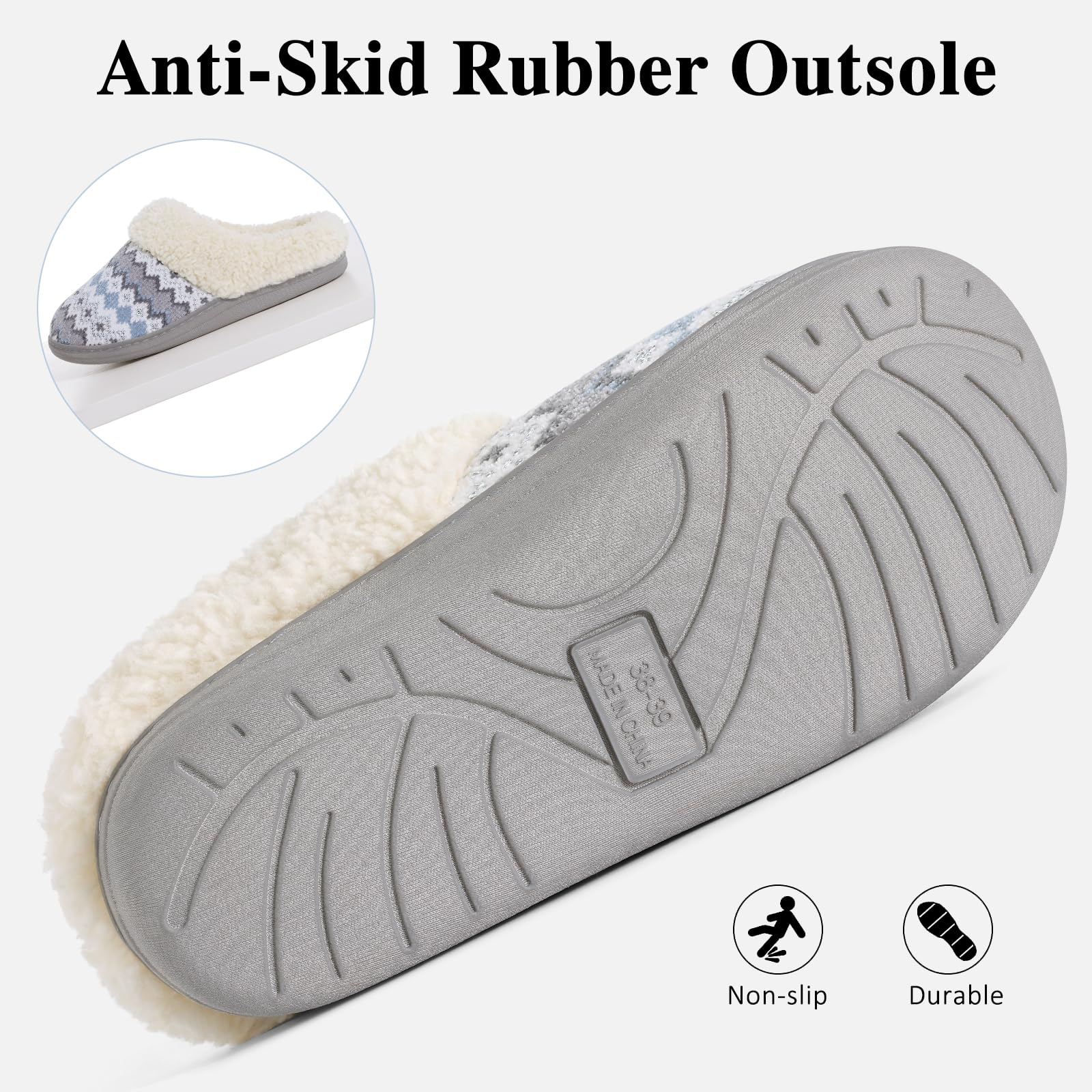 𝐂𝐥𝐚𝐬𝐬𝐢𝐜 𝐖𝐢𝐧𝐭𝐞𝐫 𝐊𝐧𝐢𝐭 𝐒𝐥𝐢𝐩𝐩𝐞𝐫𝐬: The sweater knit upper with embroidered pattern like a sweatshirt for your feet, along with cozy wool-like plush fleece lining that keep your feet warm on every cold nights. And easy slip-on design with plush collar will provie extra comfort.