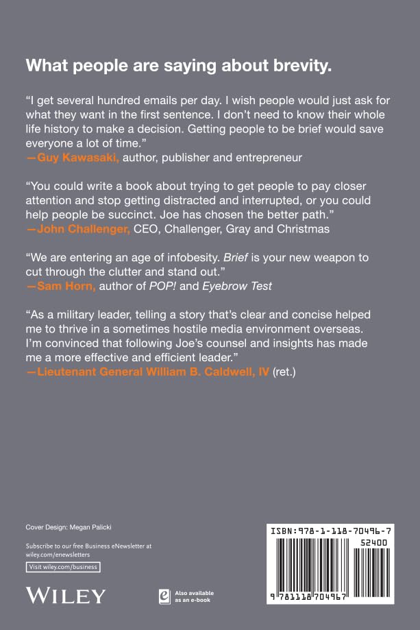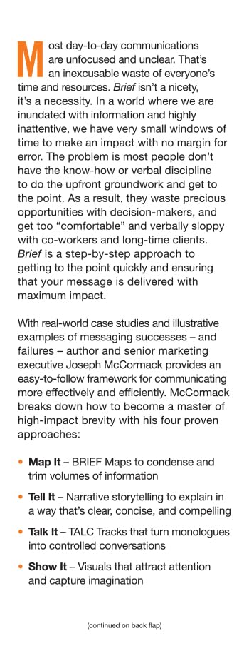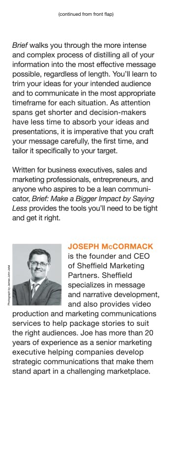 Get heard by being clear and concise The only way to survive in business today is to be a lean communicator. Busy executives expect you to respect and manage their time more effectively than ever. You need to do the groundwork to make your message tight and to the point. The average professional receives 304 emails per week and checks their smartphones 36 times an hour and 38 hours a week. This inattention has spread to every part of life. The average attention span has shrunk from 12 seconds in 2000 to eight in 2012. So, throw them a lifeline and be brief. Author Joe McCormack tackles the challenges of inattention, interruptions, and impatience that every professional faces. His proven B.R.I.E.F. approach, which stands for Background, Relevance, Information, Ending, and Follow up, helps simplify and clarify complex communication. BRIEF will help you summarize lengthy information, tell a short story, harness the power of infographics and videos, and turn monologue presentations into controlled conversations. Details the B.R.I.E.F. approach to distilling your message into a brief presentation Written by the founder and CEO of Sheffield Marketing Partners, which specializes in message and narrative development, who is also a recognized expert in Narrative Mapping, a technique that helps clients achieve a clearer and more concise message Long story short: BRIEF will help you gain the muscle you need to eliminate wasteful words and stand out from the rest. Be better. Be brief.