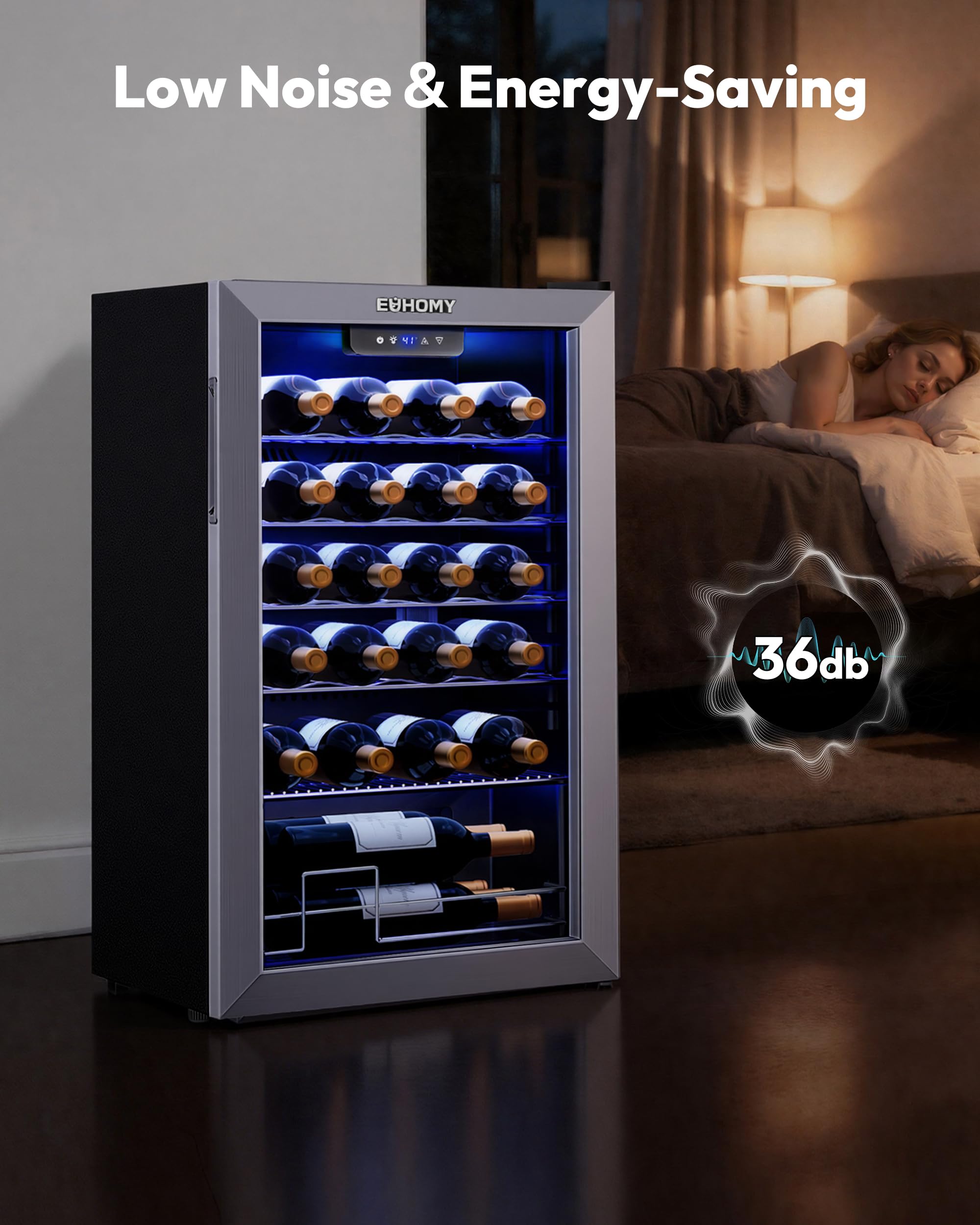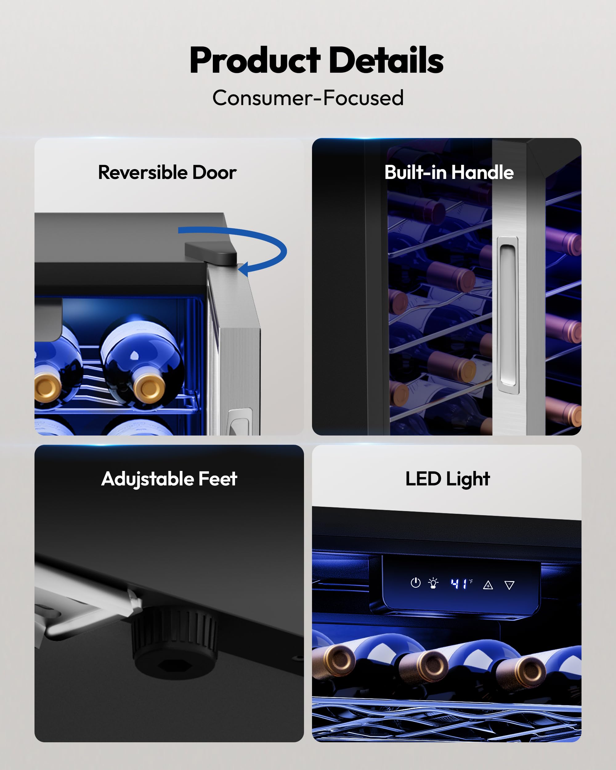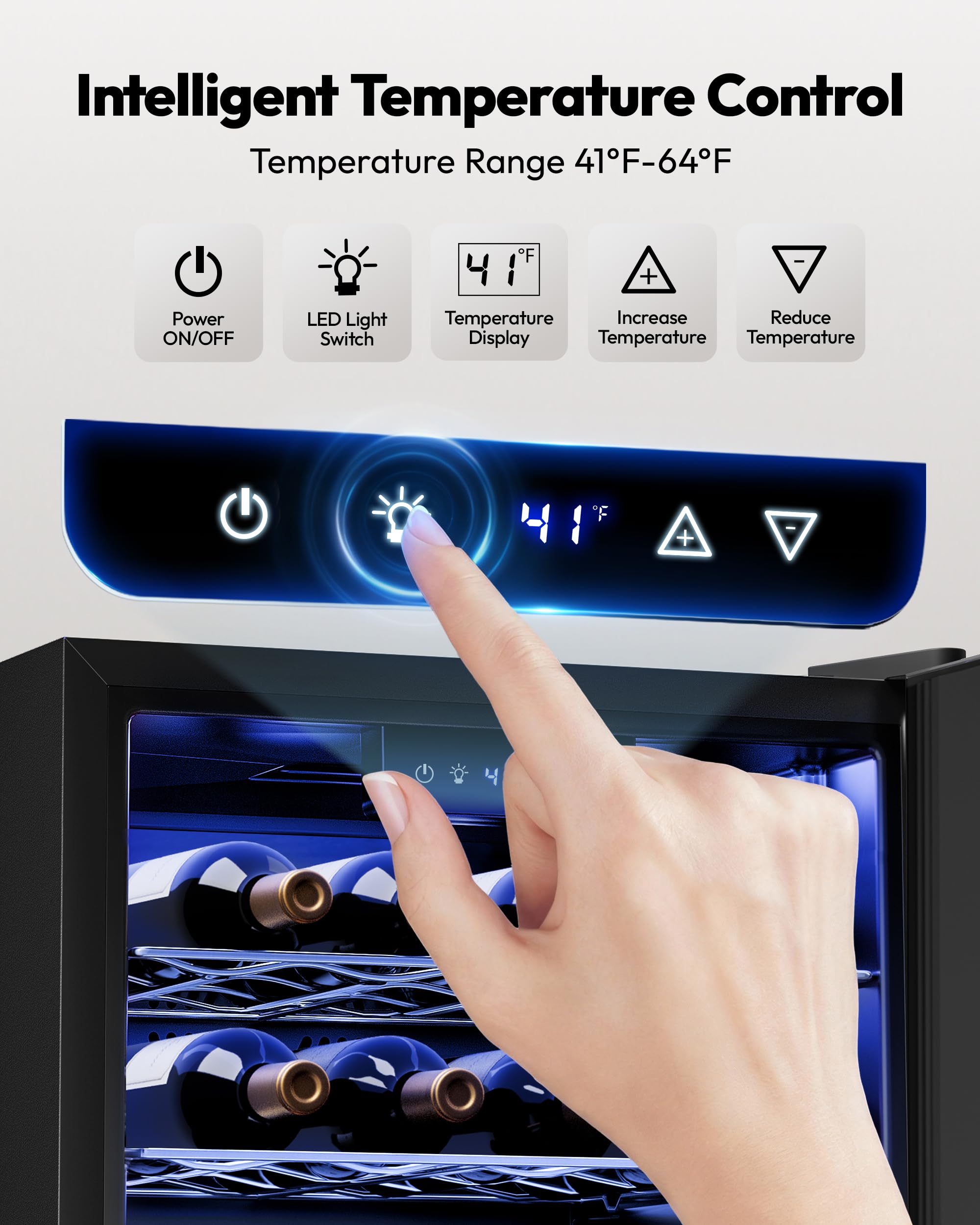 【Powerful Compressor & Precise Temperature Control】This wine fridge is built with a high-performance compressor, engineered for vibration-free quietness and consistent cooling power. This wine cooler offers precise temperature control from 41°F to 64°F, giving you the flexibility to precisely adjust every degree of temperature for all your Reds, Whites, and Champagnes.