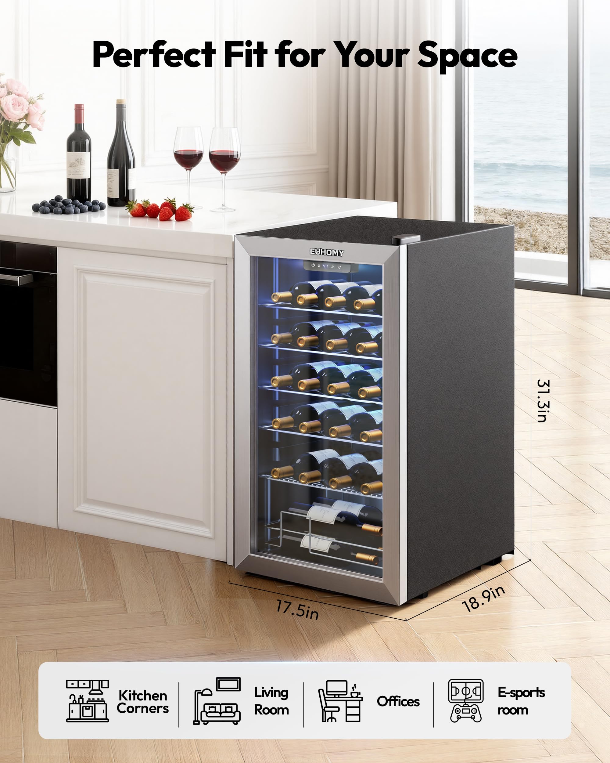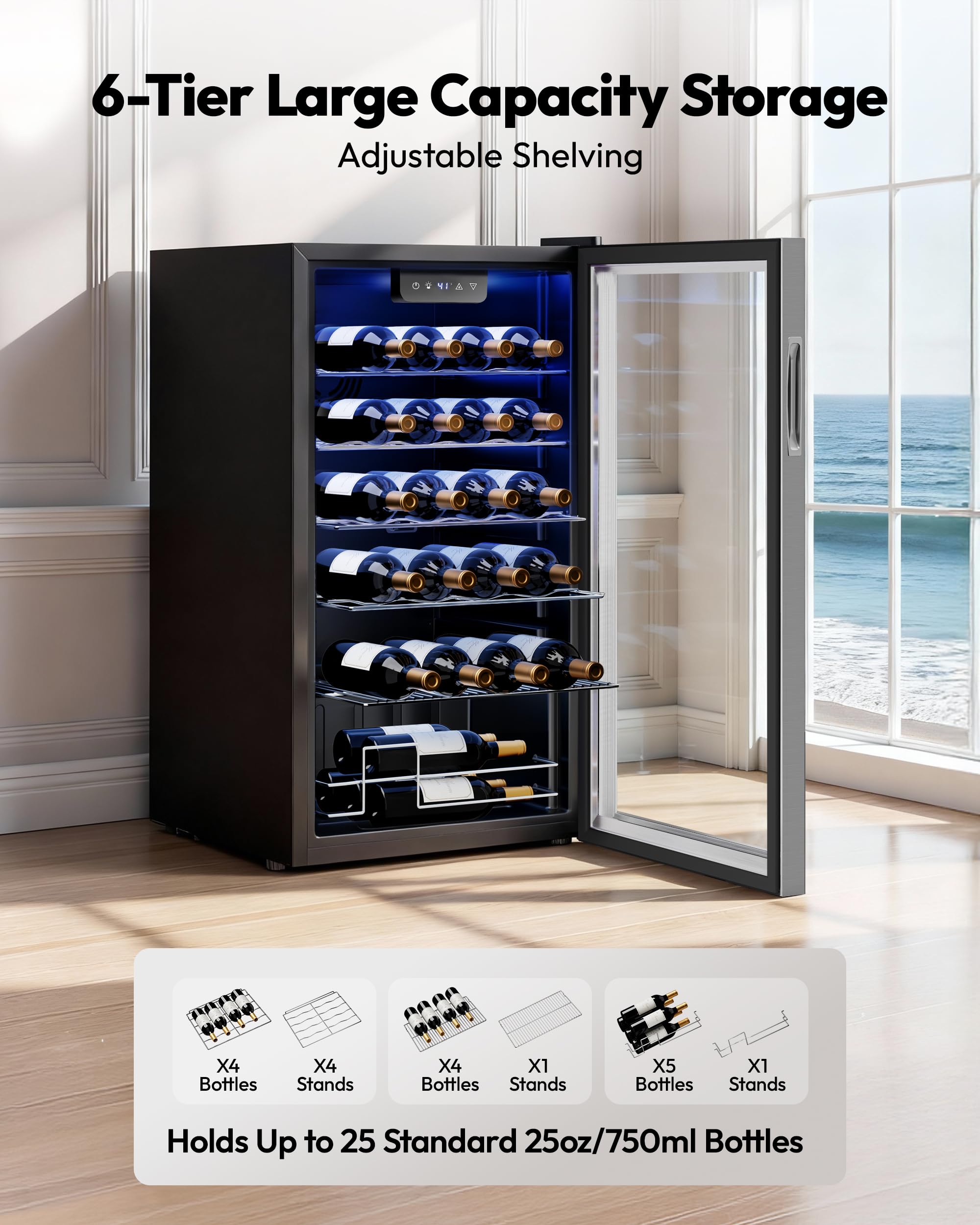 【Spacious & Adaptable for 25 Bottles】Our wine cooler refrigerator's compact size (18.7"D x 17.5"W x 31.3"H) and sleek stainless steel frame, gives you a stylish and modern design better for your living room kitchen, or office. This wine refrigerator is designed with 4 chrome full-width wine racks, 1 full-width flat shelf and bottom compartment, letting you rearrange and store your entire 25-bottle collection.