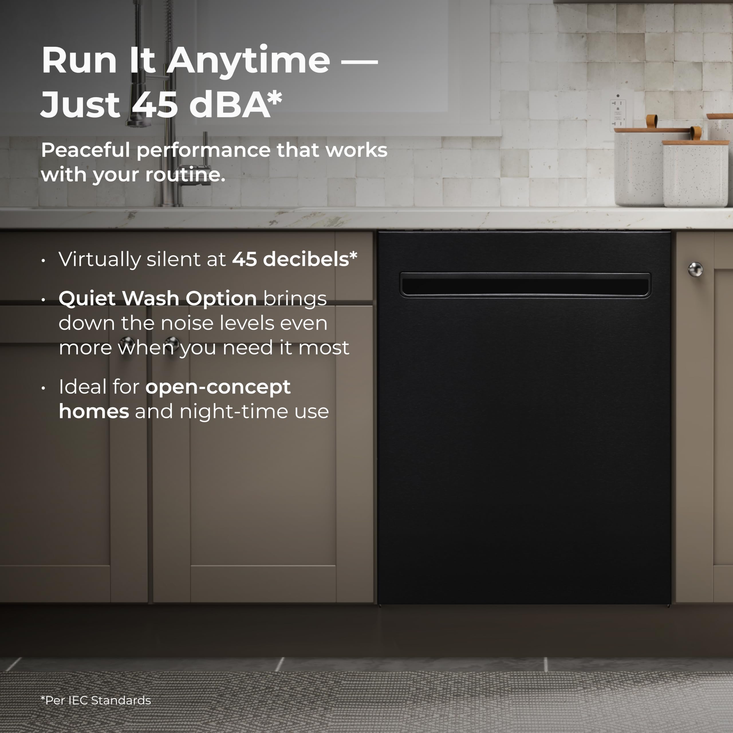 Whisper-Quiet Wash + Smart Features: This dishwasher runs at just 45 dBA, with a QuietWash option for a whisper quiet cycle. LED floor light shows when it's running, and smooth top-mounted controls add a modern, streamlined touch
