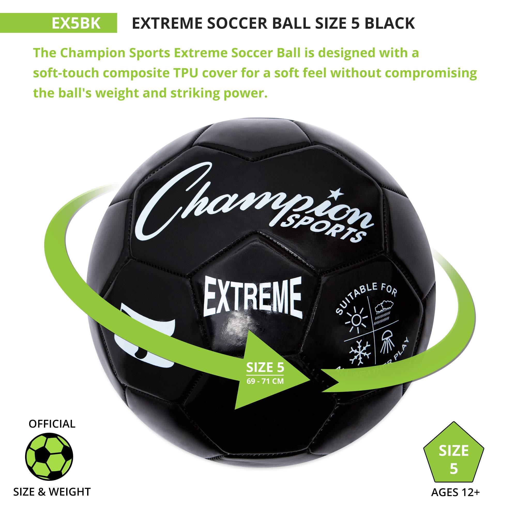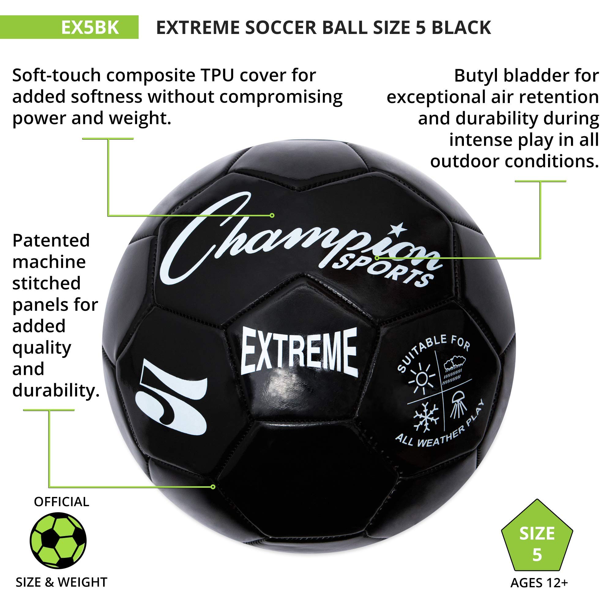 The Champion Sports Extreme Soccer Ball is a Durable, All-Weather Ball for Competition & Training. Built for both competitive matches and casual play, the Champion Sports Extreme Soccer Ball is designed to perform in any weather. Its soft-touch TPU cover provides a comfortable feel for dribbling, passing, and striking, while maintaining the weight and power needed for accurate shots. Engineered for durability, this high-quality soccer ball features a butyl bladder for superior air retention and machine-stitched panels for long-lasting performance. Whether you're playing in the heat, cold, wind, or rain, this ball maintains its shape and reliability. Available in three sizes: EX3 (Size 3): Ages 8 & under, EX4 (Size 4): Ages 8 to 12, and EX5 (Size 5 β Official Size): Ages 12 & up. Choose from a variety of vibrant colors, including Red, Orange, Yellow, Green, Blue, Purple, Black, Silver, and Pink. Note: Ball ships deflated. Pump sold separately.