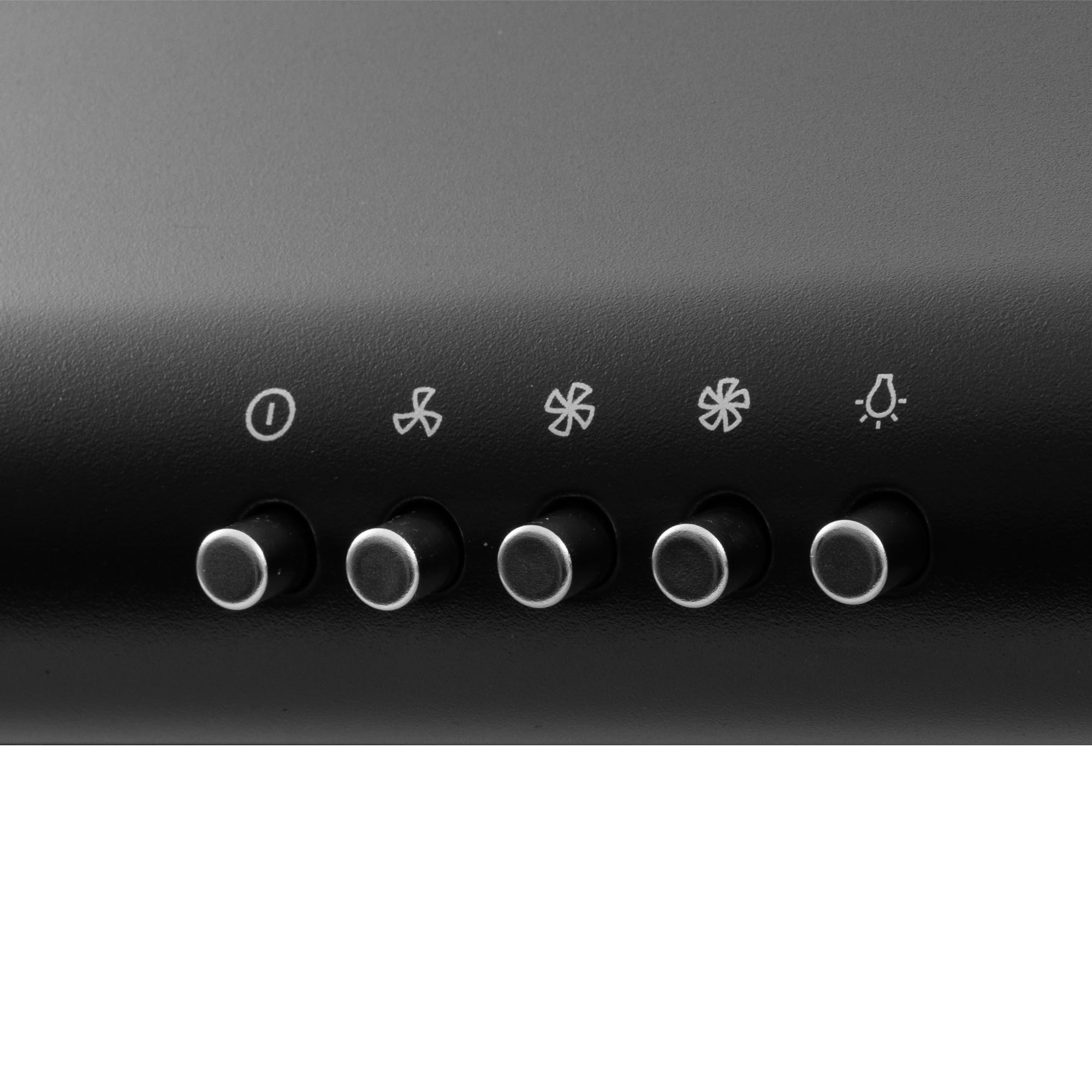 PUSH BUTTON CONTROLS: Range hood equipped with push button control panel to manage multiple functions, including fan speed, lights and power