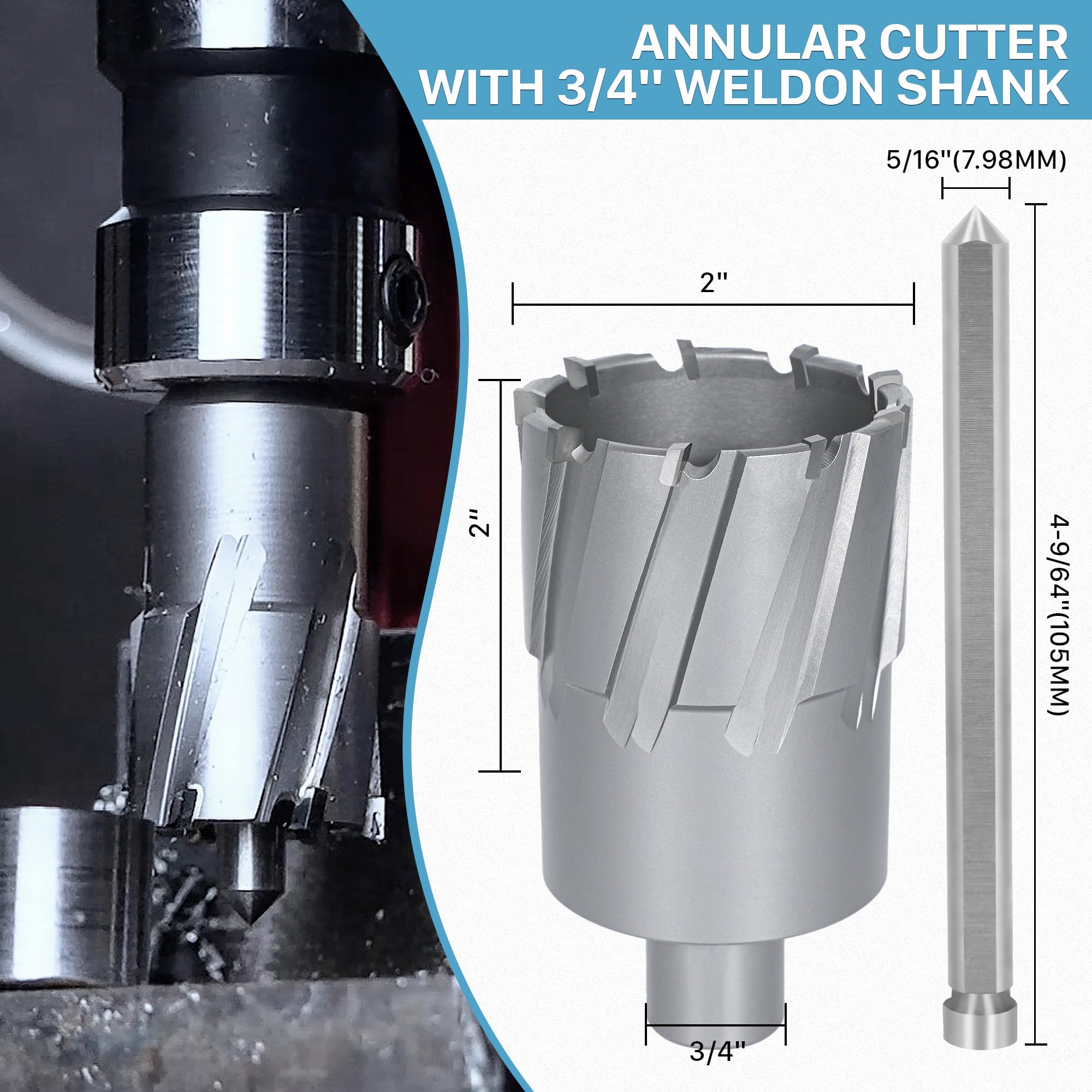 【Specifications】 - KEENTECH Annular Cutter features a premium carbide cutting edge for outstanding durability, making it ideal for drilling harder materials like stainless steel. It offers a 2" cutting diameter and a 2" cutting depth, and comes with a free pilot pin. The 3/4" weldon shank design is compatible with various magnetic drills, including but not limited to Alfra, Evolution, Dewalt, Vevor, Zelcan and Hougen.