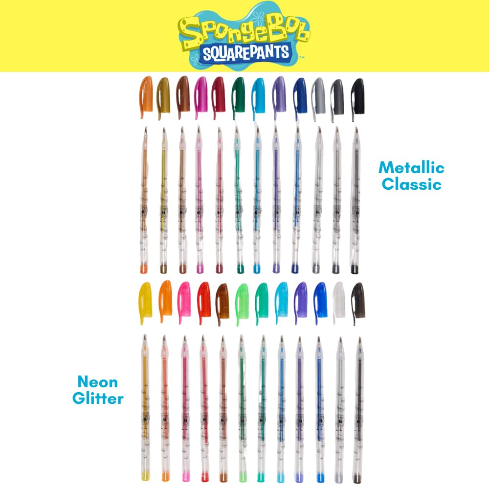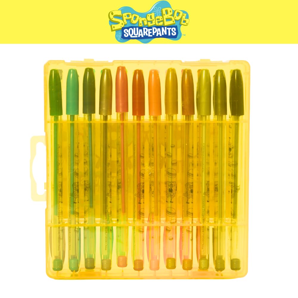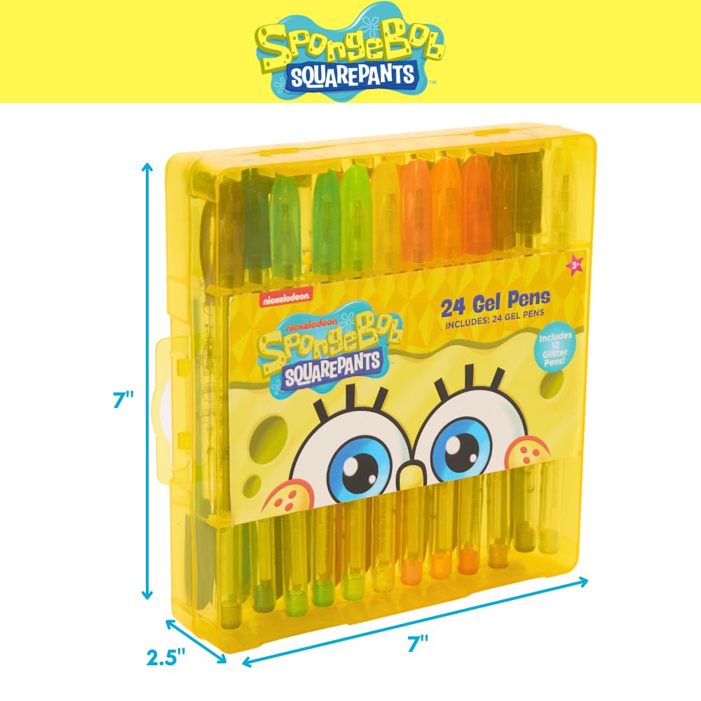 The Nickelodeon SpongeBob SquarePants Gel Pen Set for Kids is a 24-pack of fun and vibrant gel pens featuring the beloved underwater characters. The set includes 12 colored glitter gel pens and 12 regular and metallic gel pens in a rainbow of colors, each with a removable cap. The pens are stored in a durable yellow plastic case with snap closures and individual slots for easy storage, travel, and organization. With smooth, vivid ink, these fine tip pens are perfect for coloring, drawing, and writing on various papers, sketch pads, and coloring books. Ideal for kids ages 3 and up, this set makes a great birthday gift, stocking stuffer, or back-to-school present for any SpongeBob fan, adding a splash of fun to their creative activities.