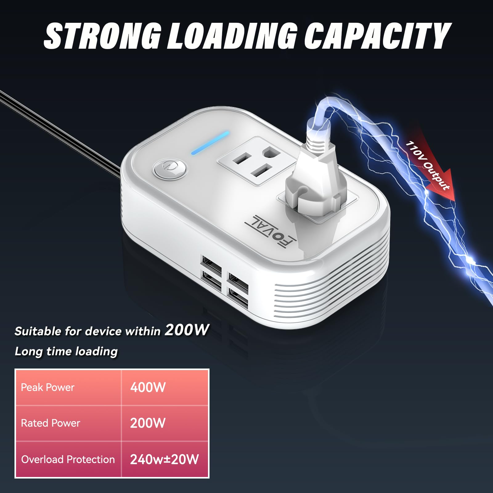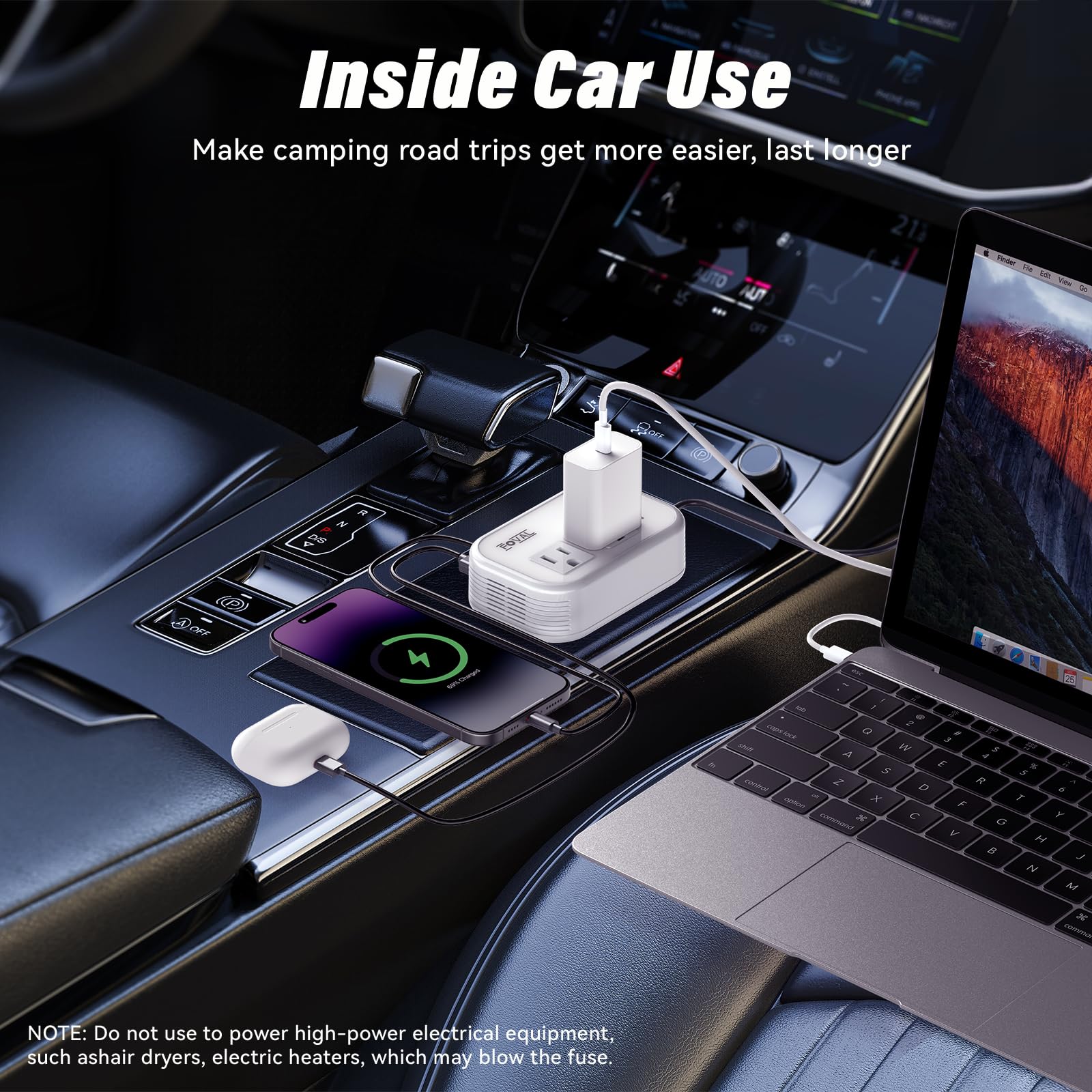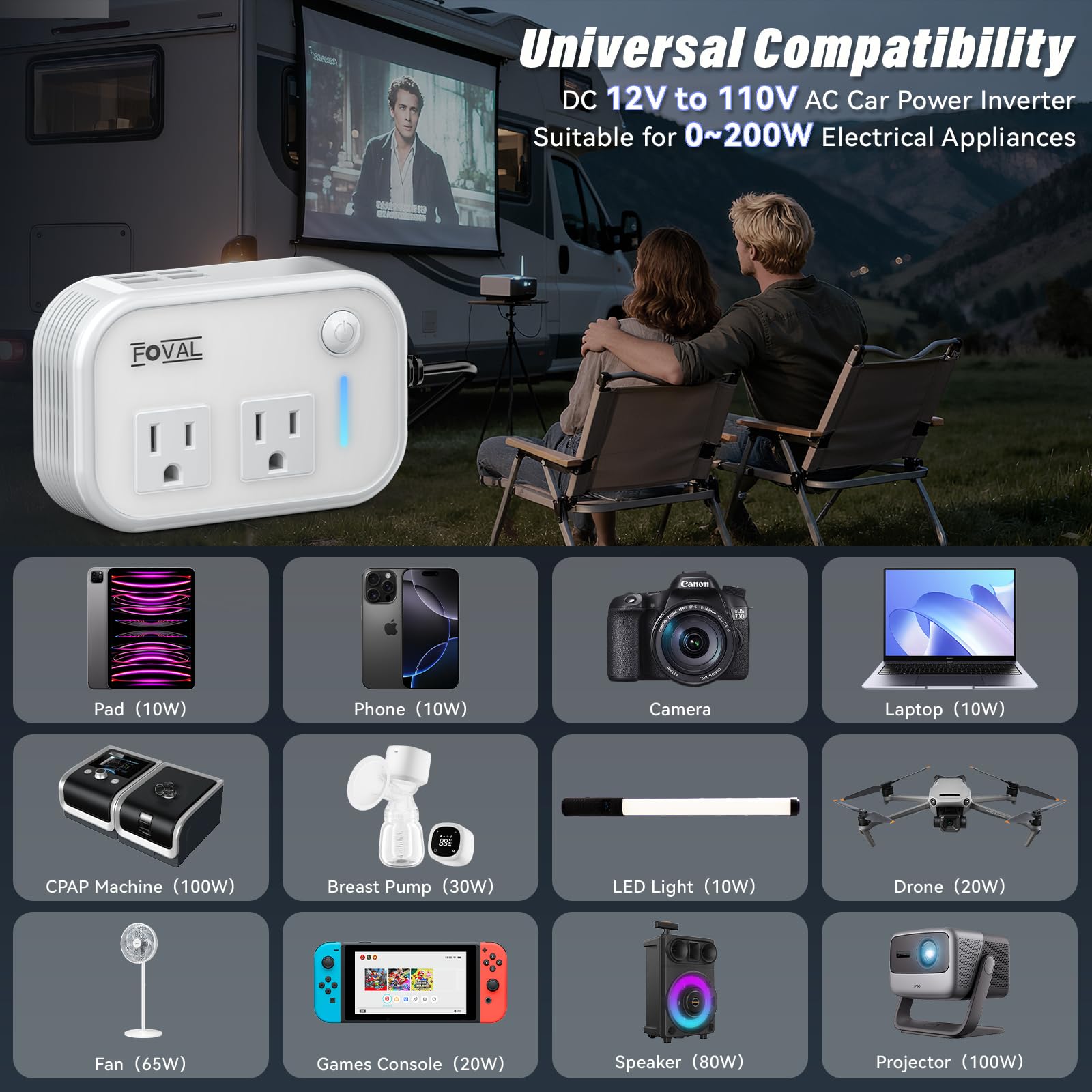 【200W CAR POWER INVERTER】Car power converter featured with 2 X US standard AC sockets 4 X USB charging ports, DC 12V to AC 110V converter provides power up to 180W great for charging laptop, tablets, cell phone, Christmas gift,string lights, breast pump, CPAP machine, nebulizer, game console, kindle, TV, DVD players, lights, iPad, and other electronic devices.