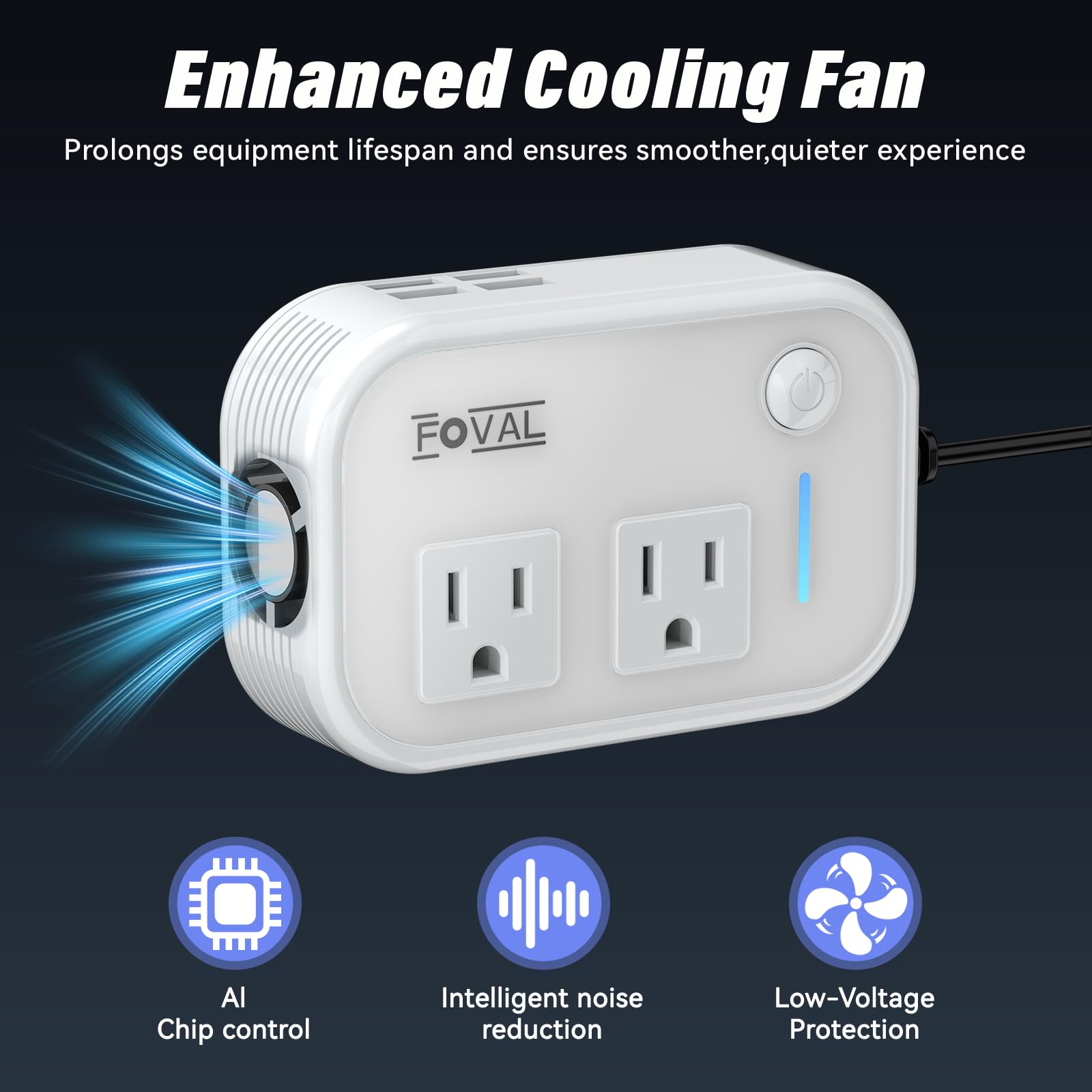 【MULTI-PROTECTION & SMART COOLING FAN】 Built-in multi-protection system provides full-protection with short-circuit , low-voltage, over-charge, over-voltage, over-load, over temperature protection, built-in fuse. Smart cooling fan makes the car power inverter silent when operating, and it runs faster when it gets warmer.