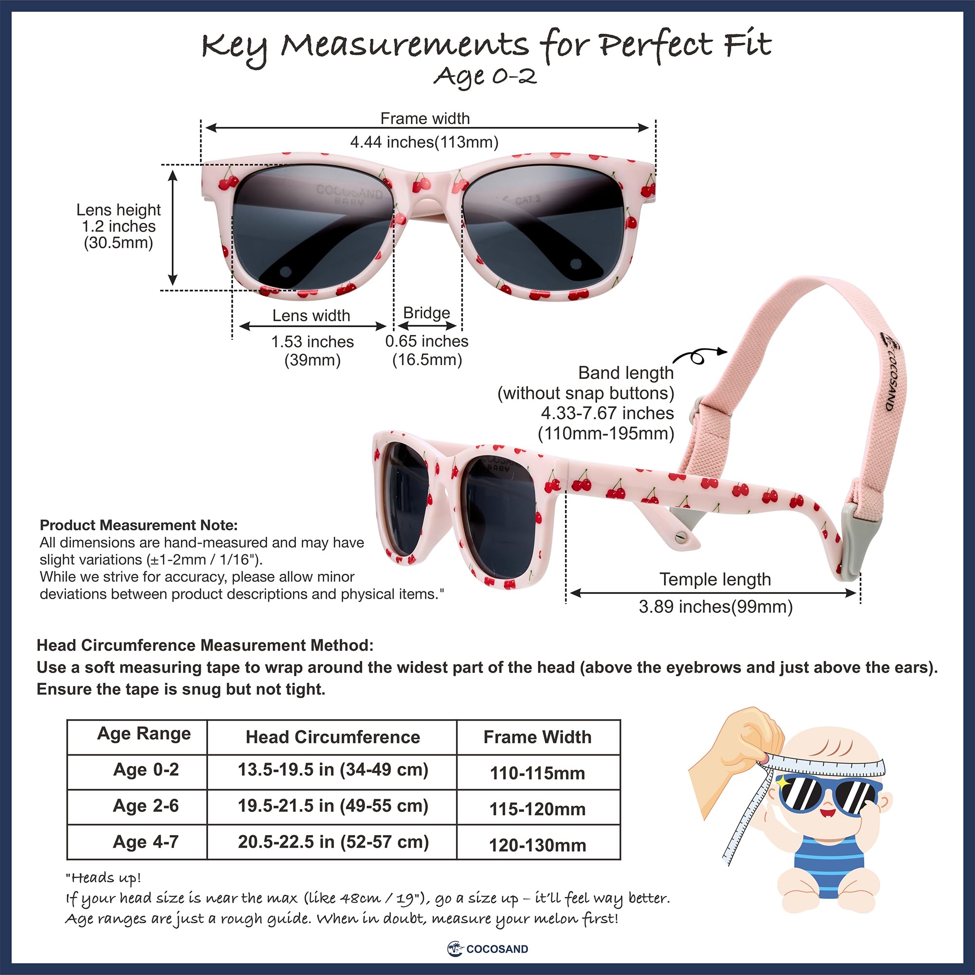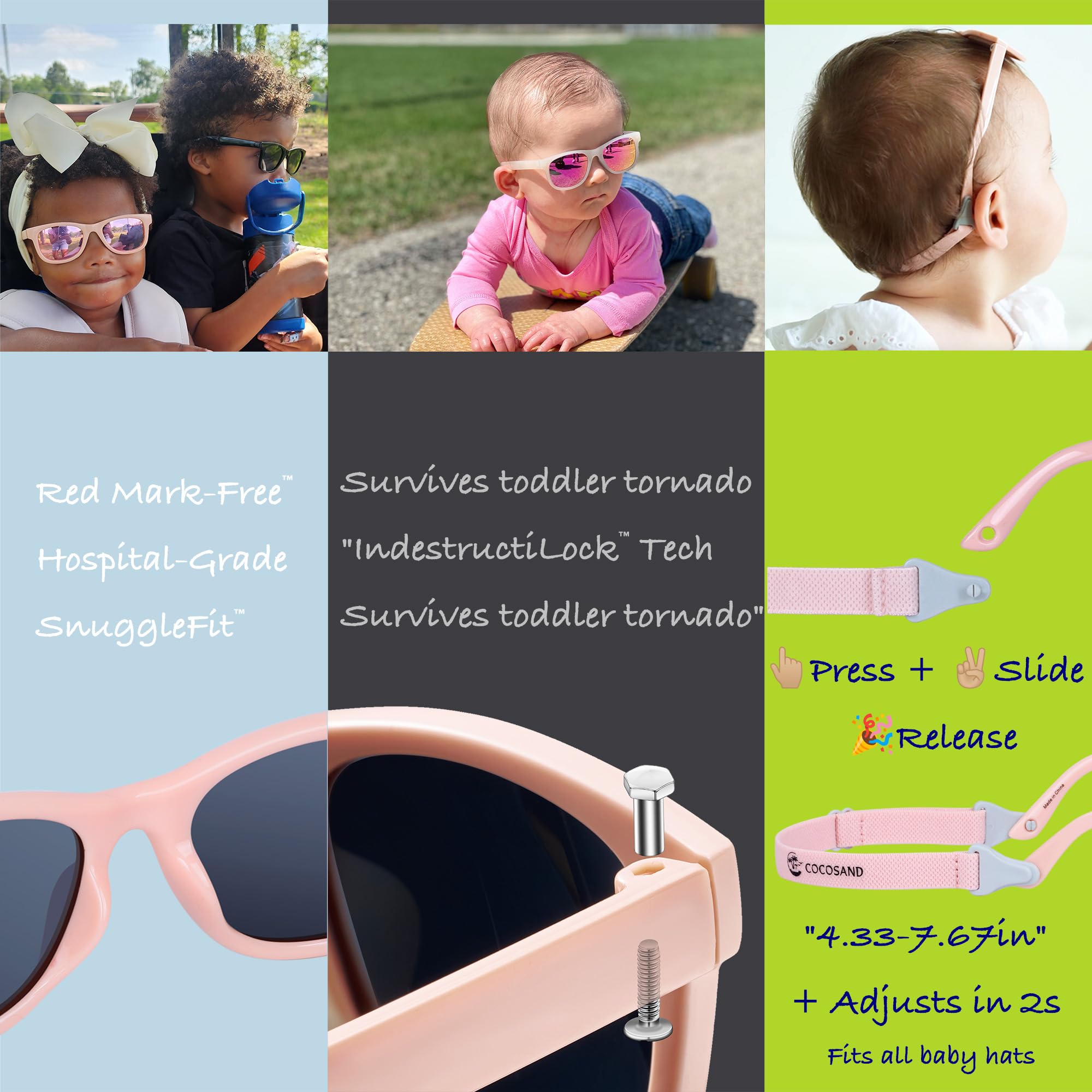 【Perfect Fit for Growing Babies】:Our infant sunglasses fit babies with head circumferences up to 48cm. The adjustable temple and 110 - 195mm strap mean a custom fit for every stage. Whether your baby boy or baby girl is growing fast, these sunglasses grow with them
