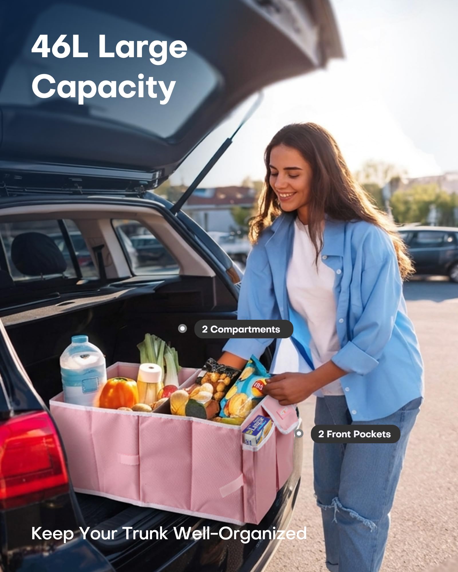 SPACIOUS STORAGE: With 2 large compartments and 6 extra mesh pockets, this car trunk organizer provides ample space to neatly store groceries, tools, sports equipment, and more. Keep your car trunk clutter-free and organized on every trip.