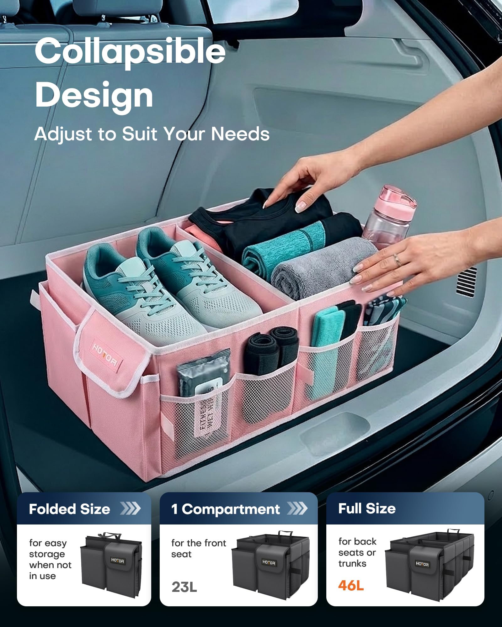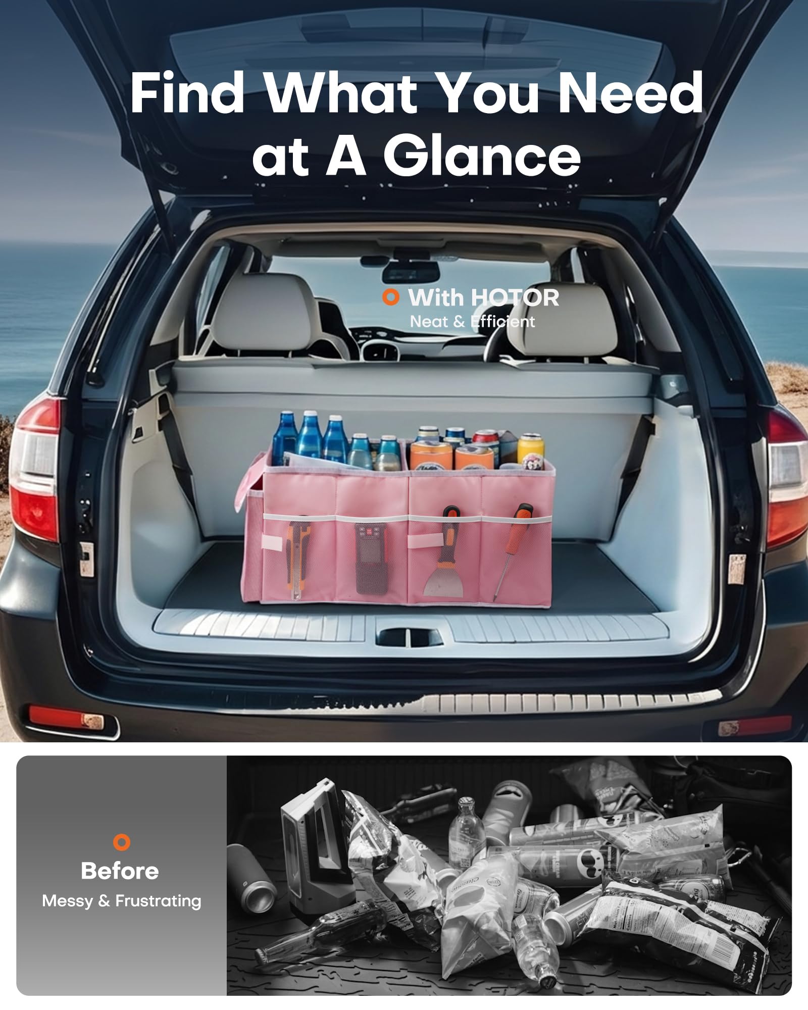 CONVENIENT ACCESS: HOTOR car trunk organizer for SUV is equipped with 2 compartments and 6 stretchy mesh pockets to make items easy to see and grab when needed. No more digging around a messy trunk to find what you need. Just grab and go.