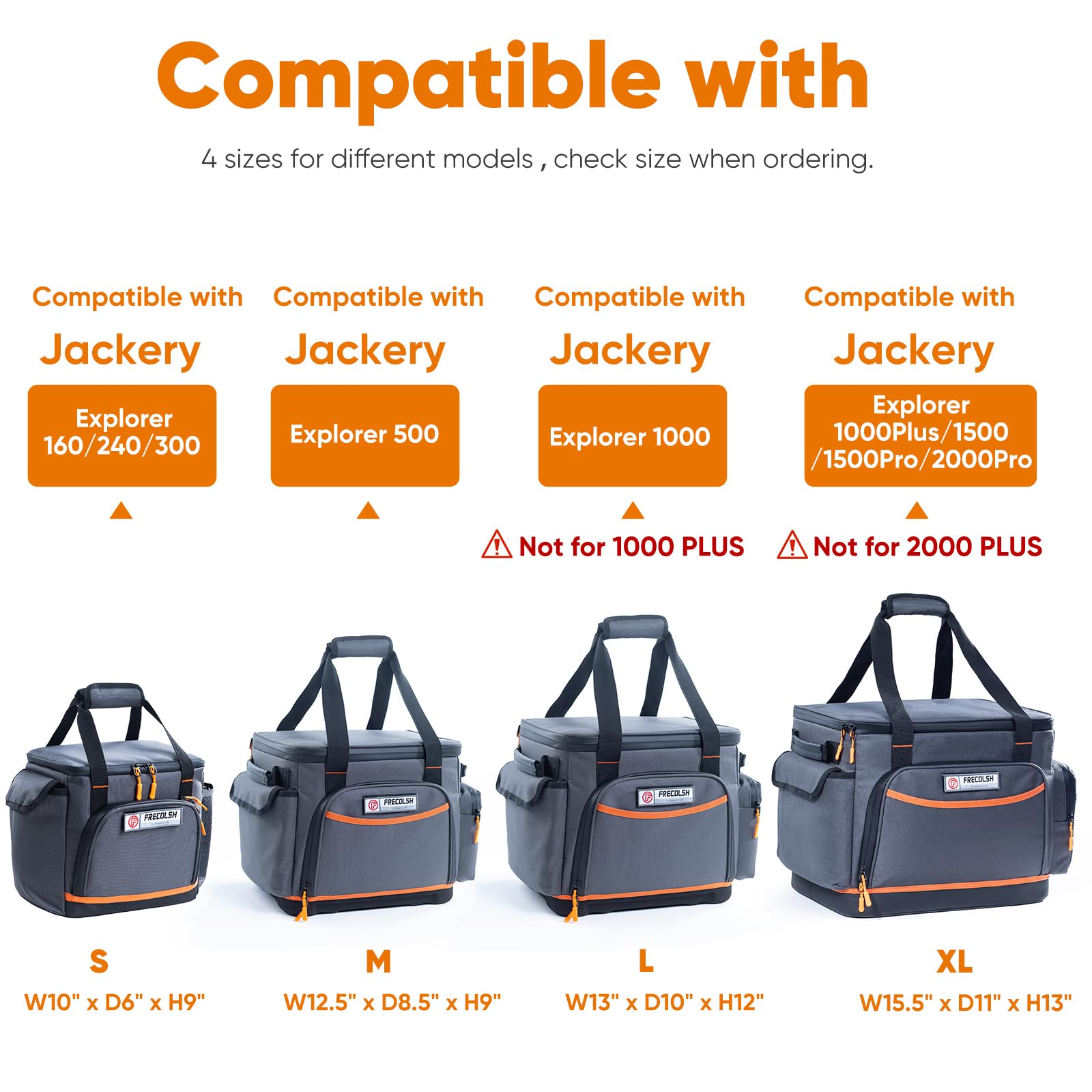 【COMPATIABLE WITH】4 sizes for different models of Jackery outdoor generator. SMALL: LW10" x D6" x H9" Compatible with Jackery Explorer 300/160/240; MEDIUM: W12.5" x D8.5" x H9" Compatible with Jackery 500; LARGE: W13" x D10" x H12" compatible with Jackery Explorer 1000(NOTE FOR 1000 PLUS); EXTRA LARGE size of the stoarge bag is W15.5" x D11" x H13" compatible withJackery Explorer 1000 Plus, 1500,1500 PRO,2000 PRO(NO FOR 2000 PLUS) ; Please check size when ordering.