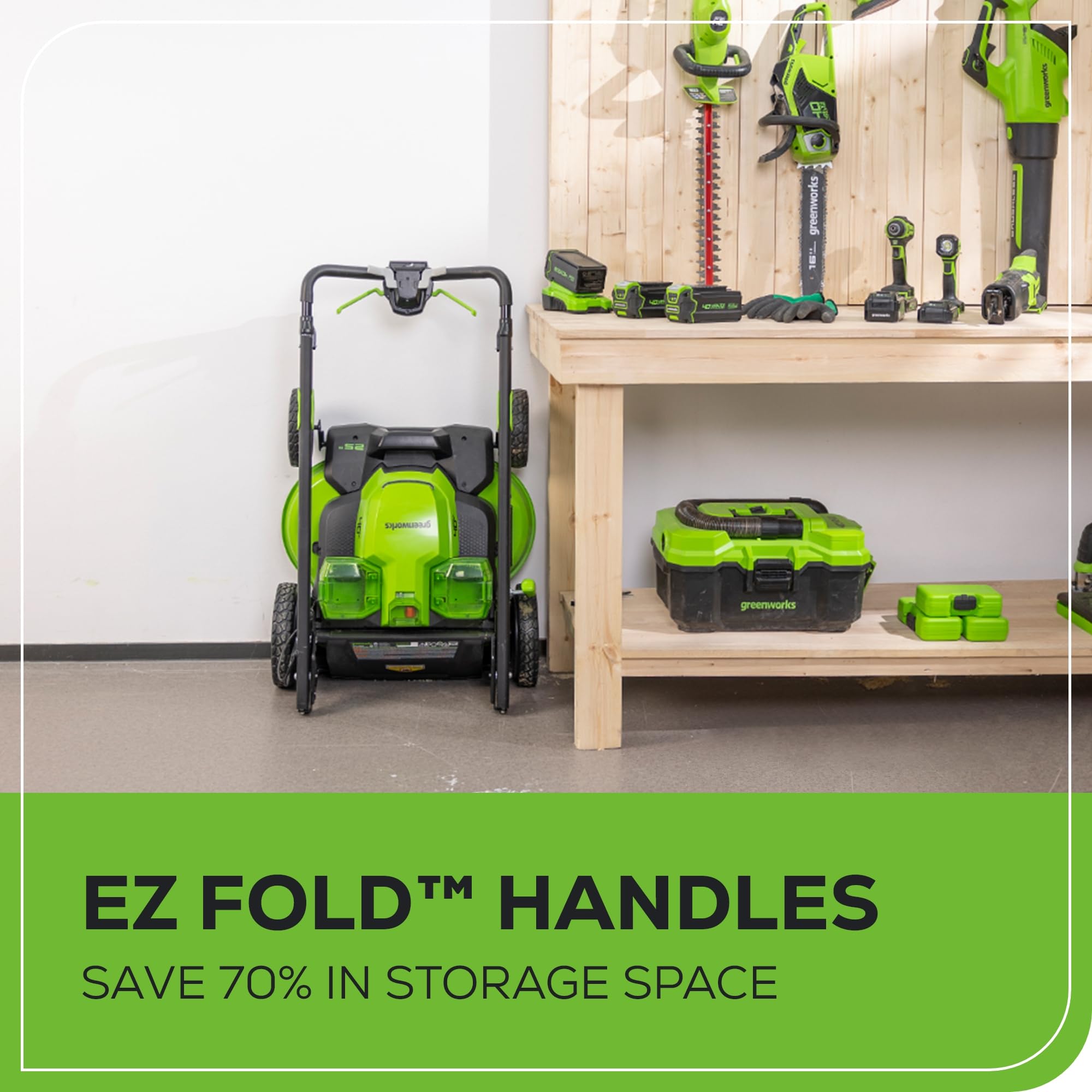 MAINTENANCE FREE – This self-propelled lawn mower is virtually maintenance free, with no gas, no oil, and no emissions. Push button start, quiet operation, and delivers gas-like performance. Use up to 70% less space in your garage with vertical storage.