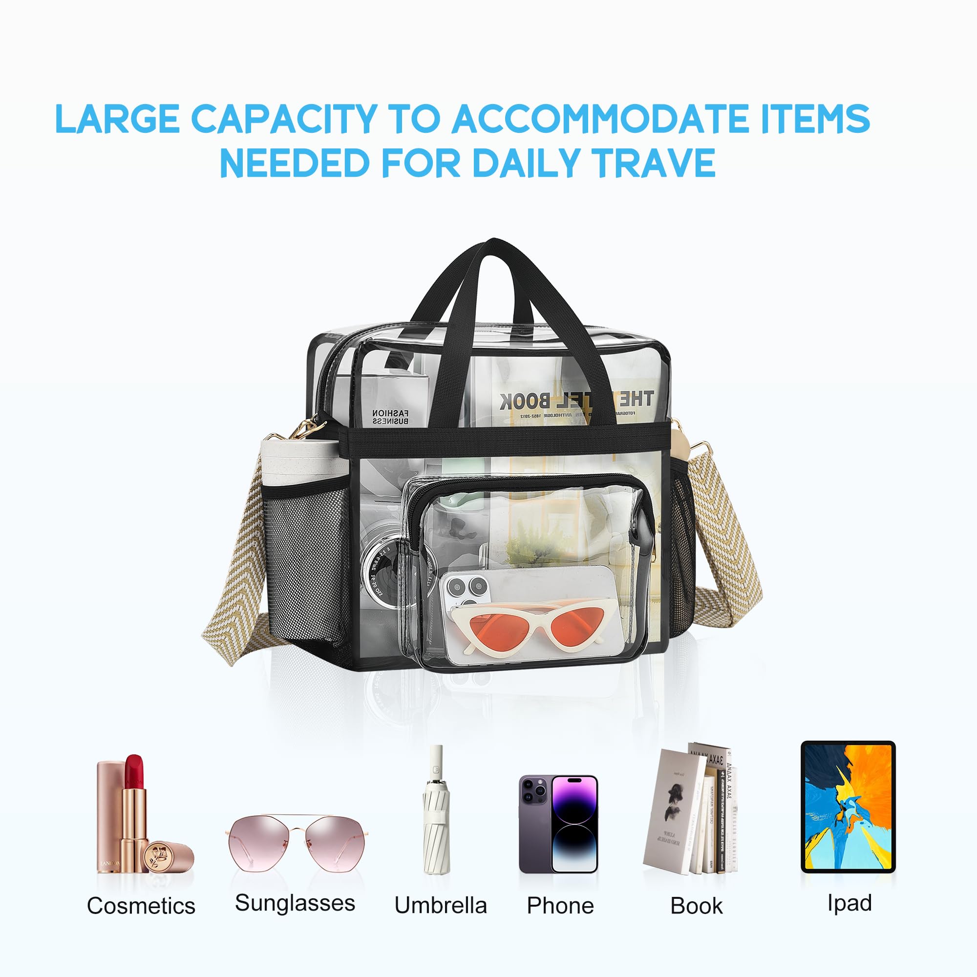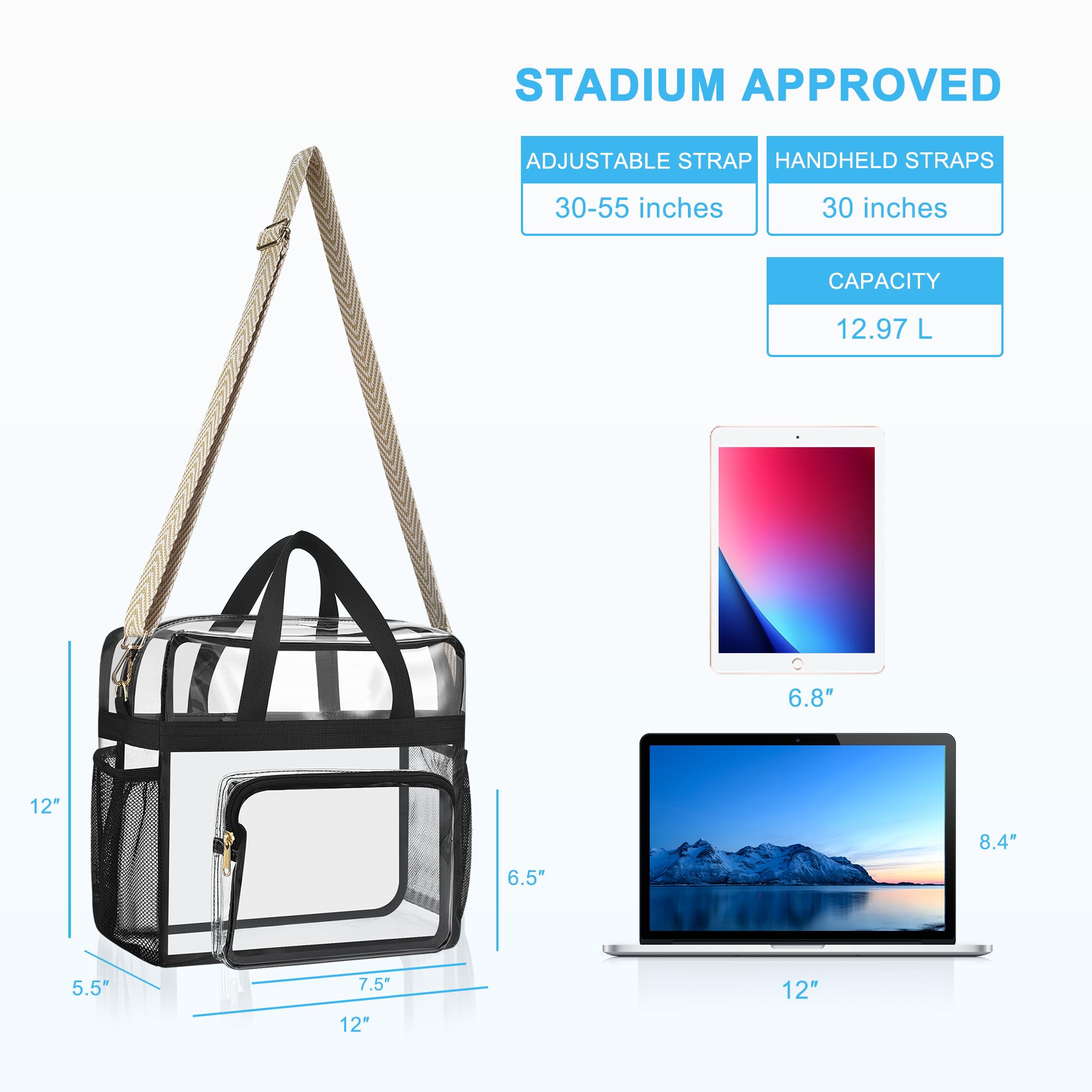 【Fitted Size】The clear bag for stadium events has a main compartment(12"x 5.5"x12"). Big enough for carry-on items like cellphone or camera. The front pocket (7.5"x6.5") and 2 mesh pockets are handy to store your essentials or drinks.