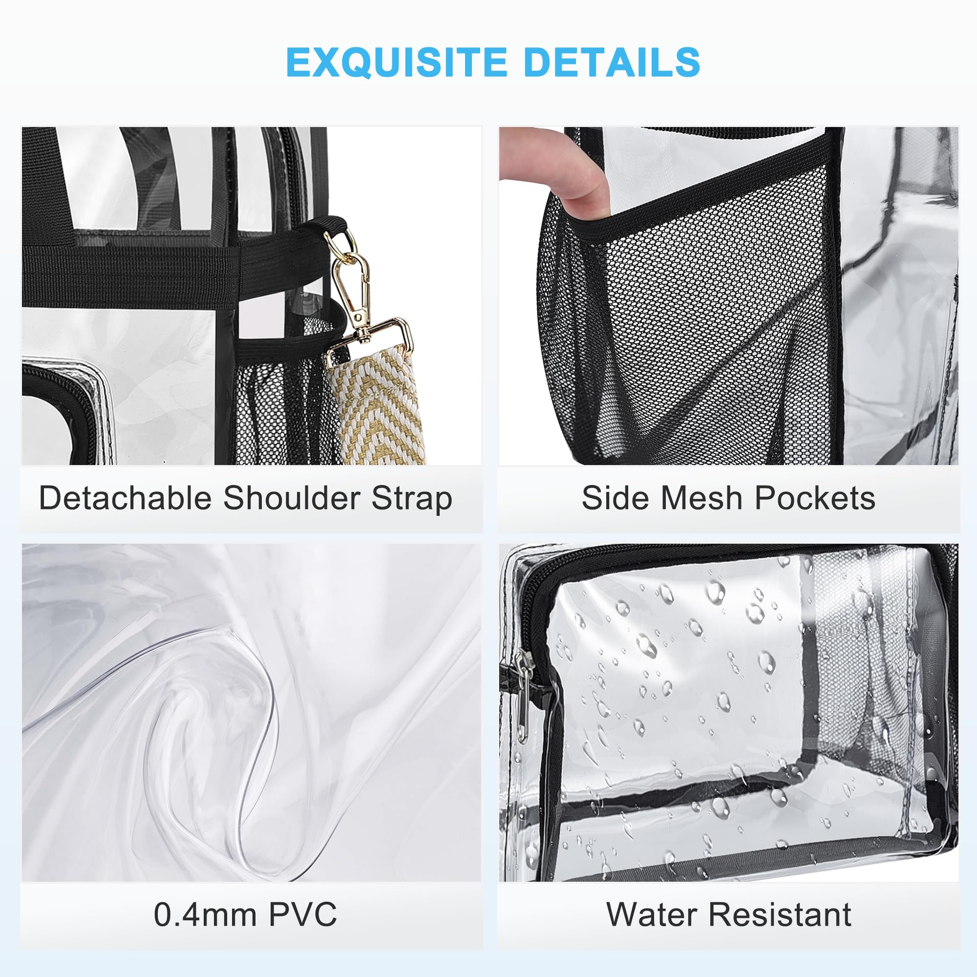 【Water Resistant】The PVC material makes this clear bag water-resistant. No more worries of a sudden rain or splashing water. Easy to be cleaned for next use.