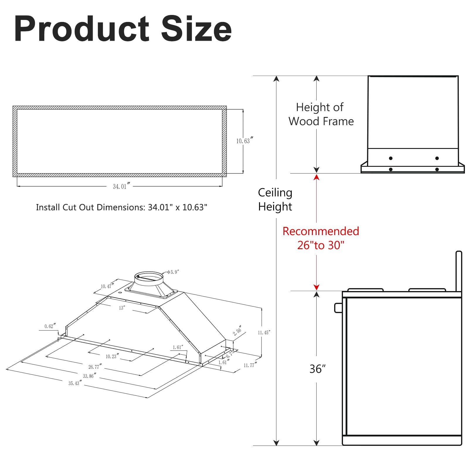 【Suction Powerful Range Hood】Made of stainless steel, high strength and durability. 900CFM large airflow.36inch built-in/Insert Range Hood is suitable for various cooking methods, easily and effectively remove a large amount of smoke and cooking smell in the air.