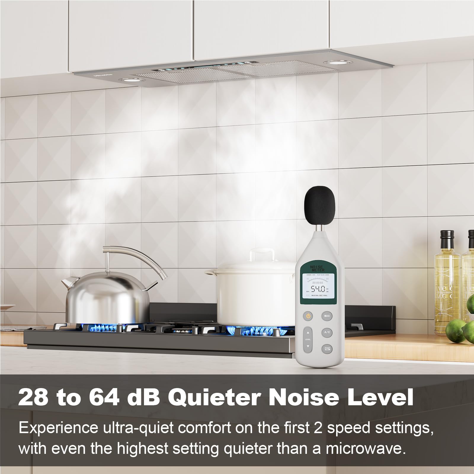 【ULTRA-SILENT OPERATION】This range hood insert has benefited from multi-dimensional noise reduction technology,It is equipped with high standard and powerful suction,quiet and comfortable for human ears at the same time.The noise of weak grade is as low as 35dB and you can enjoy music while cooking.