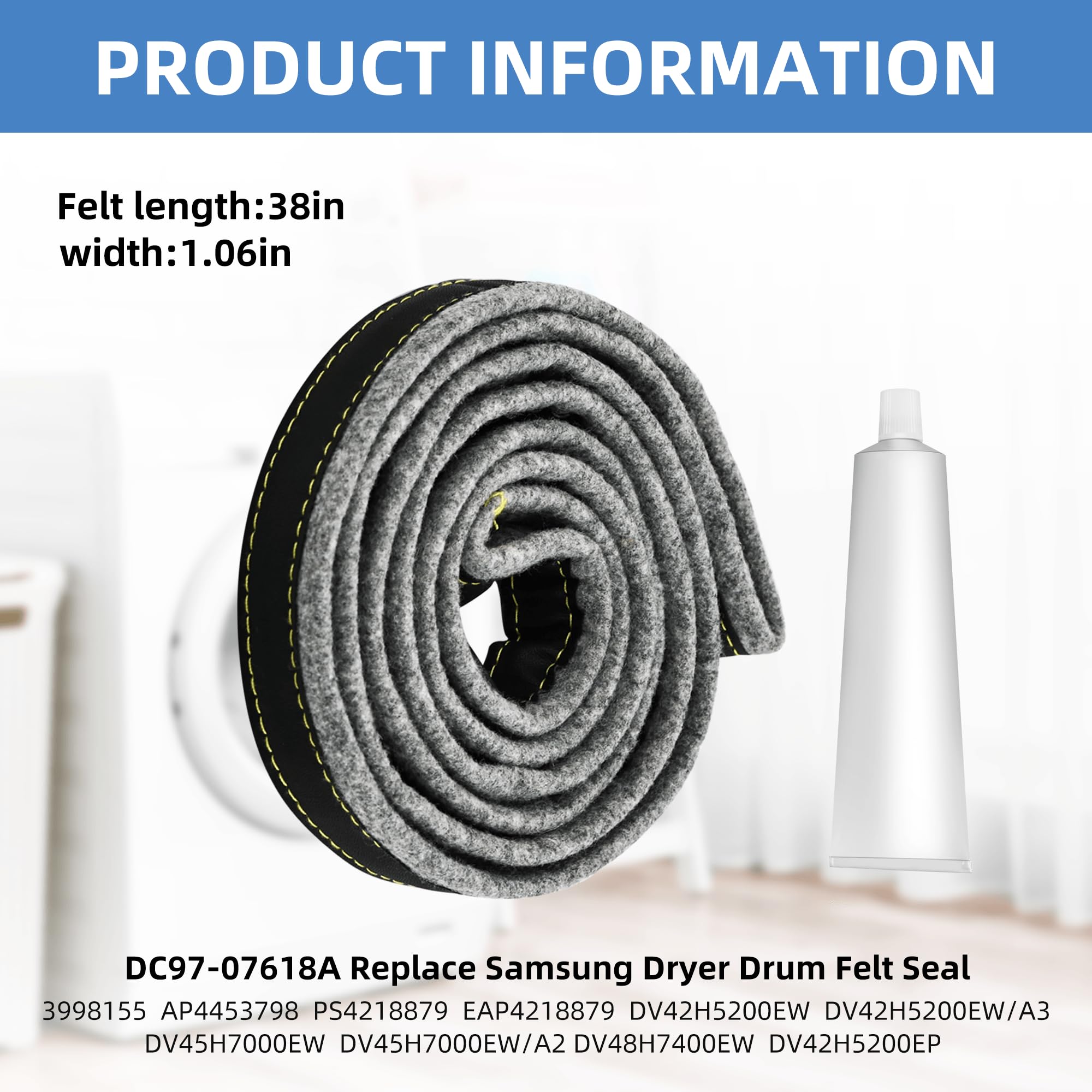 【Easy to install】: Our DC97-07618A dryer felt drum seal for Samsung dryer parts is easy to install and can be done in 20 minutes. Please remove the old adhesive before install the new DC97-07618A. When installing, please note that the end of the gasket needs to be stretched to fit. After that, you can prepare clips or pins to fix the gasket to enhance its adhesion and wait for some time to make it more stable. You can also view the installation instructions on YouTube.