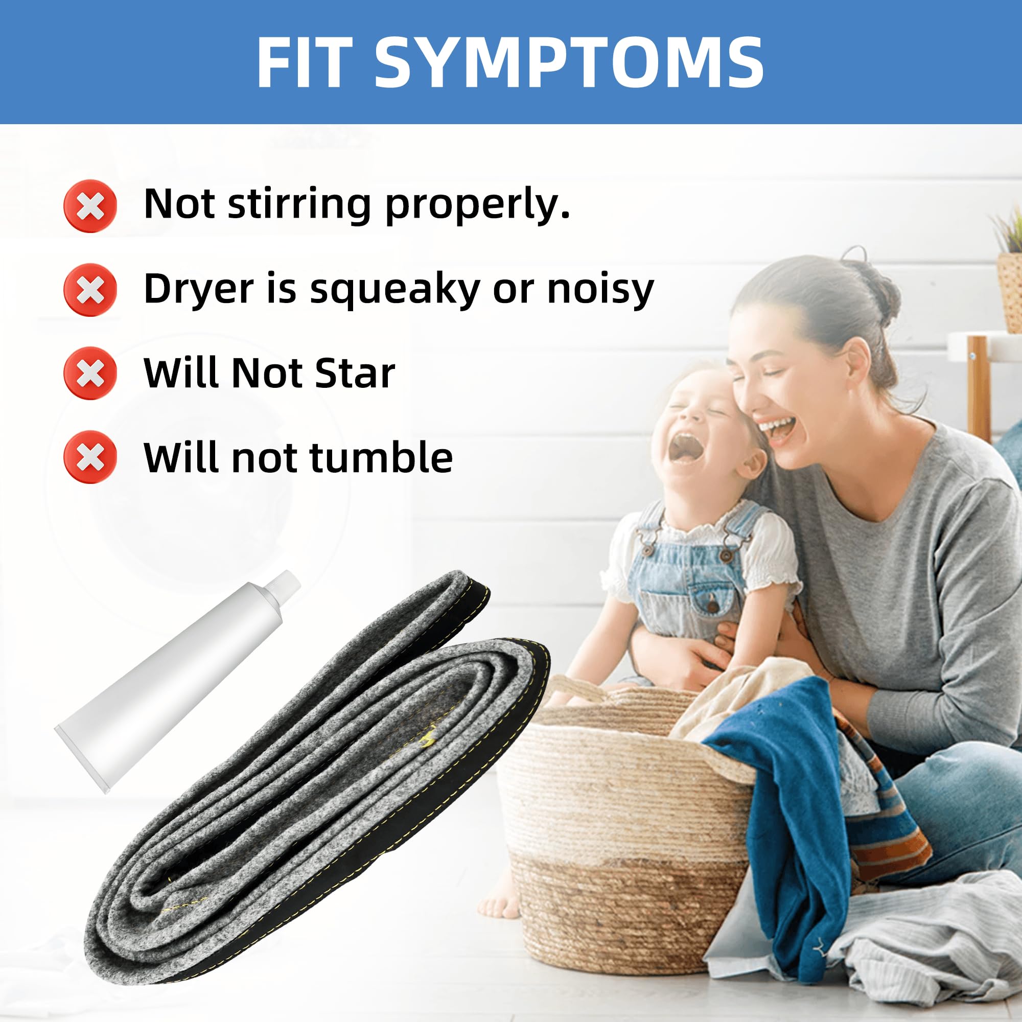 【Fit Symptoms】:Our Upgraded DC97-07618A Dryer Drum Felt Seal Compatible with Samsung dryer felt seal replacement help you to solve the following problems:1.Not stirring properly. 2.Dryer is squeaky or noisy. 3.Will Not Start. 4.Will not tumble 5.Takes too long to dry. This felt seal kit meets or exceeds the oem standard and has been tested in the factory. It perfectly matches the original dryer and can be installed directly.