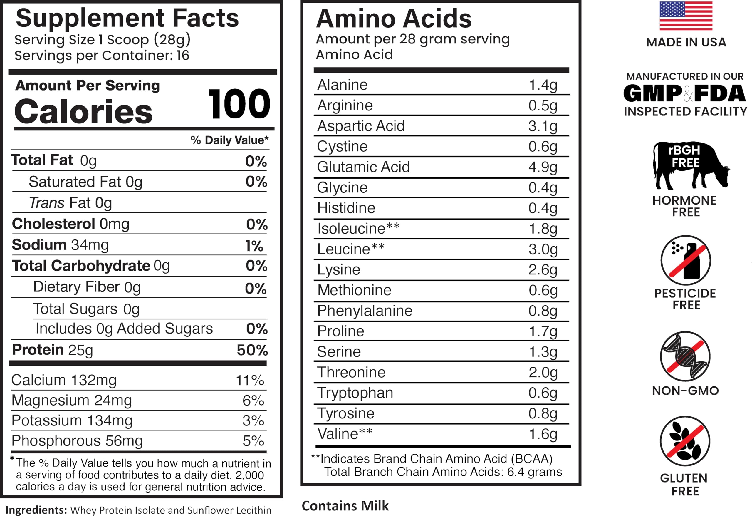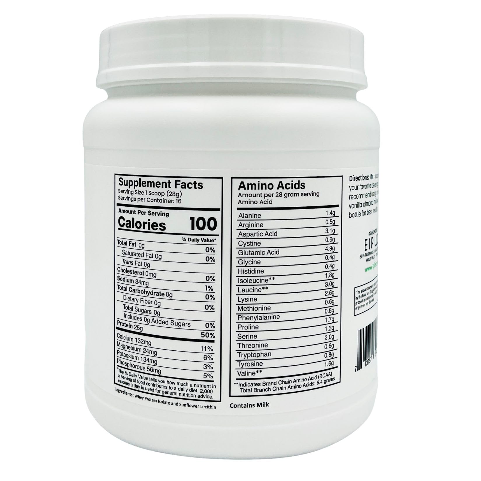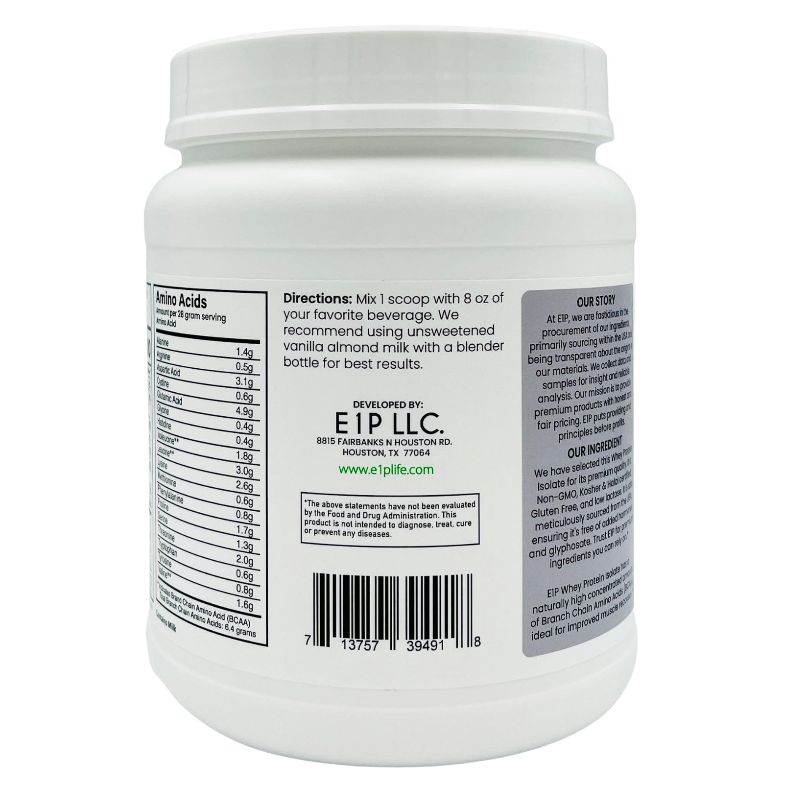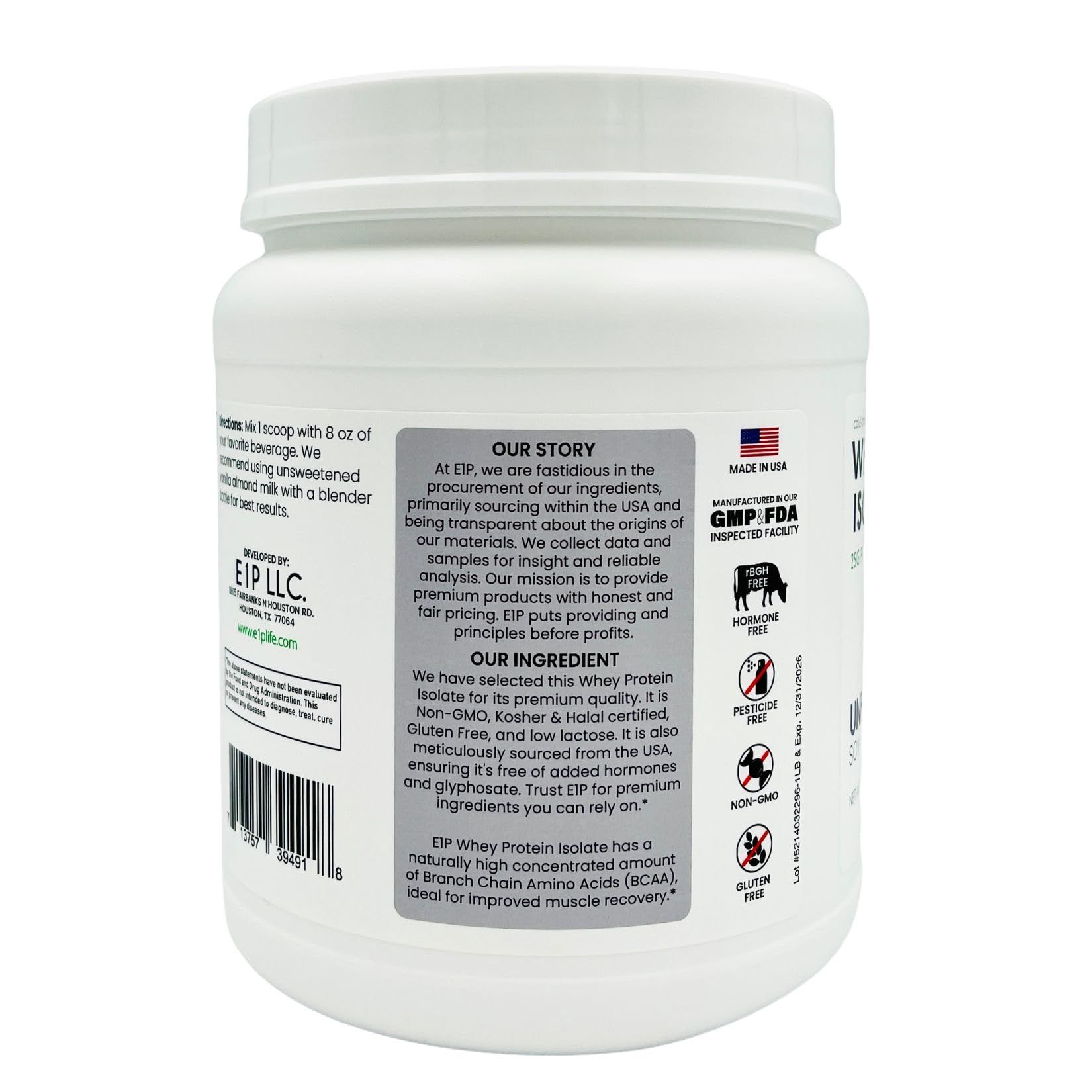 HIGHEST QUALITY AND VALUE: E1P Whey Protein Isolate is Unflavored, made with Certified Kosher & Halal ingredients, NON-GMO, rBGH / rBST (growth hormone) FREE, Glyphosate FREE, pesticide FREE, Gluten FREE and Paleo Friendly. Our goal is 100% customer satisfaction through quality. Each container has 16 servings - composed of 100% Whey Protein Isolate.