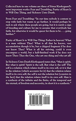 Collected here in one volume are three of Sören Kierkegaard's most important works: Fear and Trembling, Purity of Heart Is to Will One Thing, and Sickness Unto Death. Fear and Trembling: In our time nobody is content to stop with faith but wants to go further. It would perhaps be rash to ask where these people are going, but it is surely a sign of breeding and culture for me to assume that everybody has faith, for otherwise it would be queer for them to be . . . going further. In those old days it was different, then faith was a task for a whole lifetime, because it was assumed that dexterity in faith is not acquired in a few days or weeks. When the tried oldster drew near to his last hour, having fought the good fight and kept the faith, his heart was still young enough not to have forgotten that fear and trembling which chastened the youth, which the man indeed held in check, but which no man quite outgrows. . . except as he might succeed at the earliest opportunity in going further. Where these revered figures arrived, that is the point where everybody in our day begins to go further. Purity of Heart Is to Will One Thing: Father in heaven! What is a man without Thee! What is all that he knows, vast accumulation though it be, but a chipped fragment if he does not know Thee! What is all his striving, could it even encompass a world, but a half-finished work if he does not know Thee: Thee the One, who art one thing and who art all! Sickness Unto Death: Man is spirit. But what is spirit? Spirit is the self. But what is the self? The self is a relation which relates itself to its own self, or it is that in the relation [which accounts for it] that the relation relates itself to its own self; the self is not the relation but [consists in the fact] that the relation relates itself to its own self. Man is a synthesis of the infinite and the finite, of the temporal and the eternal, of freedom and necessity, in short it is a synthesis.