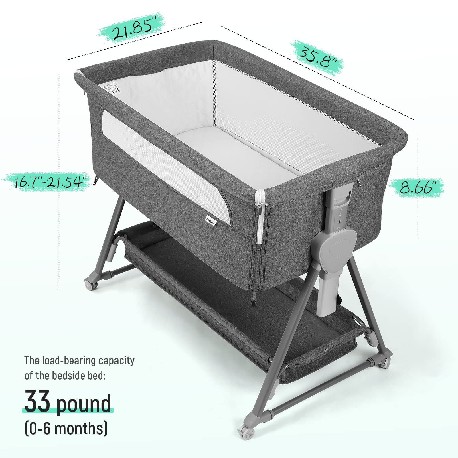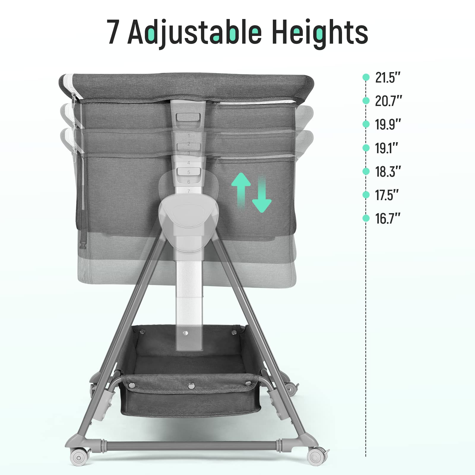【7-Level Height Adjustment】Unlike standard 3-level or 4-level baby bassinet, Cowiewie offers 7 adjustable heights (16.7" to21.54"), precisely matching any bed height. The retractable side with a secure zipper ensures easy access, especially for nighttime feedings or post-C-section moms.
