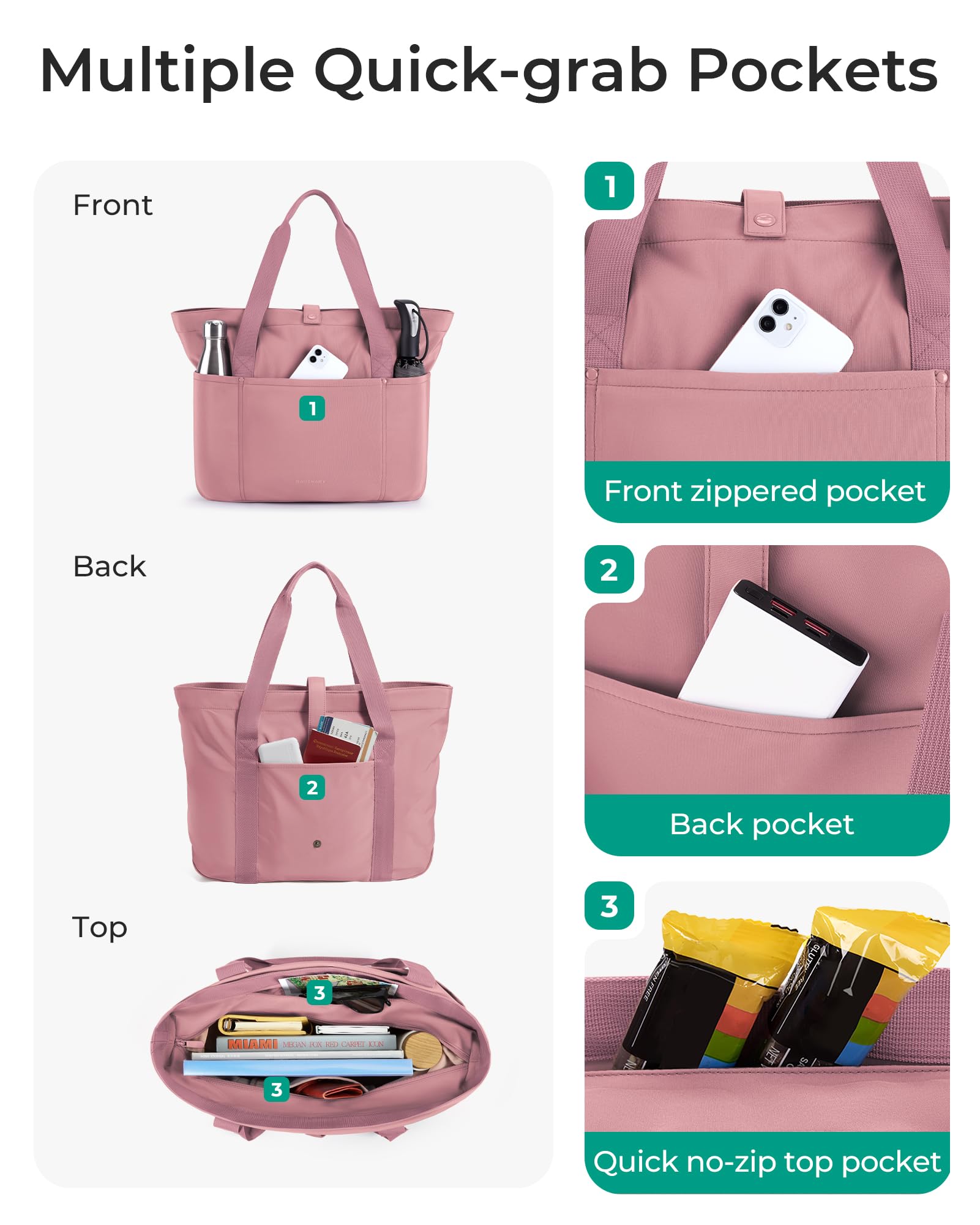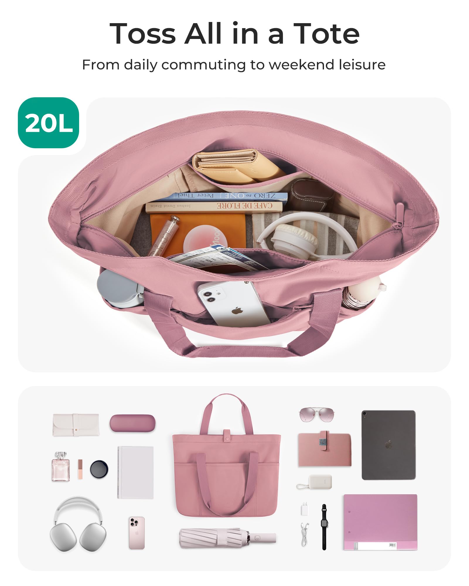Roomy Space-Capacity 20L,The women tote bag feasures 6 separate pockets; Main zipper compartment can easily hold A4 folder, clothes, etc. 2 Outer handy pockts+ 1 front zippered pocket+1 slip pocket+ 1 back pocket allow you quick access the items you need.