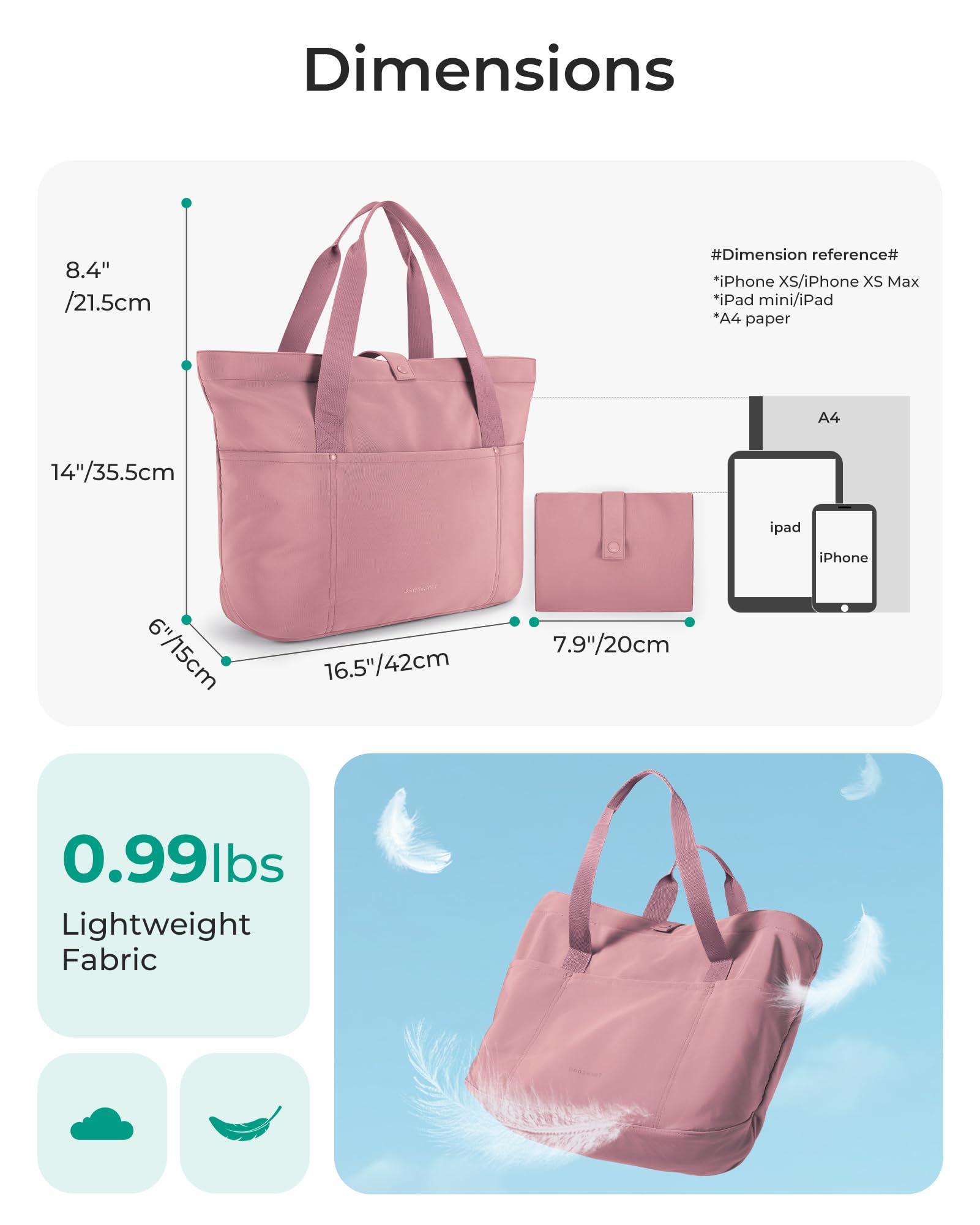 Large Size and Foldable-Unfolded: 16.5''L x 6''Wx 14''H, Folded: 7.9'' x 7''; This large tote bag has a huge capacity and can hold A4 books and 15.6-inch laptops. The travel tote bag can be folded into a small pouch, easy to put into your backpack, travel bag, duffle bag or suitcase, save your space.