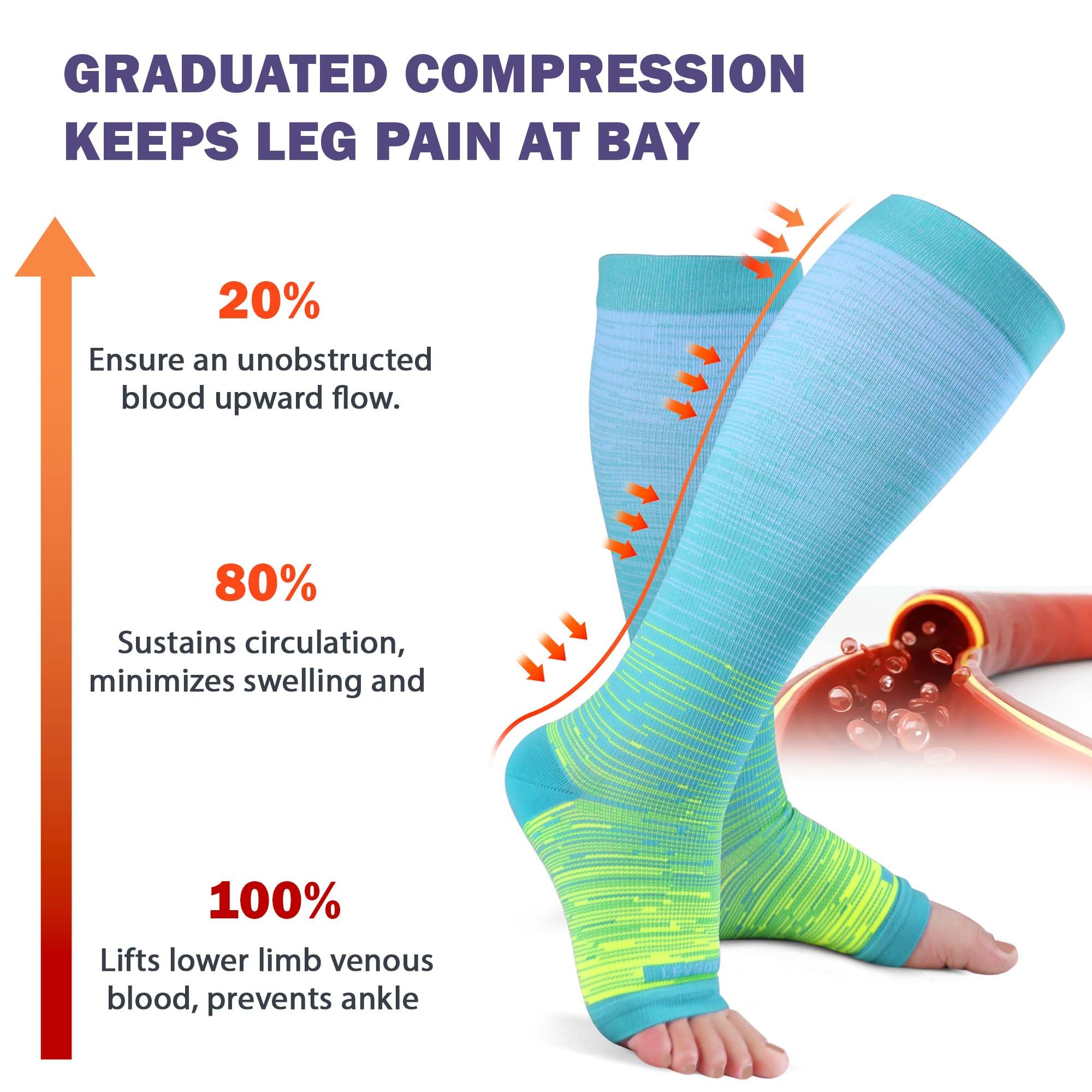 Open Toe Compression Socks: Womens compression socks have an open-toe design for enhanced breathability and a flexible fit. They offer graduated pressure of 20-30mmHg, providing targeted support to ankles, calves and feet. Wear them discreetly under any footwear and experience the remarkable difference in your leg health and well-being