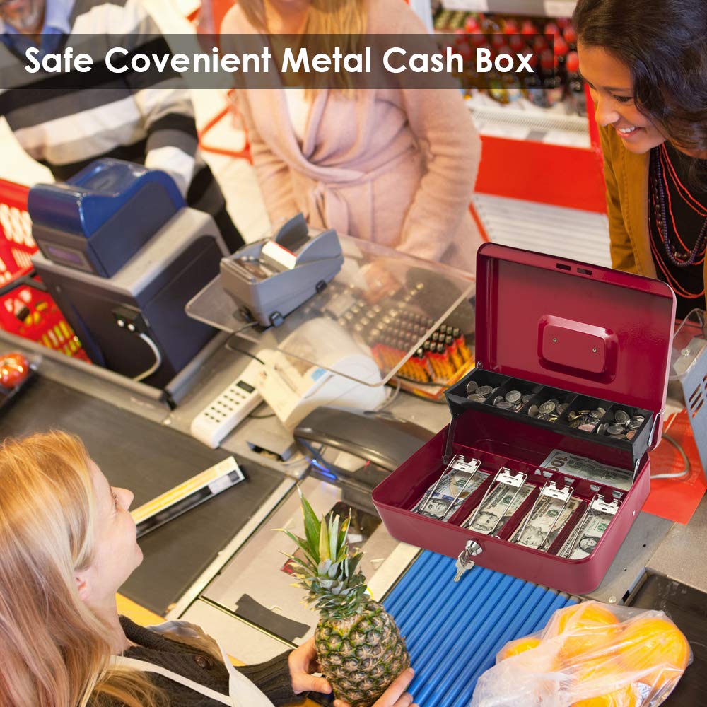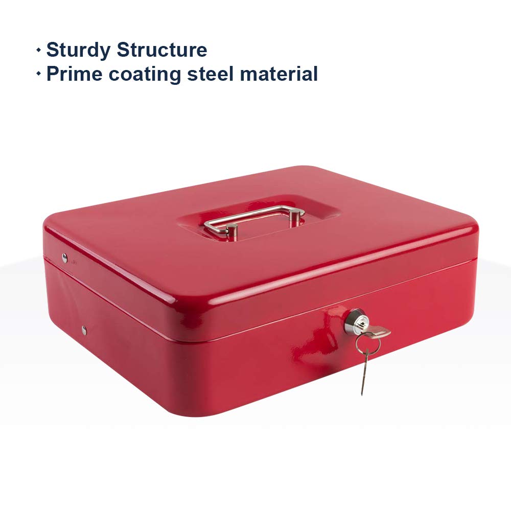 PETTY CASH BOX: This lock boxes is constructed of durable steel which is solidly built and won't simply burst open if dropped.For indoor and outdoor use. Such as School, Supermarket, Storage Lockers, Cabinets, Family, Yard Sale and so on. Suitable to store bills, coins, checks and receipts.
